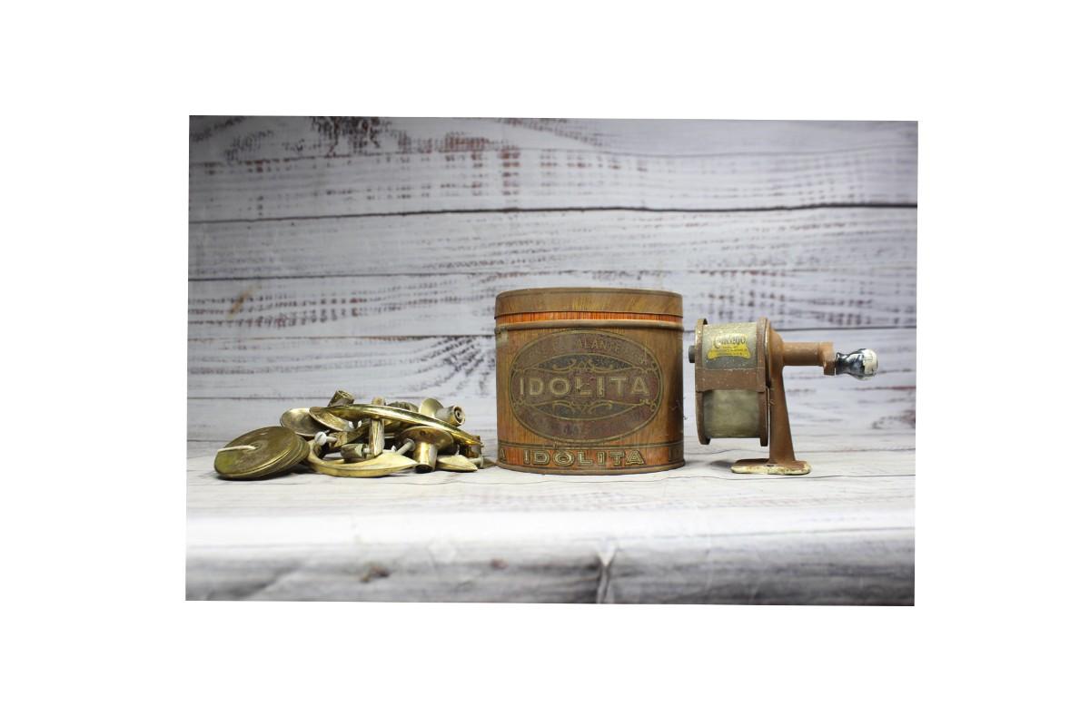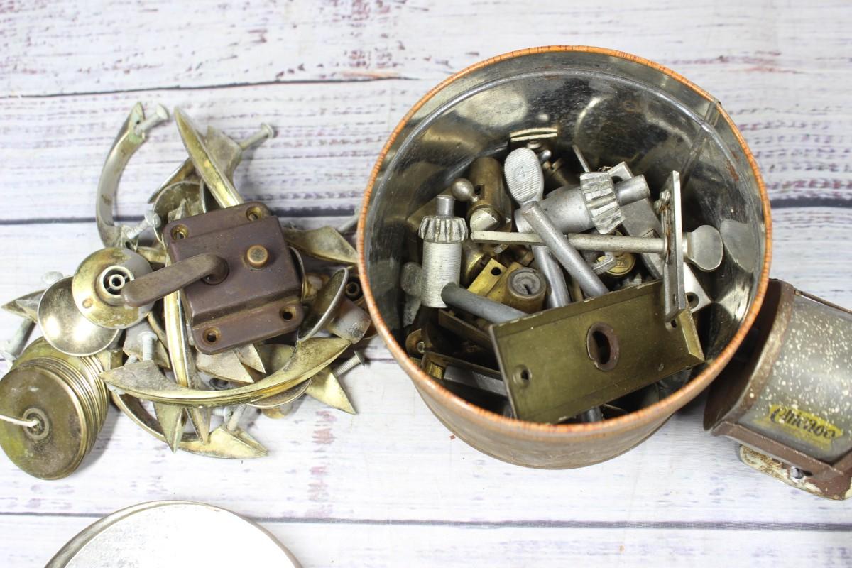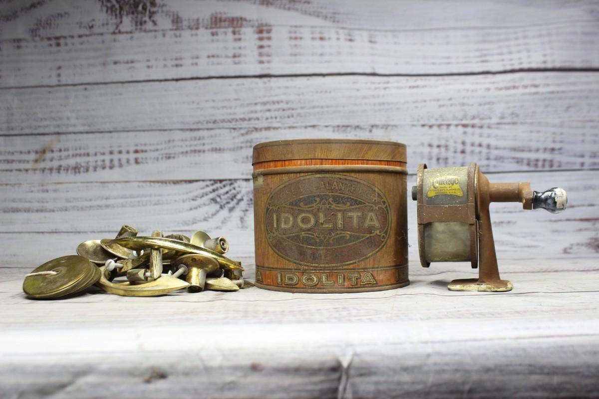 Lot of Vintage Tool Parts Idolita Tobacco Cigar Tin, Chicago Pencil Sharpener, & More, there is some wear to the pieces, check pictures for more details and for sizing.