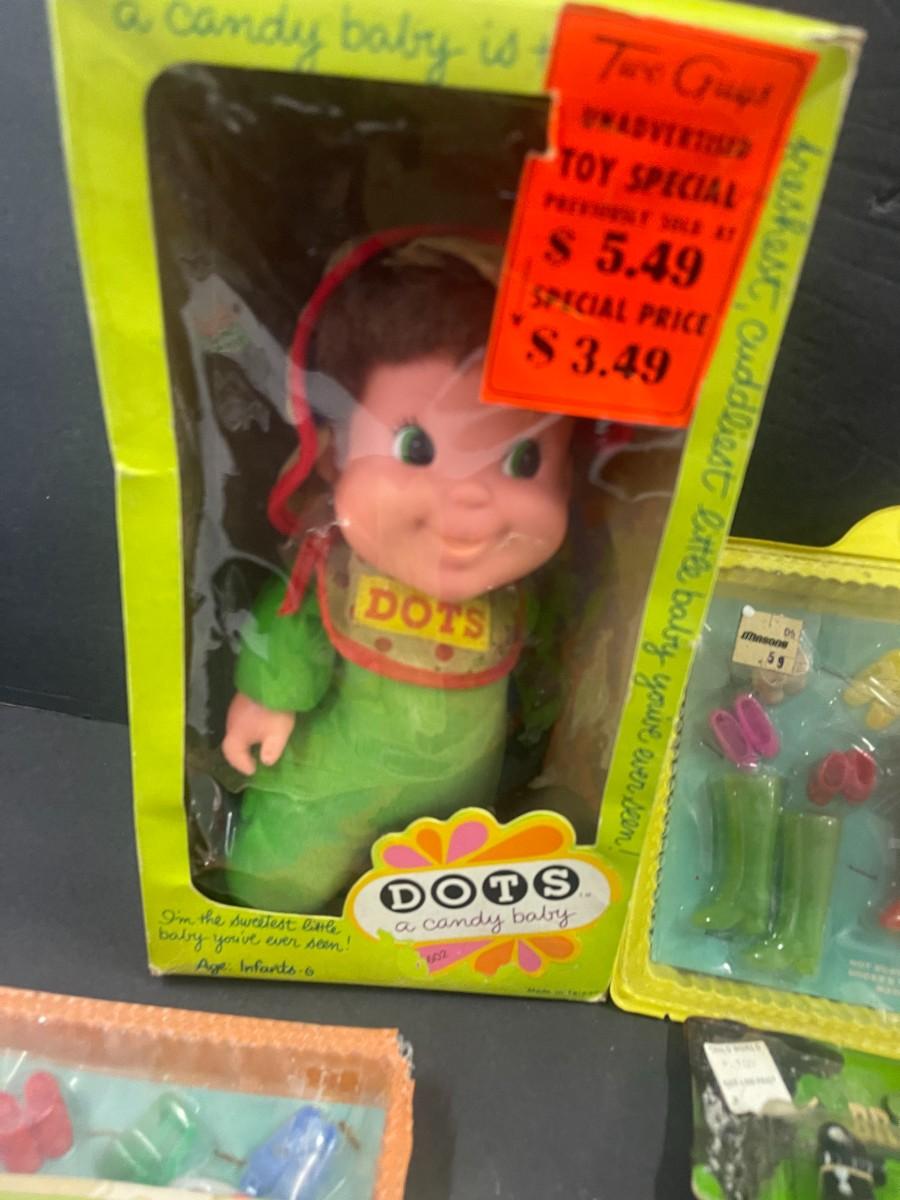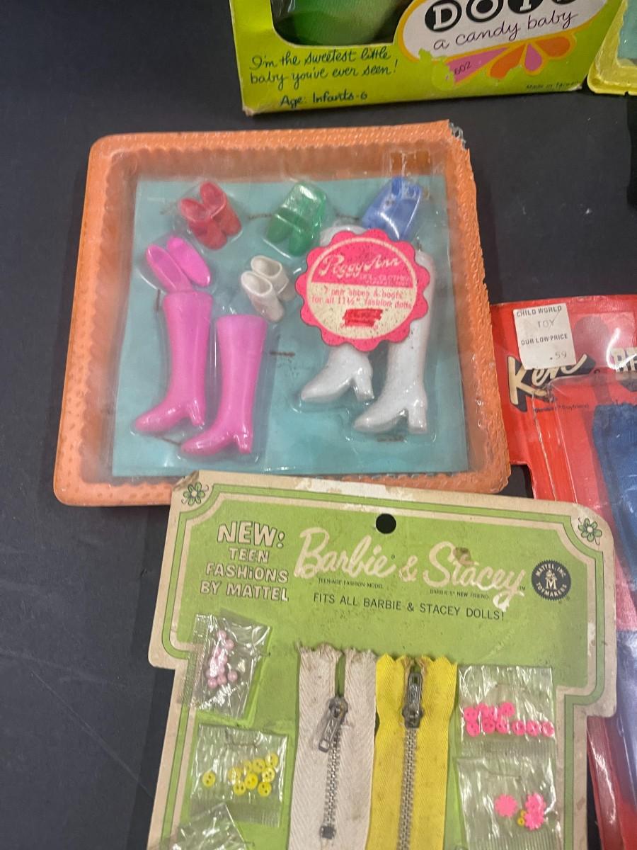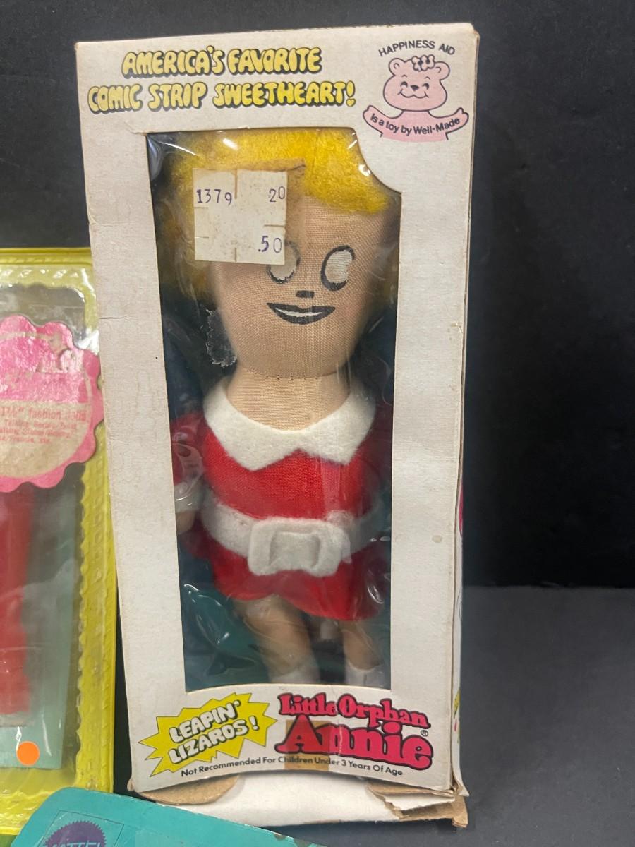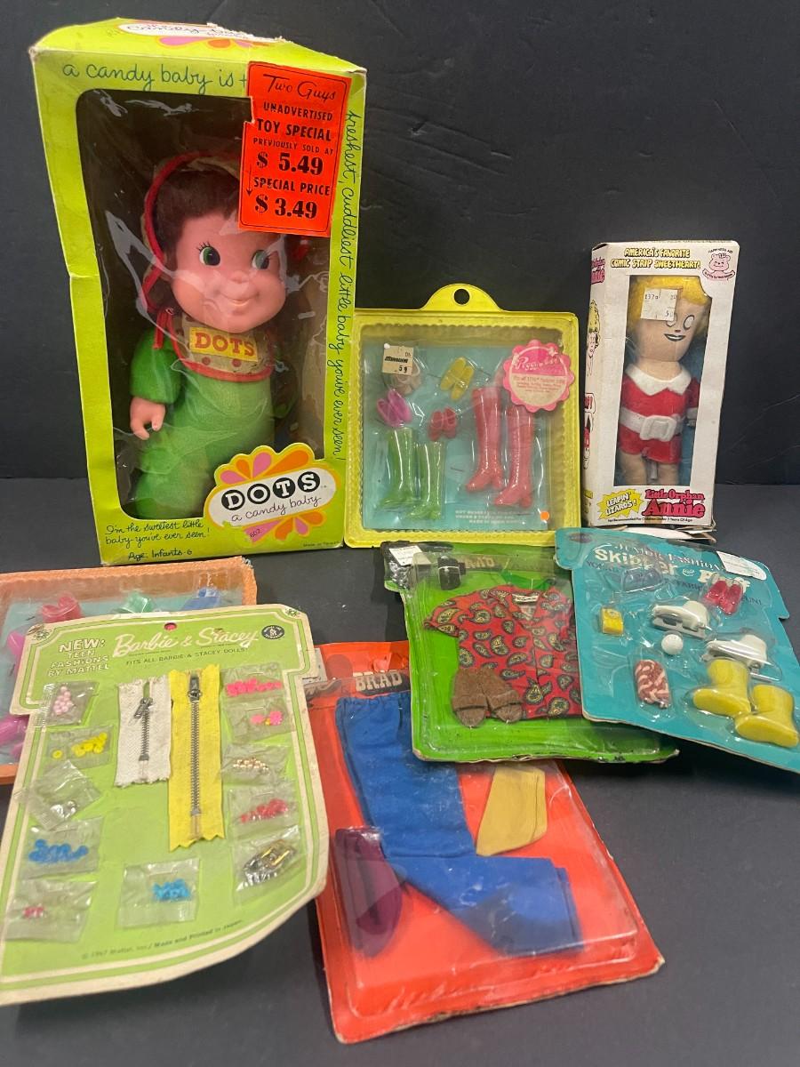 Lot includes: Vintage Dots candy baby in original box (box is damaged), Vintage Little Orphan Annie plush doll (in original box, box is damaged), 6 packages of vintage Barbie style doll clothes/accessories.