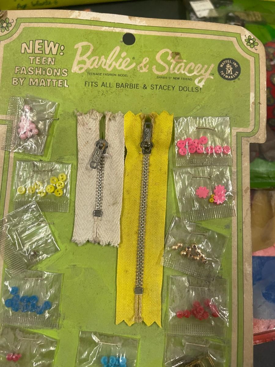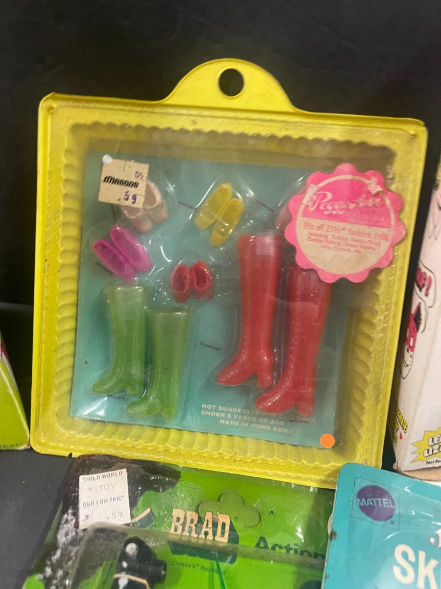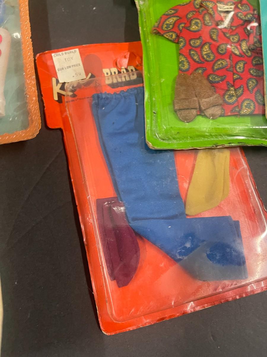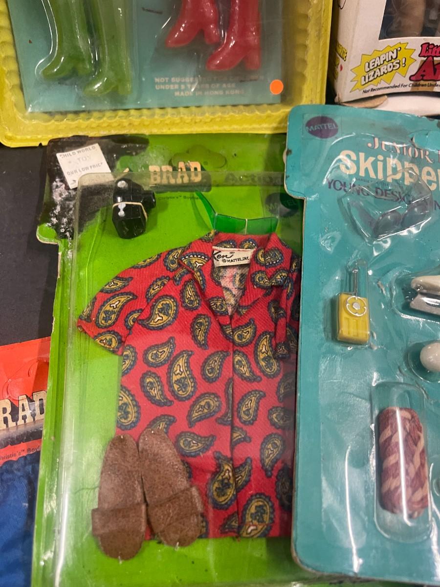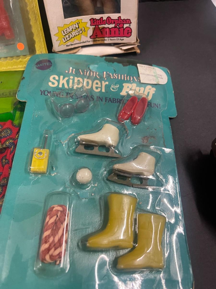 Lot includes: Vintage Dots candy baby in original box (box is damaged), Vintage Little Orphan Annie plush doll (in original box, box is damaged), 6 packages of vintage Barbie style doll clothes/accessories.