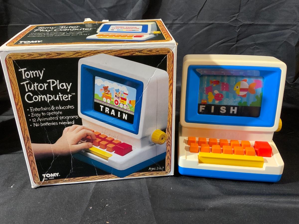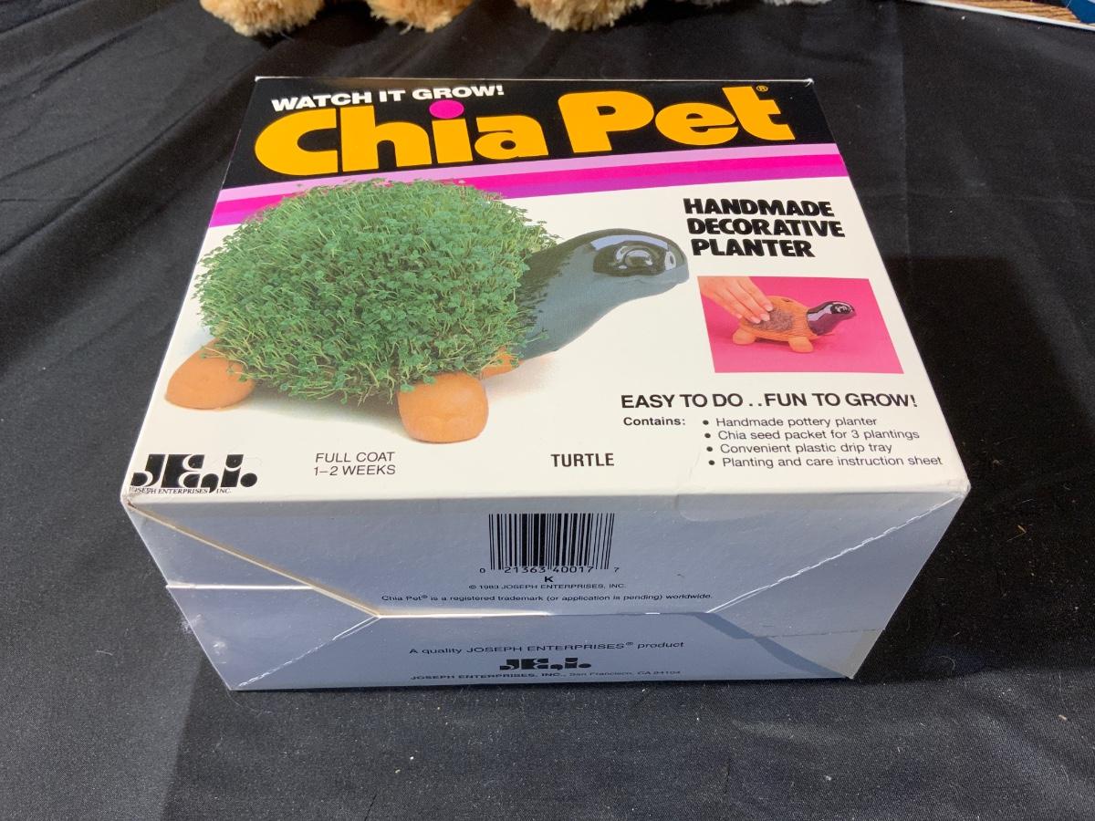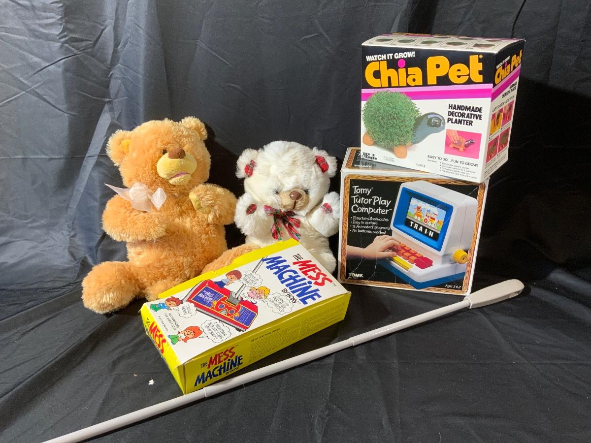 Lot of Vintage Toys including a Mess Machine, teddy Bears, Childs Computer and an unused Chia Pet from 1983