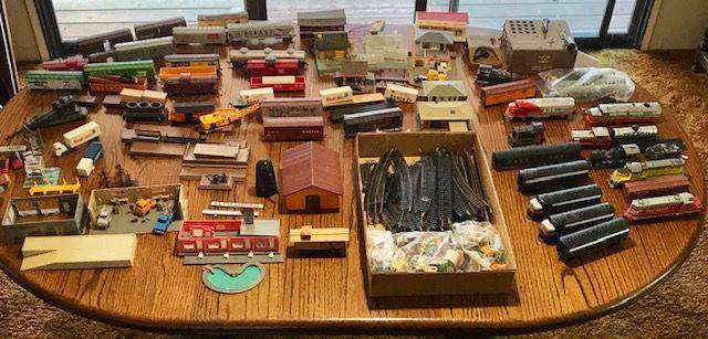Miscellaneous plastic and die cast trains. Tyco #895 transformer and Marnopower C25 series A transformer. Includes 14 empty train boxes. Boxes do not appear to match any of the trains pictured. Condition varies from poor, to fair, and good condition.