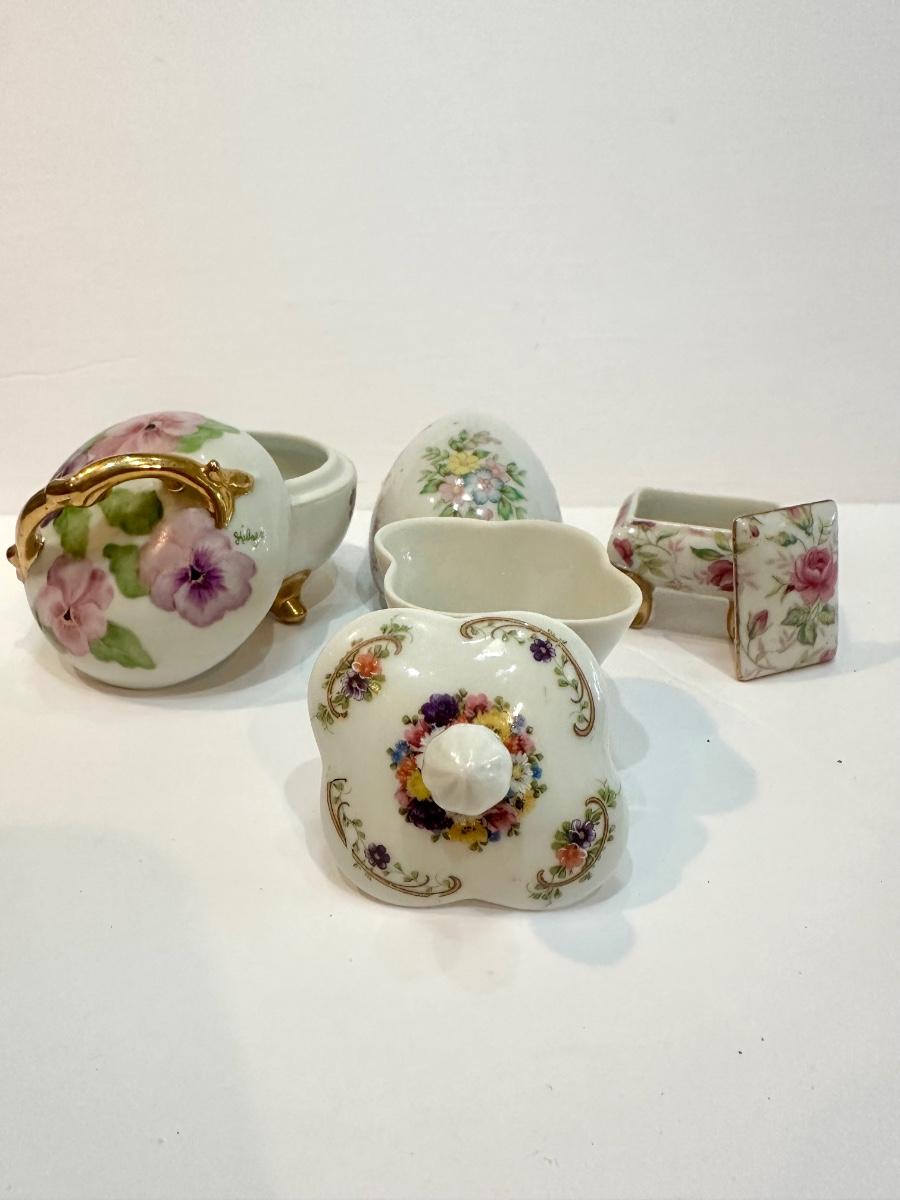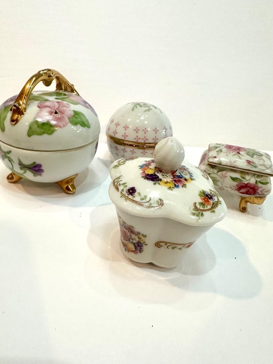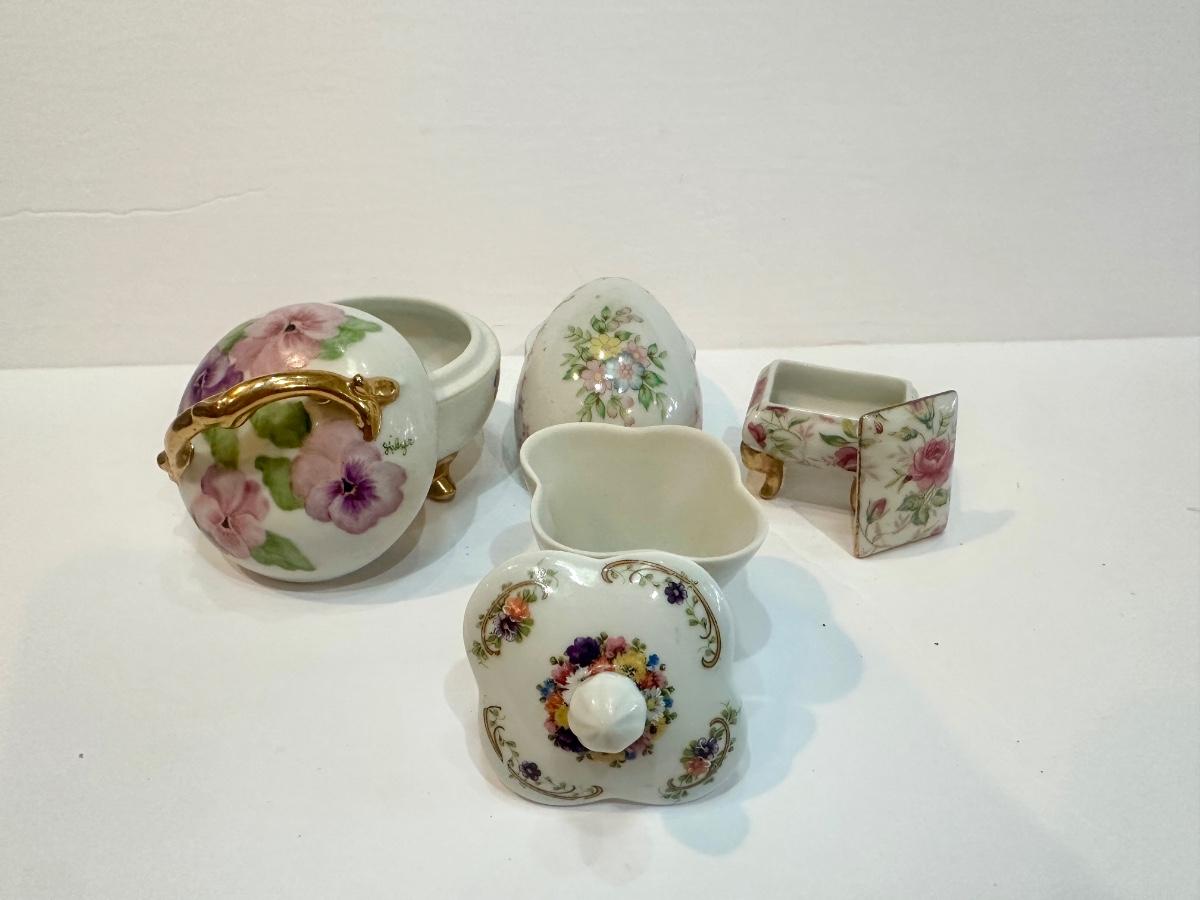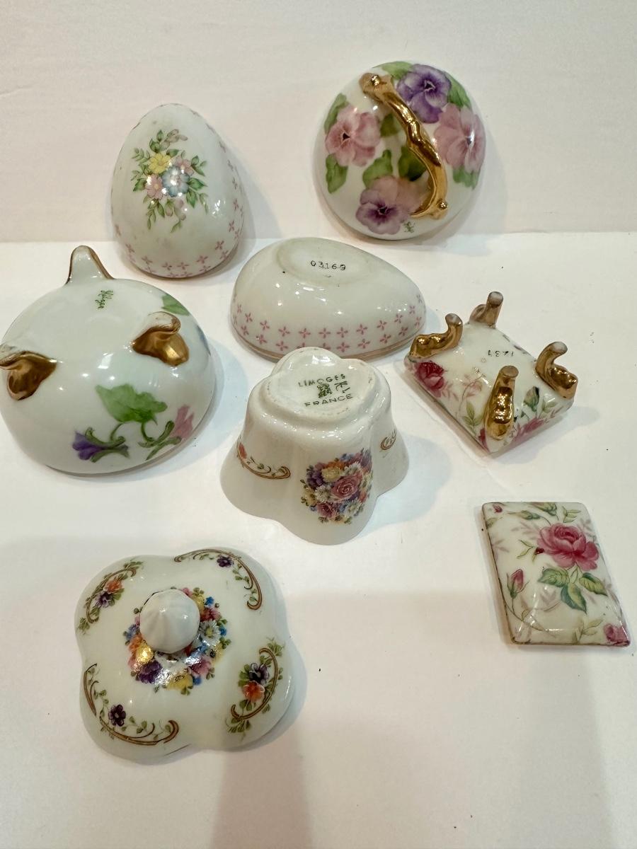 A great assortment of delicate hand painted porcelain trinket boxes. Various makers