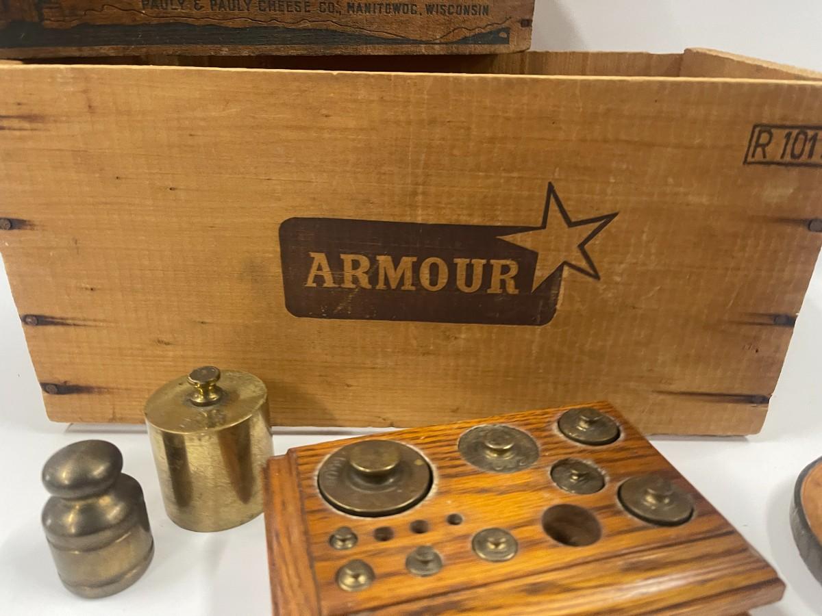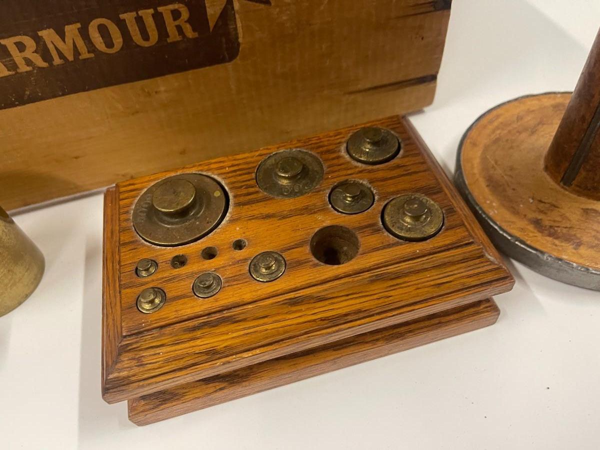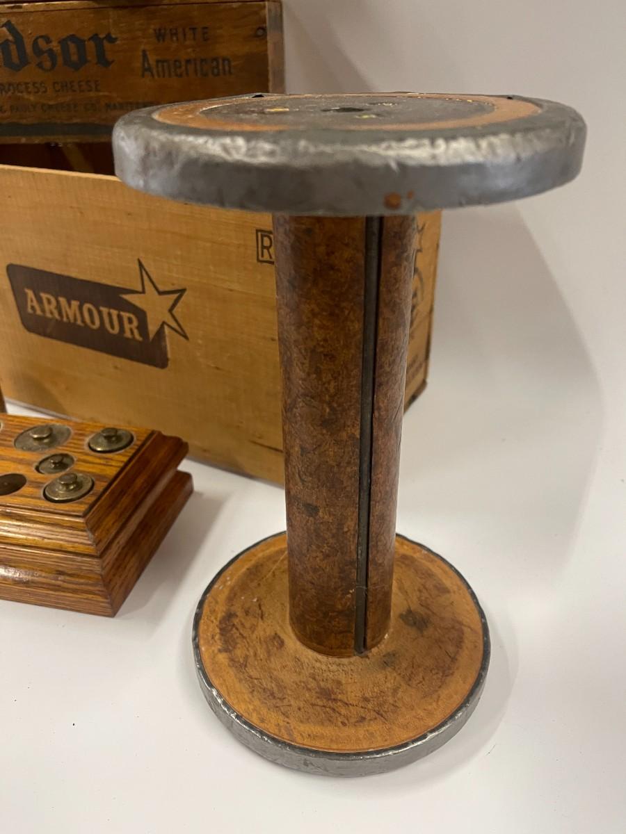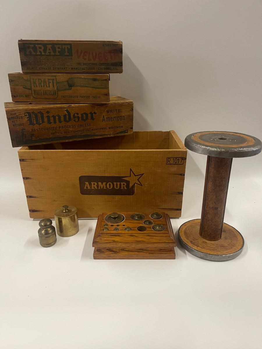 Includes: vintage wooden cheese boxes, yarn spool, scale weights