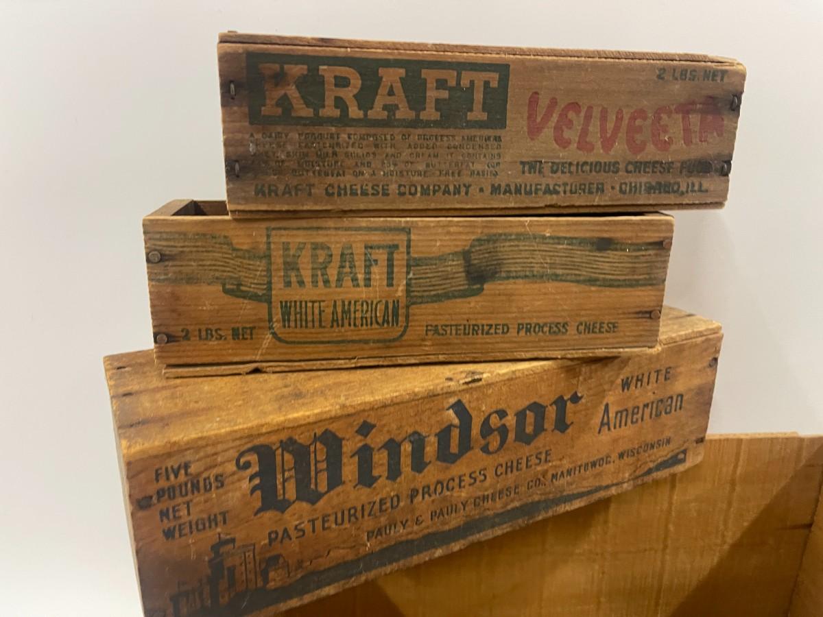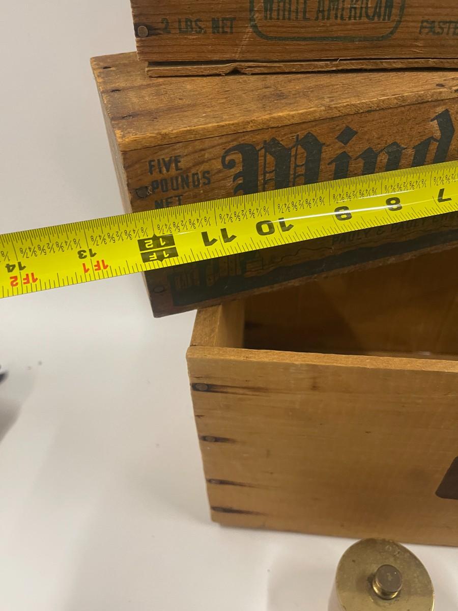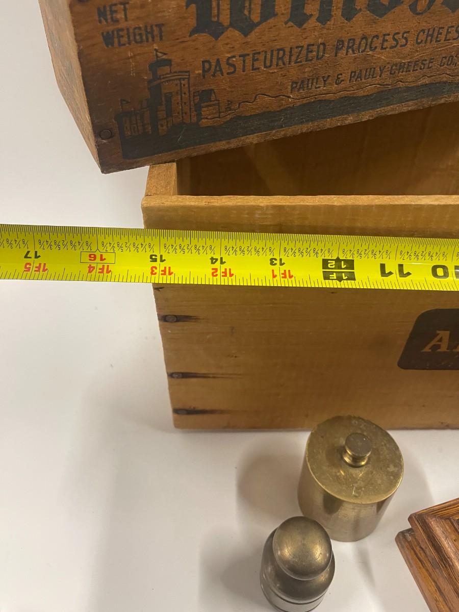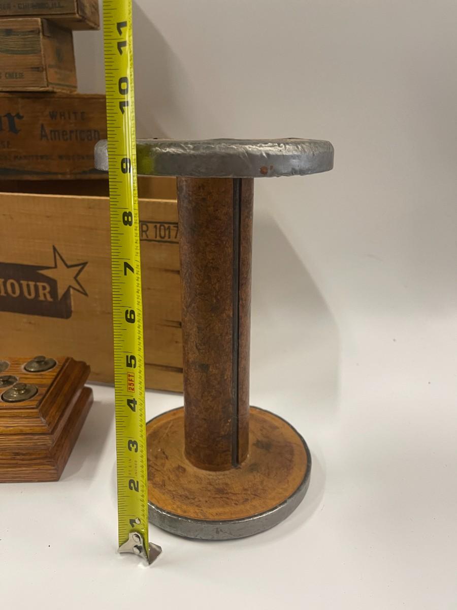 Includes: vintage wooden cheese boxes, yarn spool, scale weights
