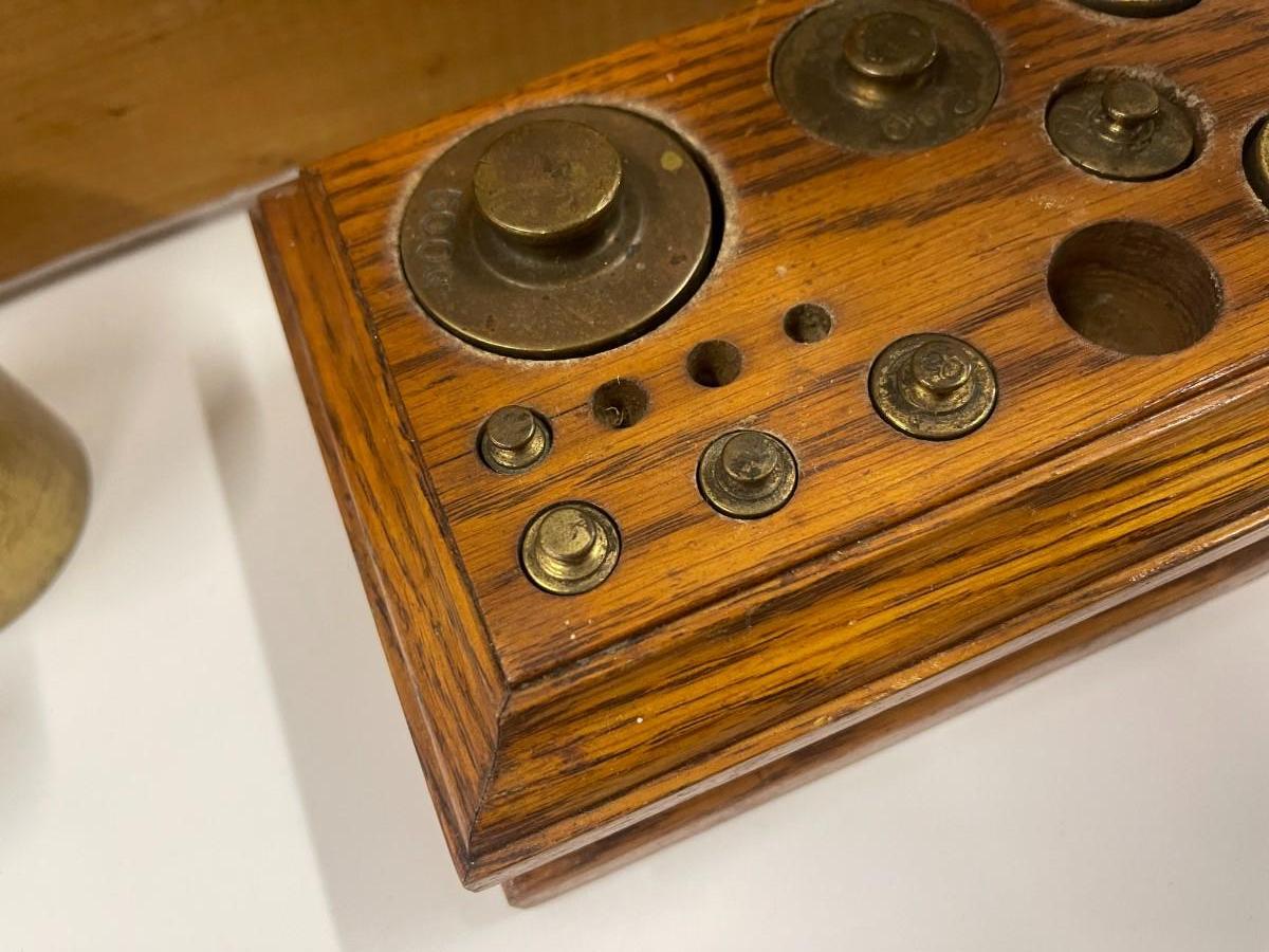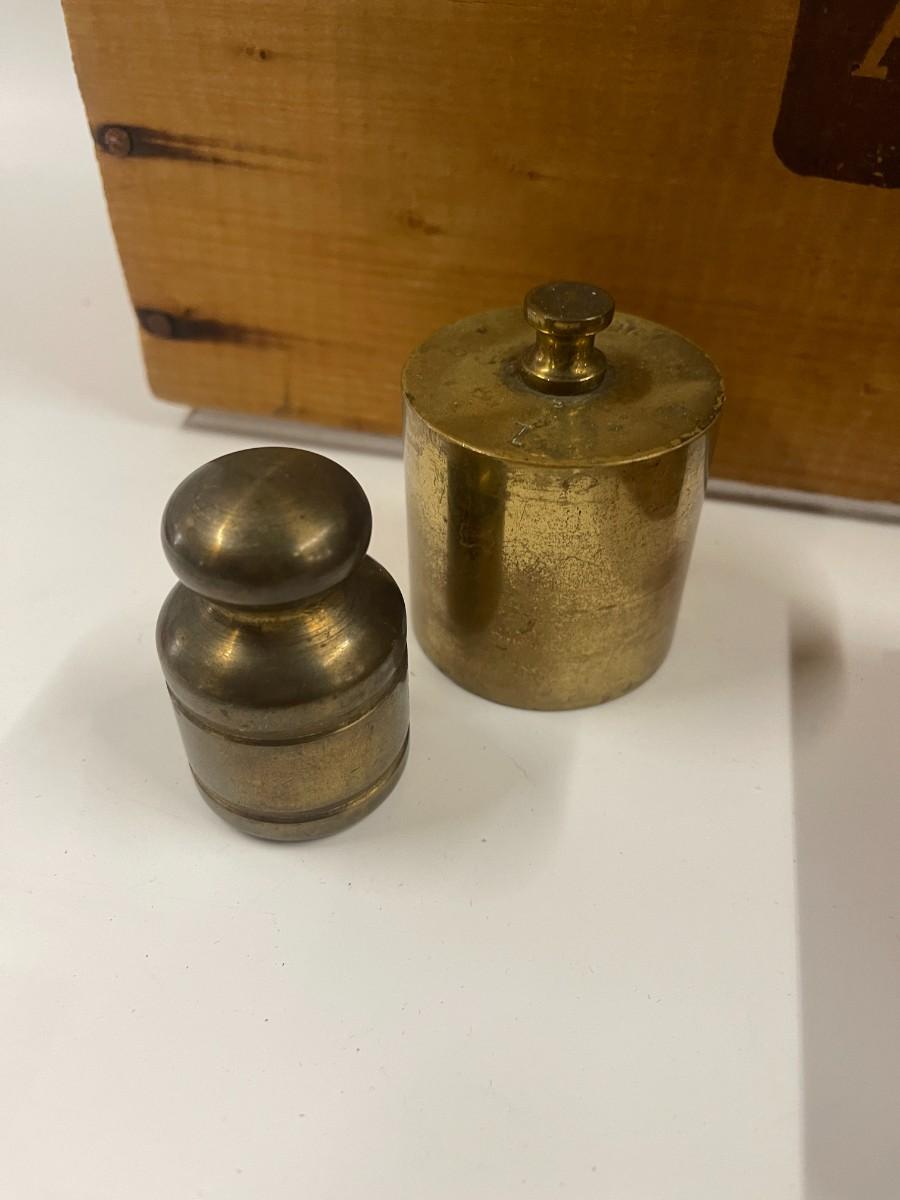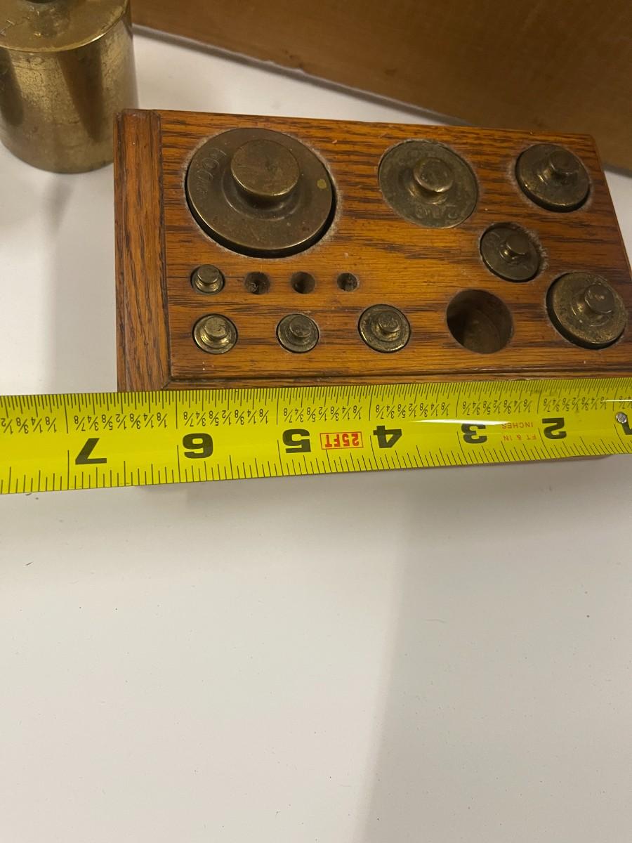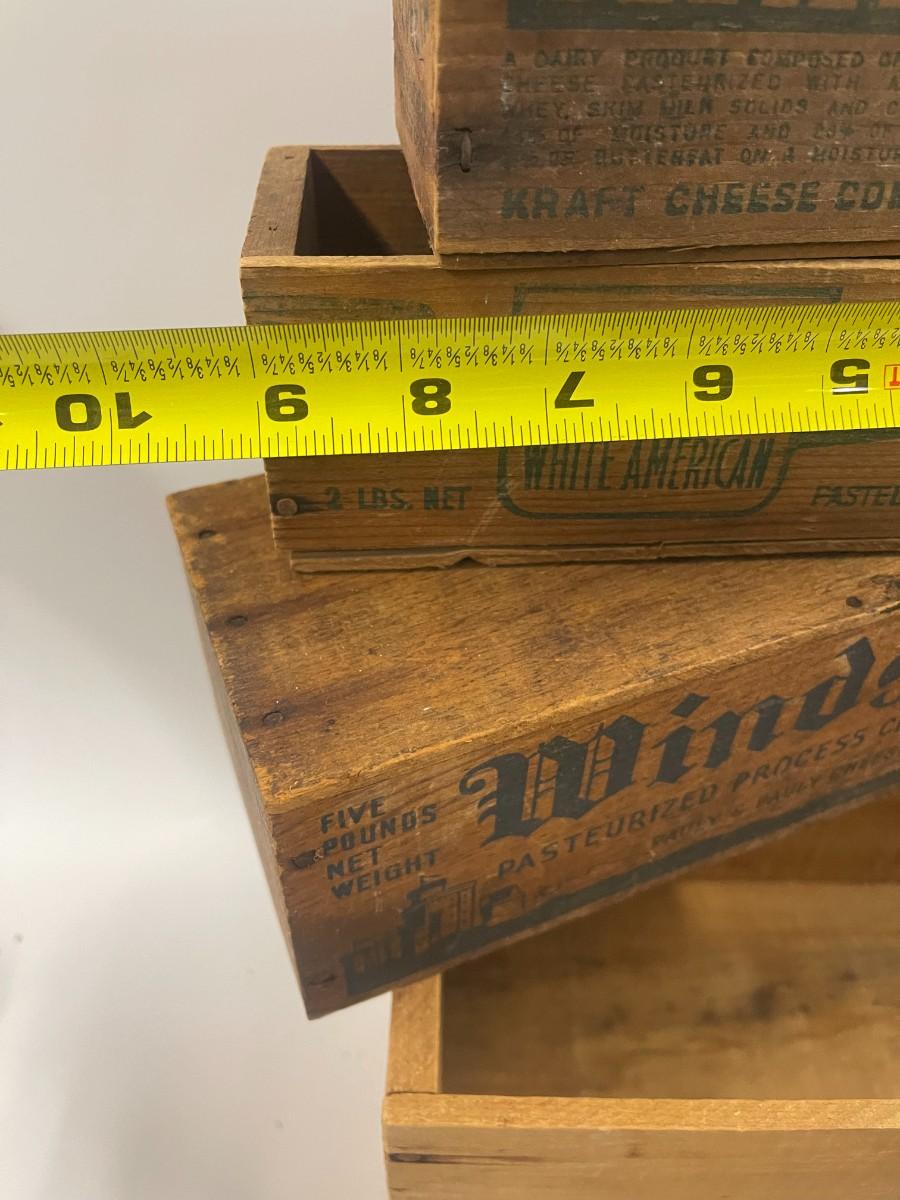 Includes: vintage wooden cheese boxes, yarn spool, scale weights