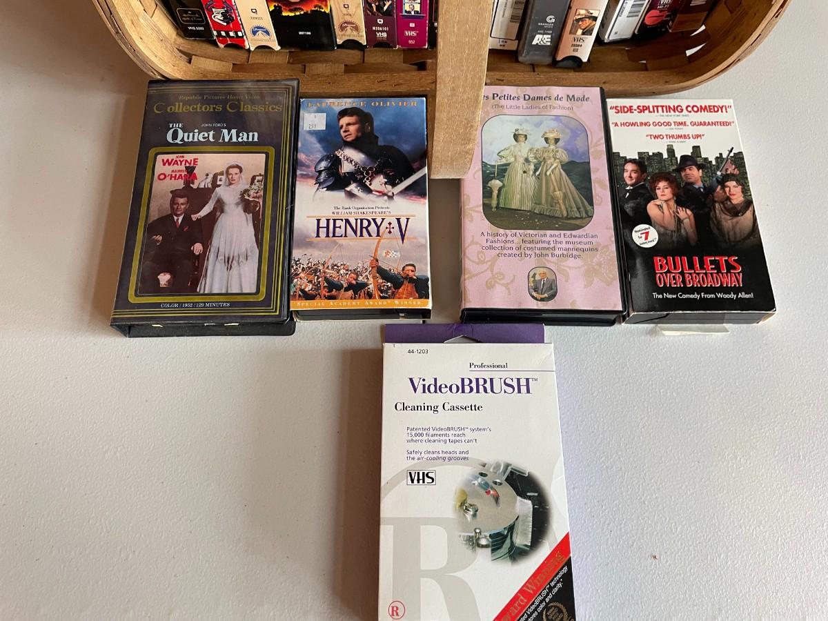 Vintage VHS tapes with notable movie titles. Also includes VHS cleaning cassette.