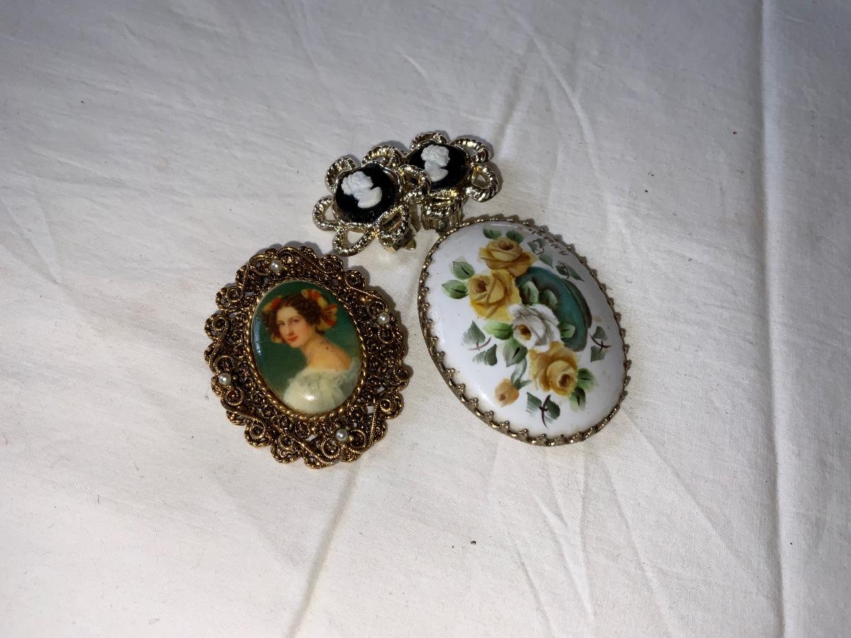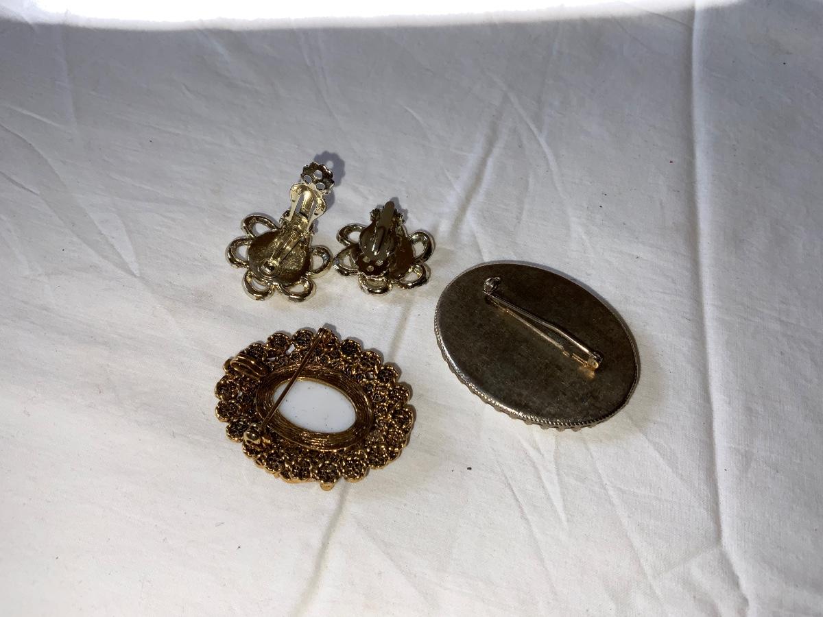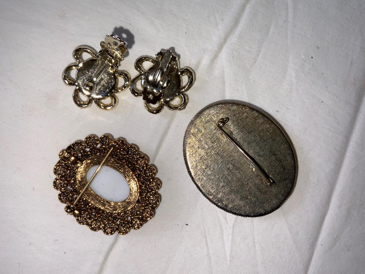 Nice Vintage items. 2 brooches and a pair of earrings. 1 Brooch is signed. See pics for condition,