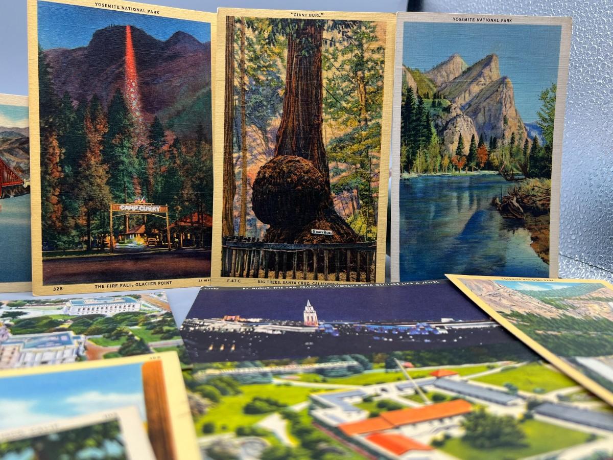Lot of Vintage Vinyl Travel Postcards of California San Francisco, Sacramento, Yosemite National Park & More, there are no significant rips or tears to the postcards and is in good collectible condition. Check pictures for more details.