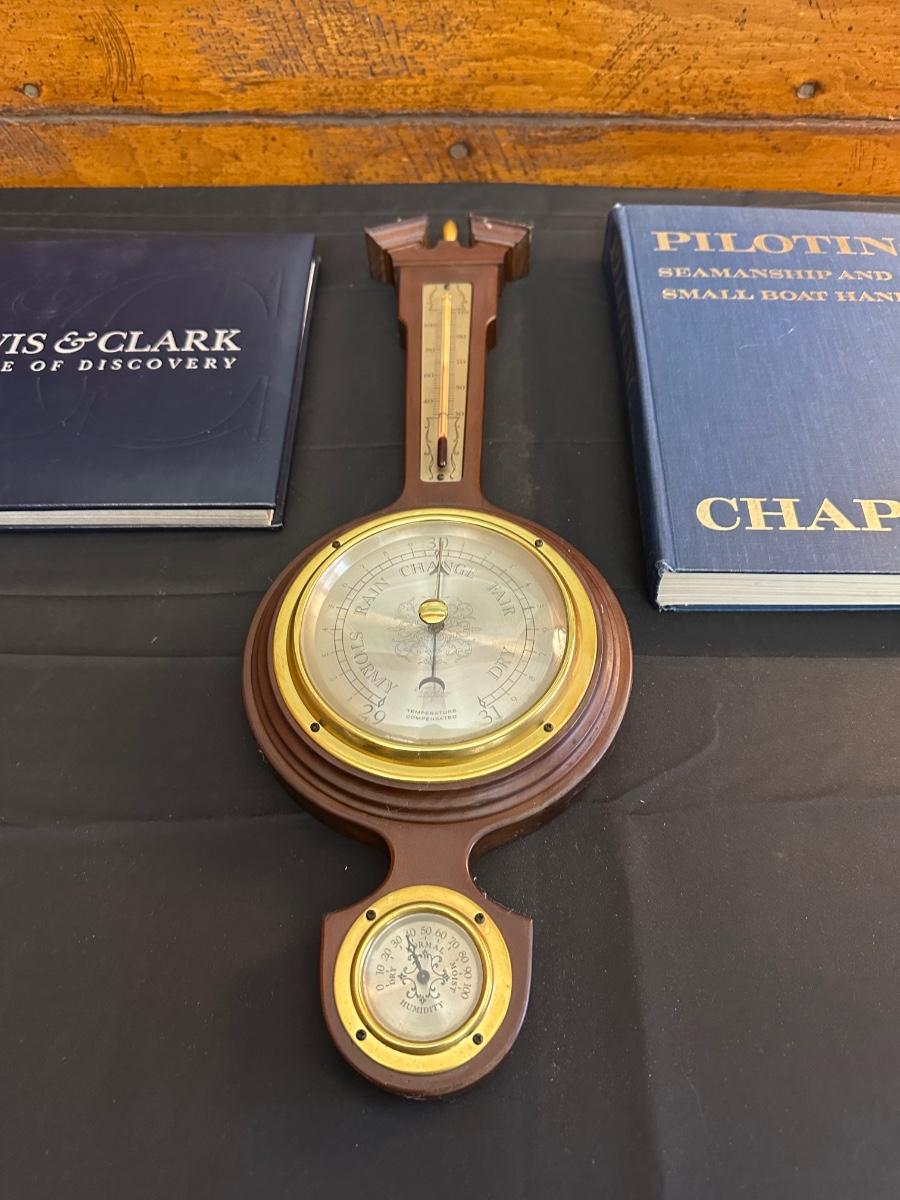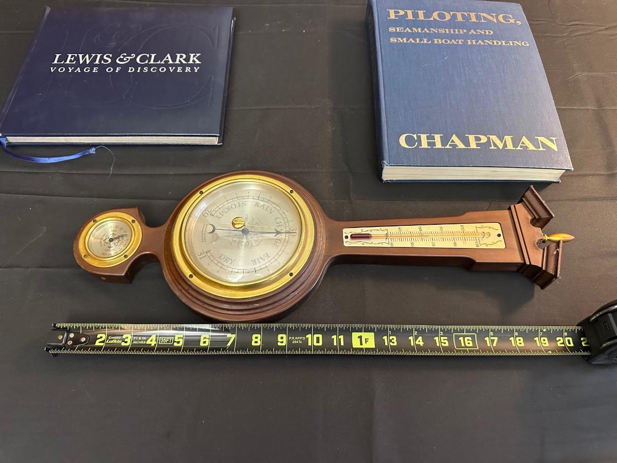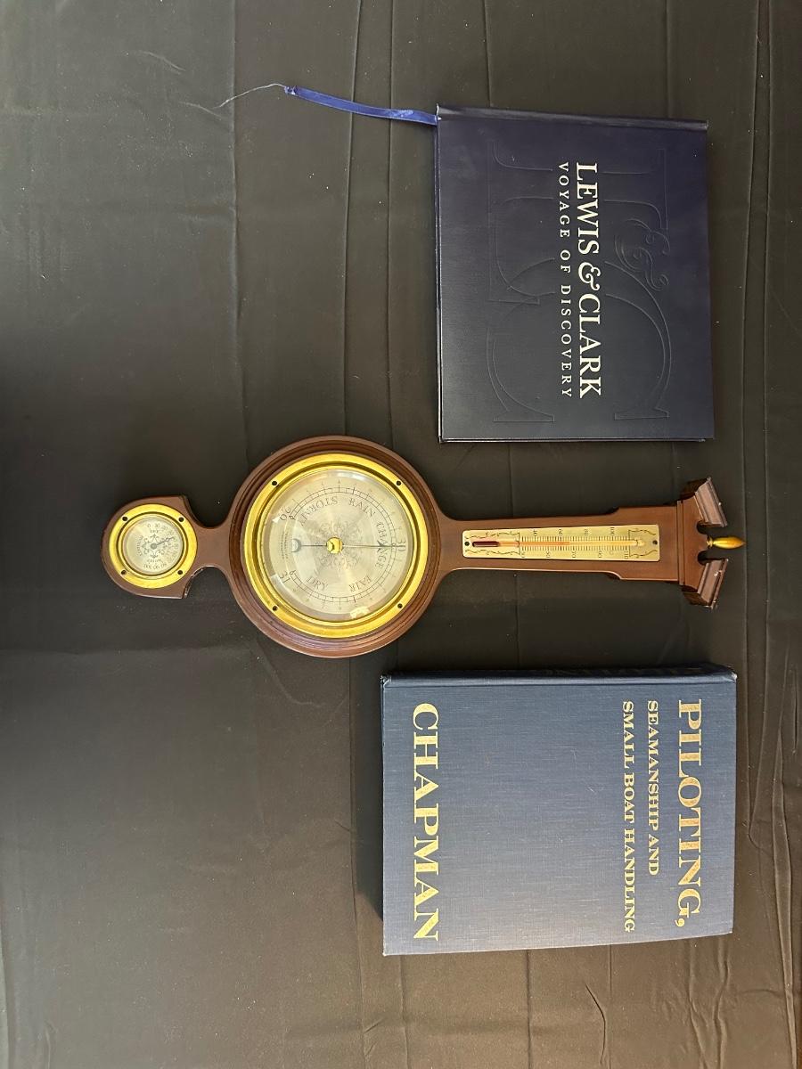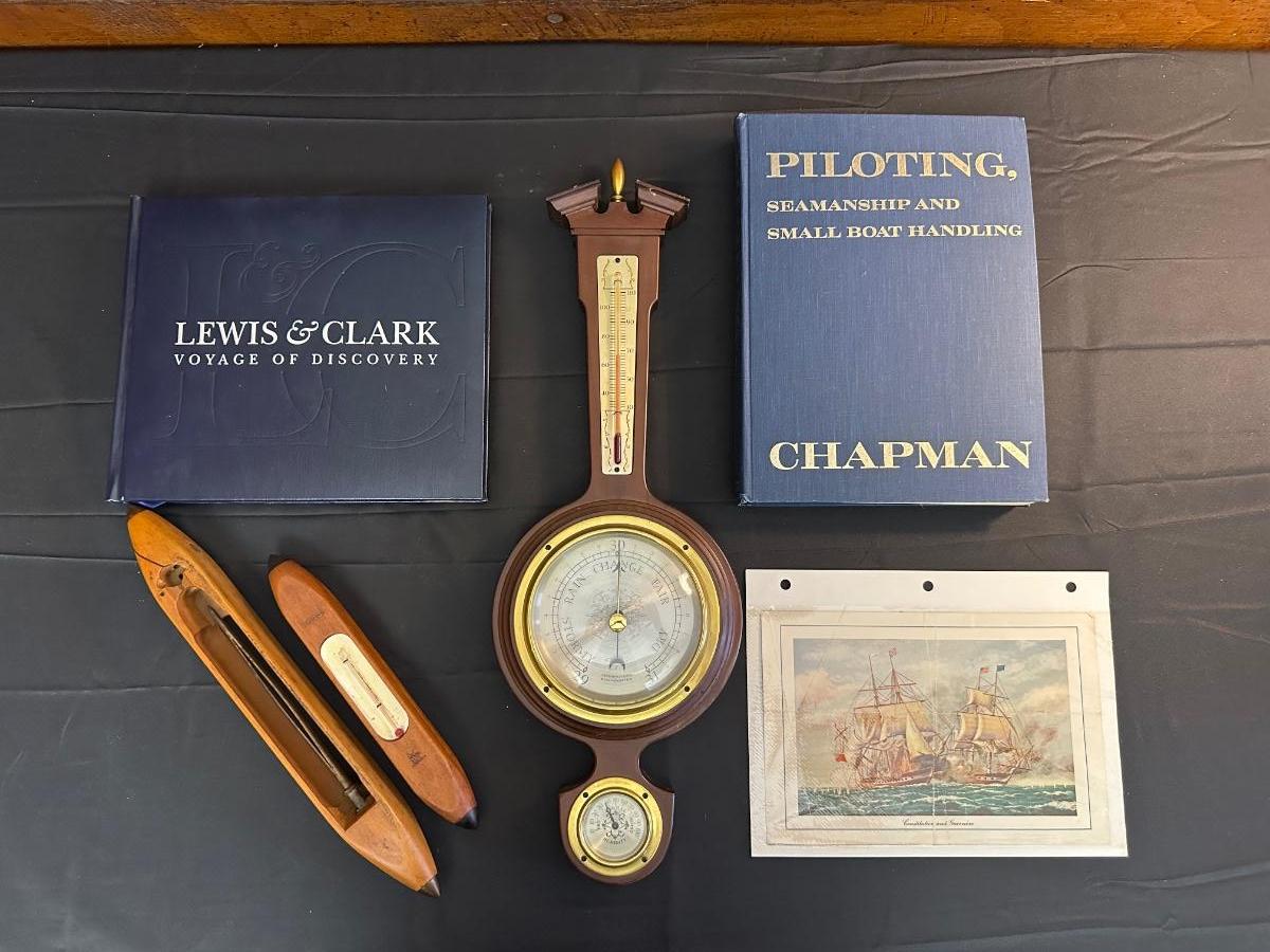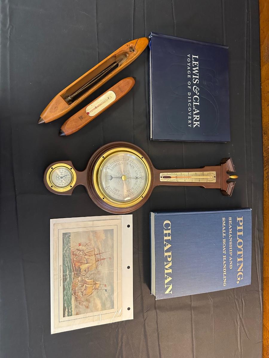 Vintage Wooden Loom, Wood Thermometer, The book Lewis & Clark Voyage of Discovery, book Piloting, Seamanship and Small Boat Handling, and a laminated picture of two ships. Thermometers are purely for decor, and do not actively work .