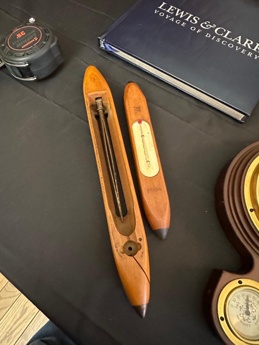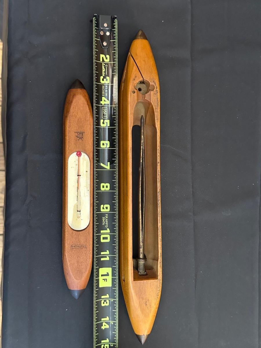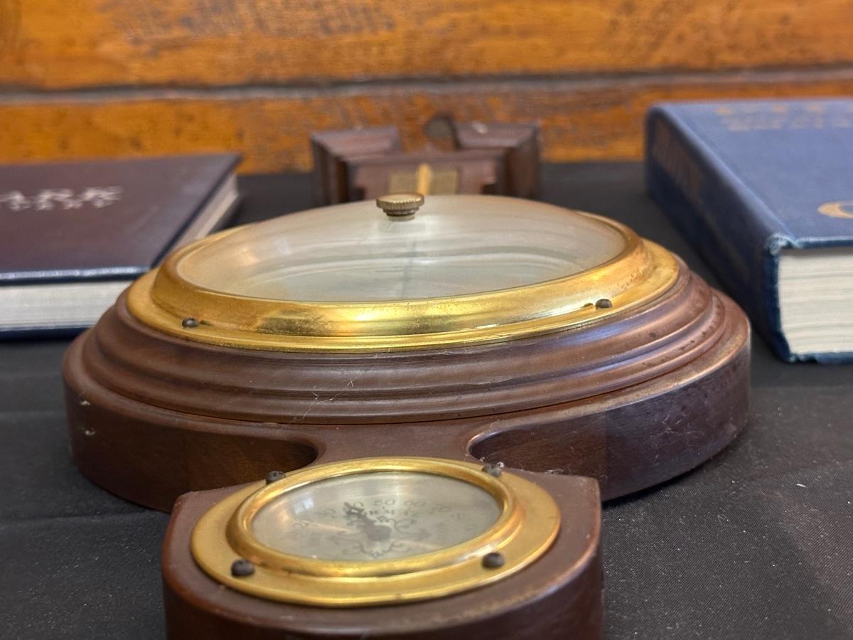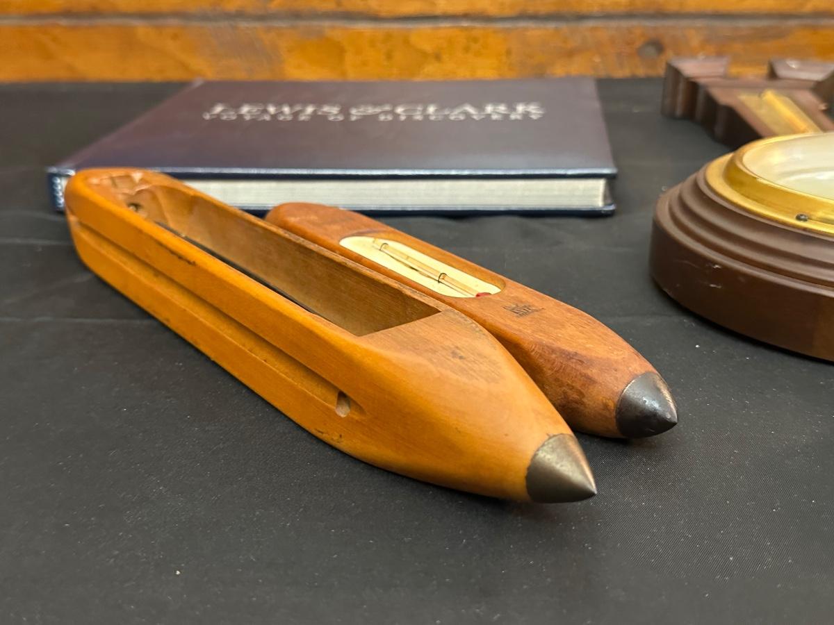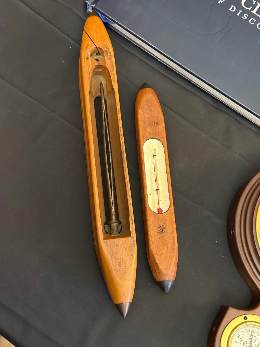 Vintage Wooden Loom, Wood Thermometer, The book Lewis & Clark Voyage of Discovery, book Piloting, Seamanship and Small Boat Handling, and a laminated picture of two ships. Thermometers are purely for decor, and do not actively work .