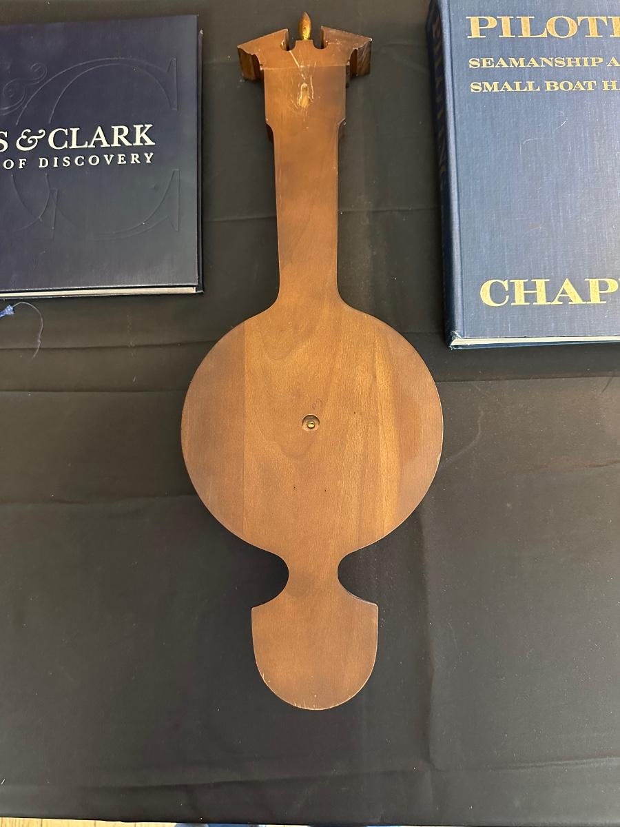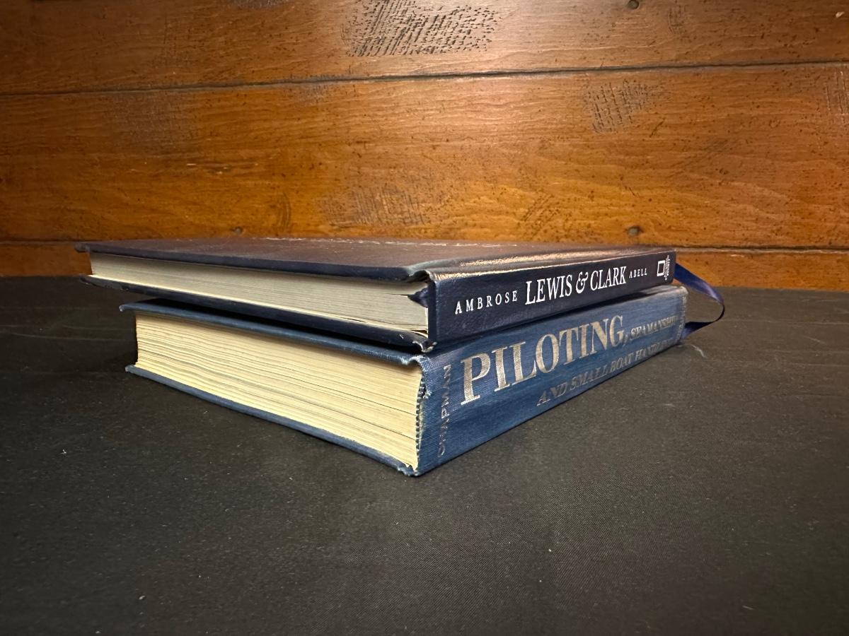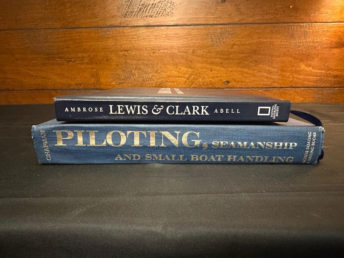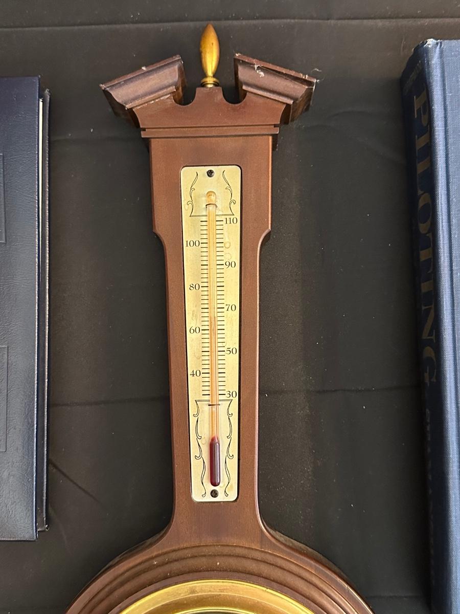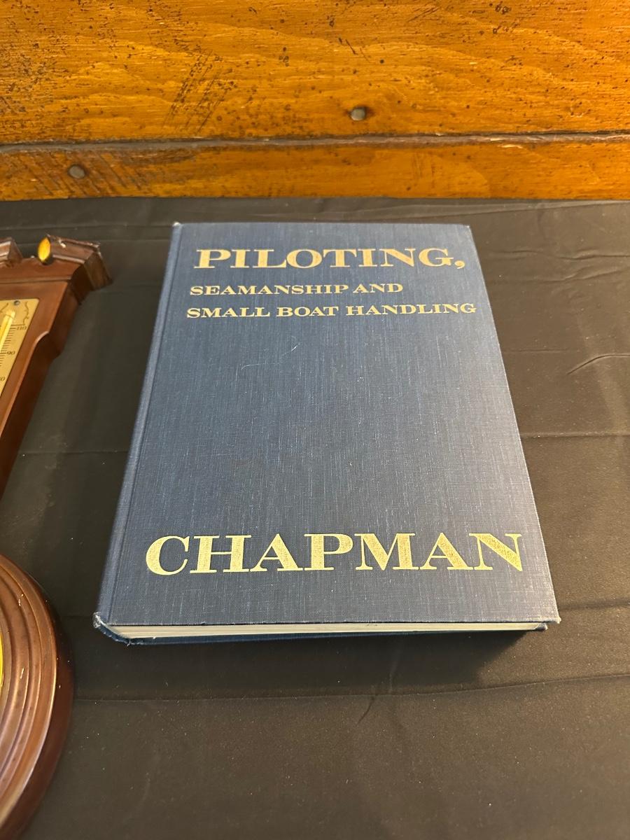 Vintage Wooden Loom, Wood Thermometer, The book Lewis & Clark Voyage of Discovery, book Piloting, Seamanship and Small Boat Handling, and a laminated picture of two ships. Thermometers are purely for decor, and do not actively work .
