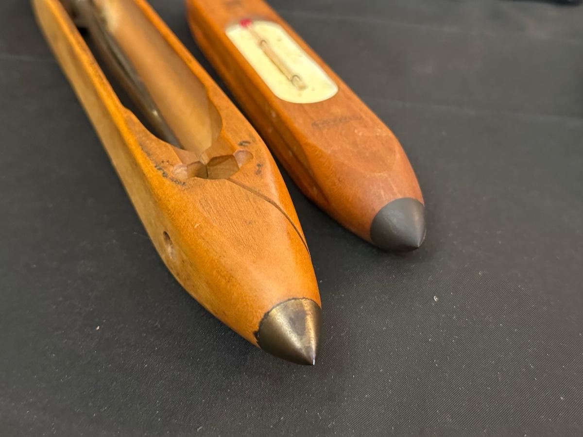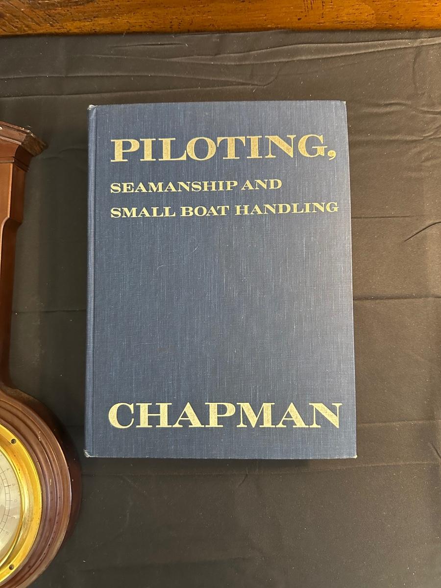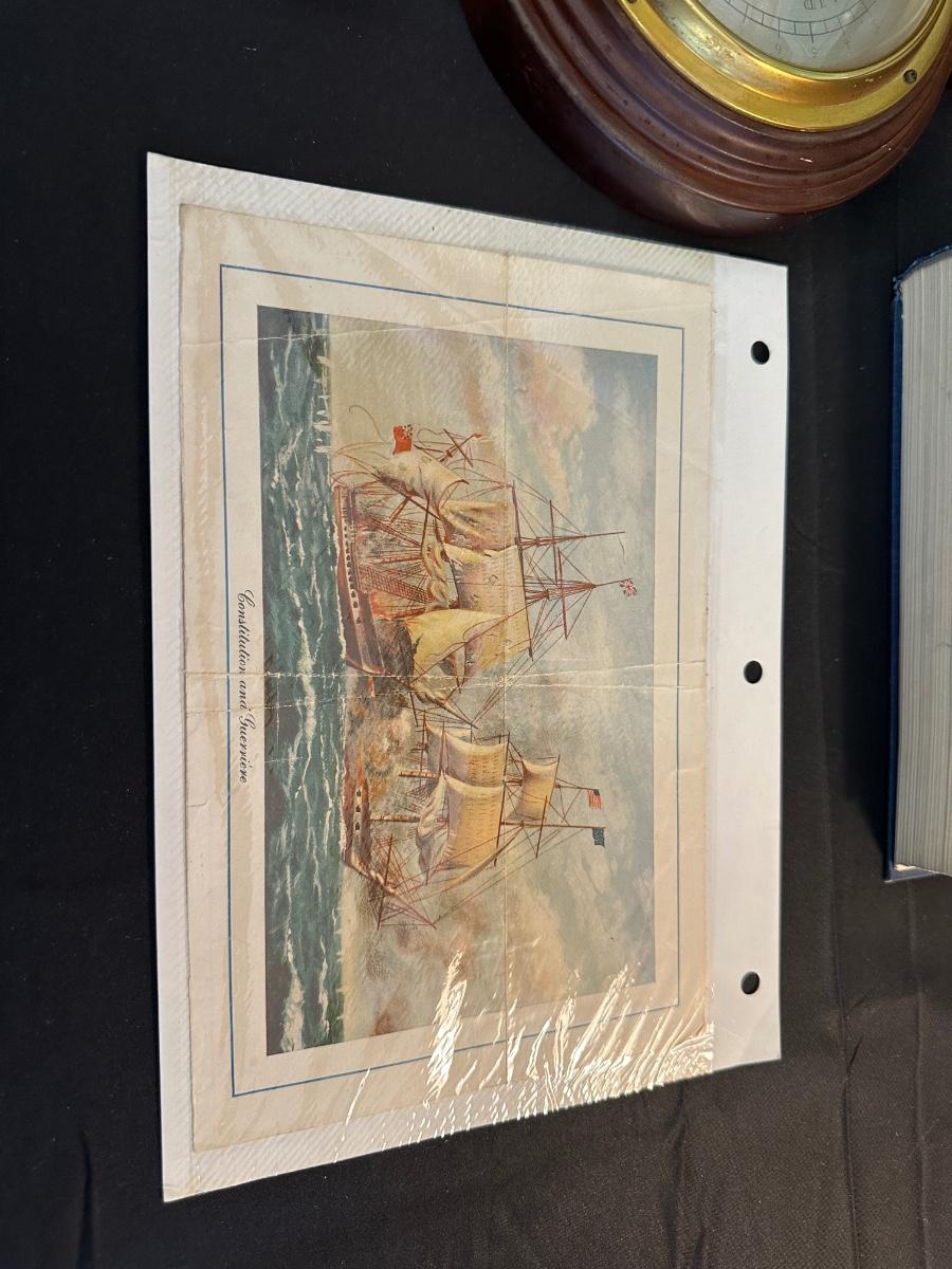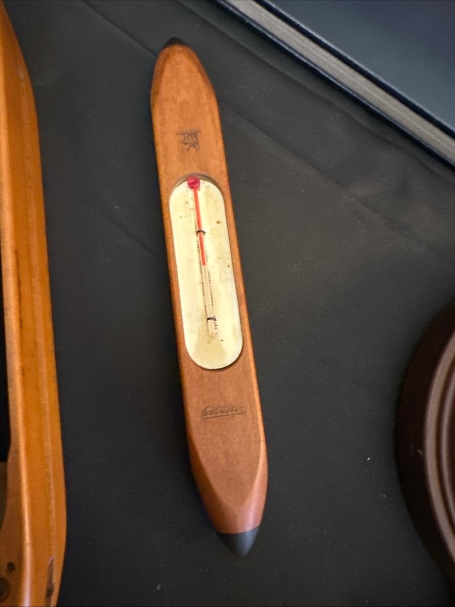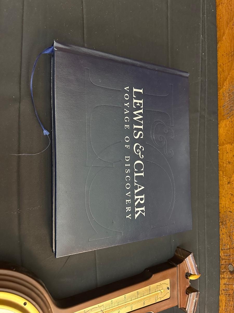 Vintage Wooden Loom, Wood Thermometer, The book Lewis & Clark Voyage of Discovery, book Piloting, Seamanship and Small Boat Handling, and a laminated picture of two ships. Thermometers are purely for decor, and do not actively work .