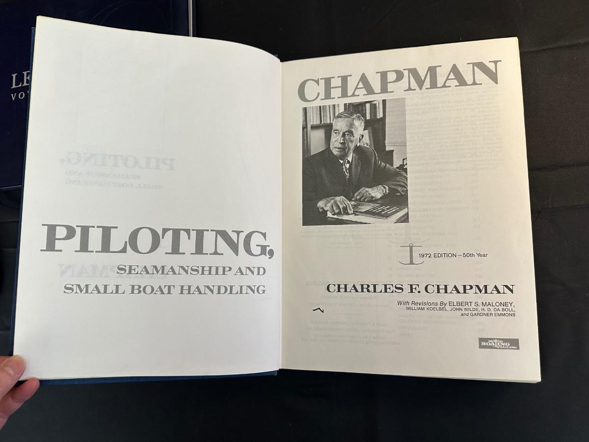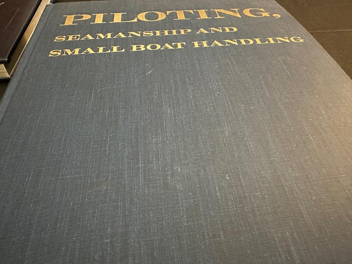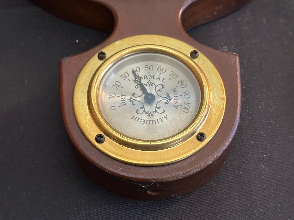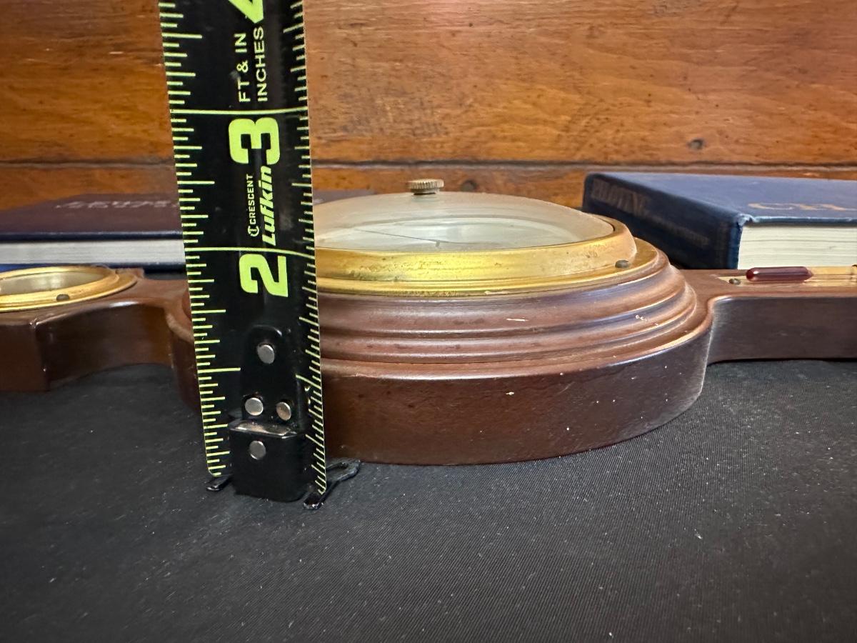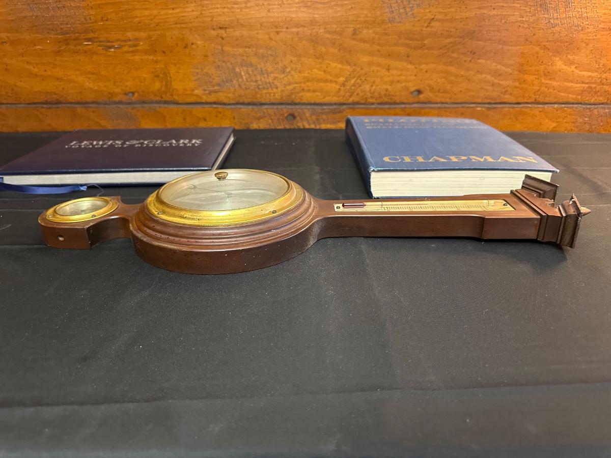 Vintage Wooden Loom, Wood Thermometer, The book Lewis & Clark Voyage of Discovery, book Piloting, Seamanship and Small Boat Handling, and a laminated picture of two ships. Thermometers are purely for decor, and do not actively work .
