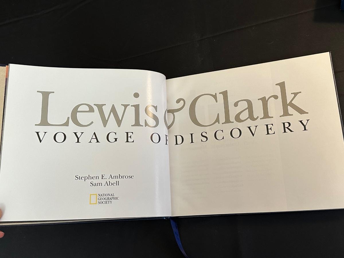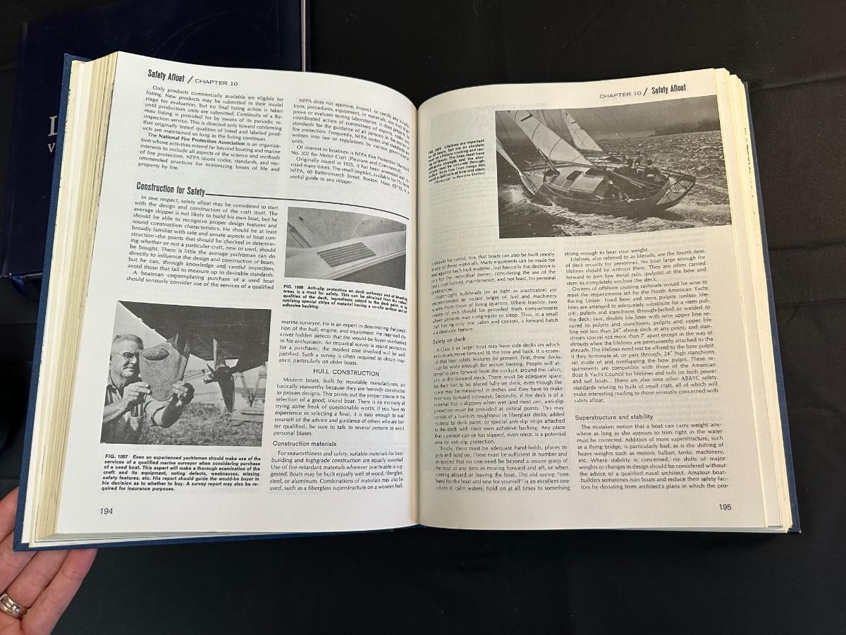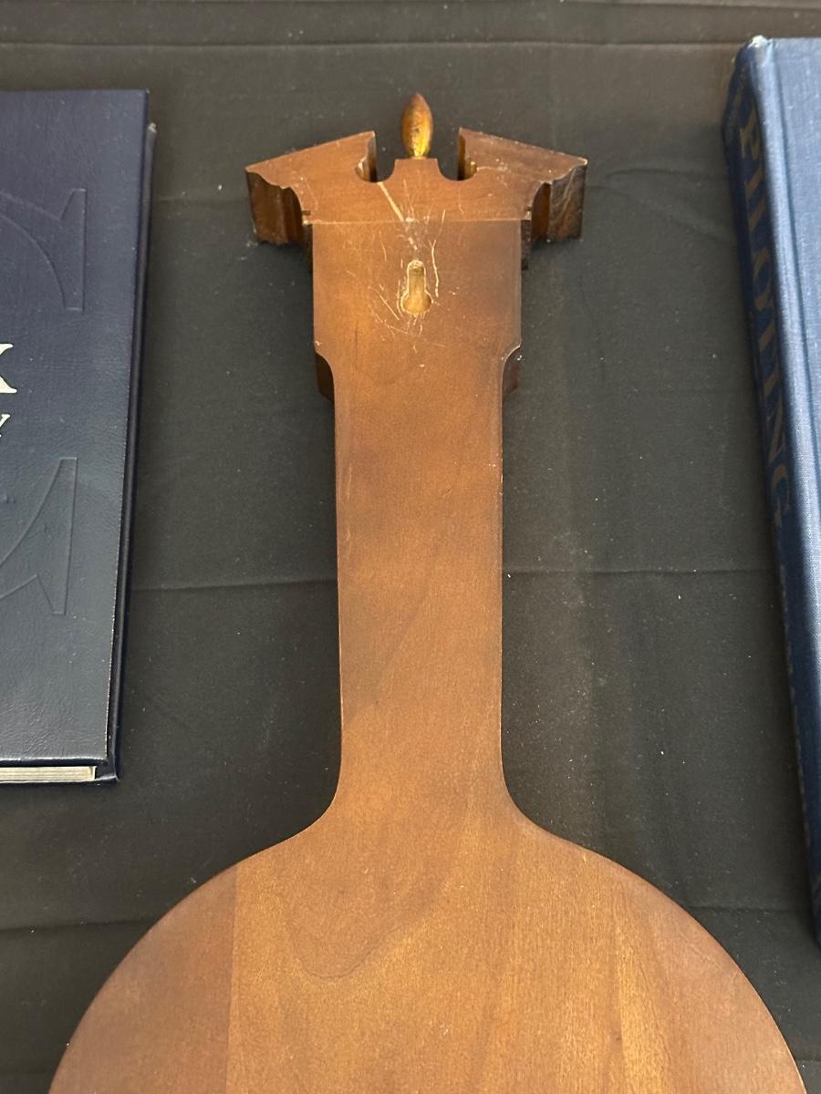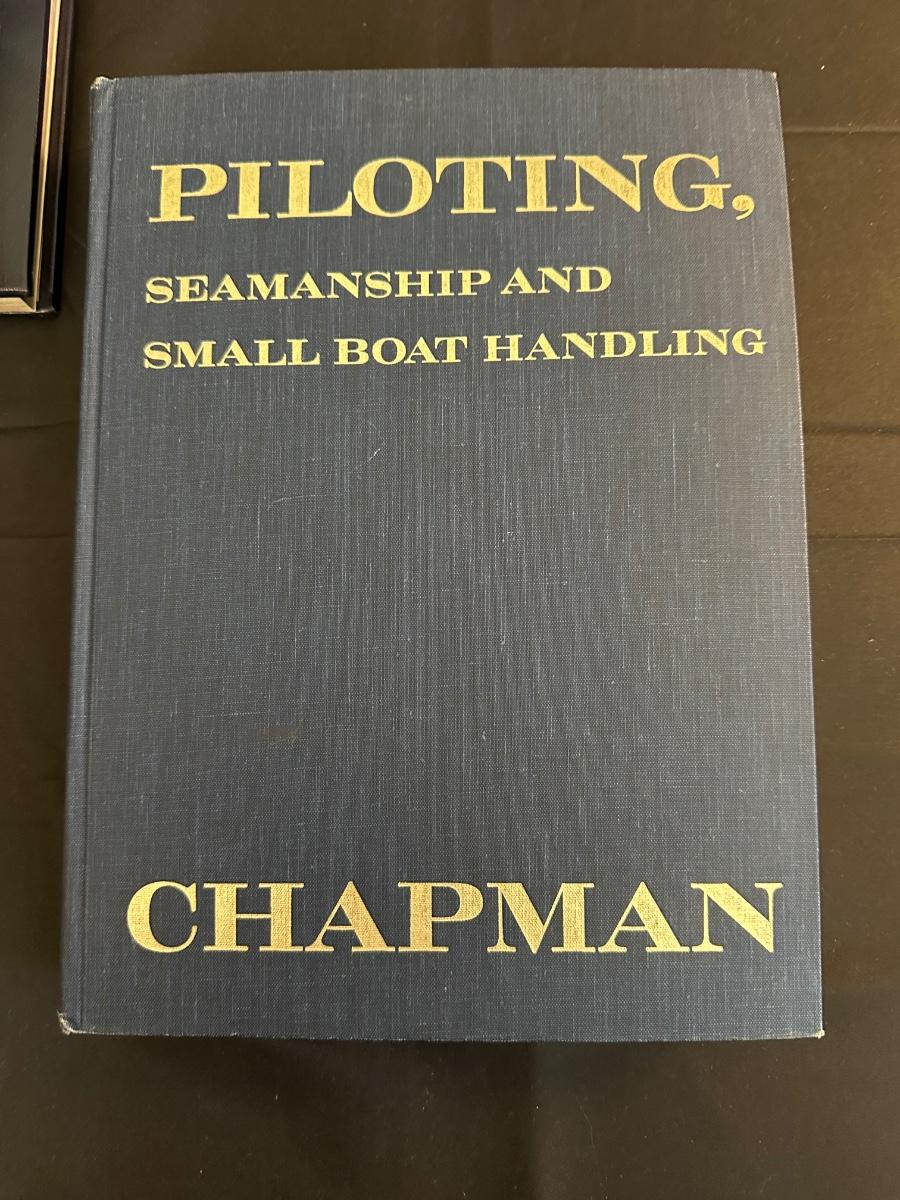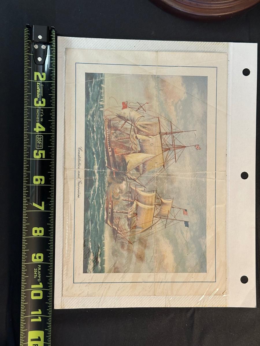 Vintage Wooden Loom, Wood Thermometer, The book Lewis & Clark Voyage of Discovery, book Piloting, Seamanship and Small Boat Handling, and a laminated picture of two ships. Thermometers are purely for decor, and do not actively work .