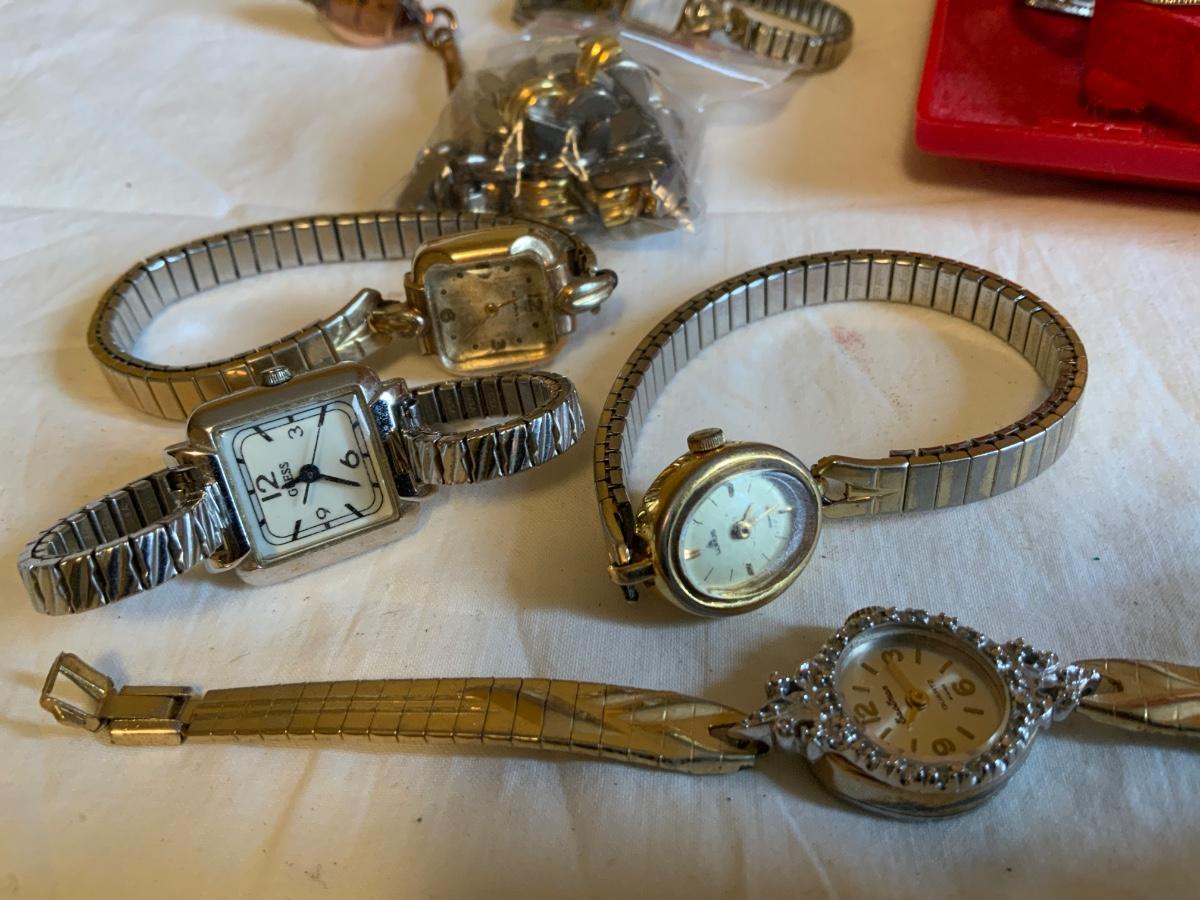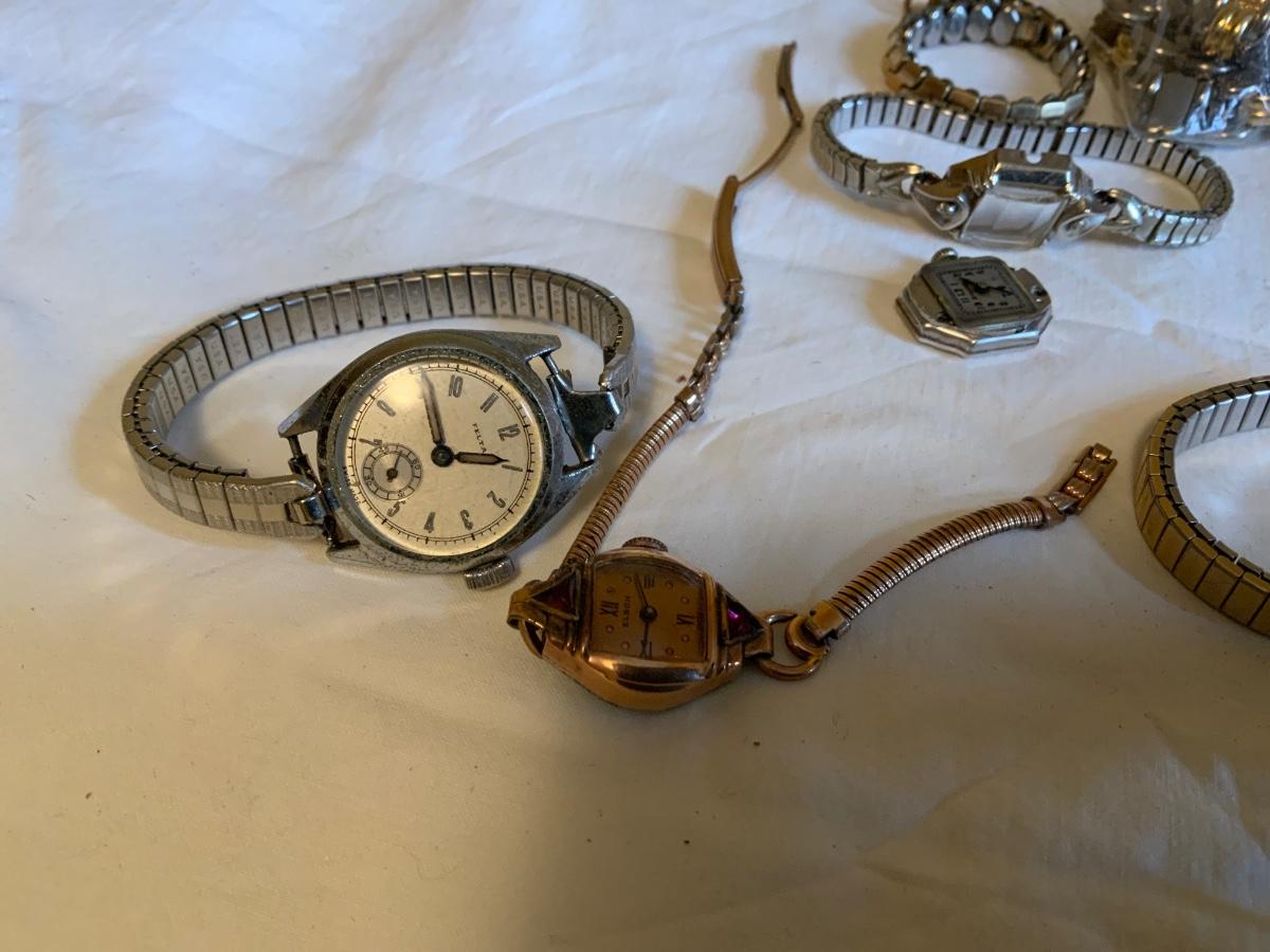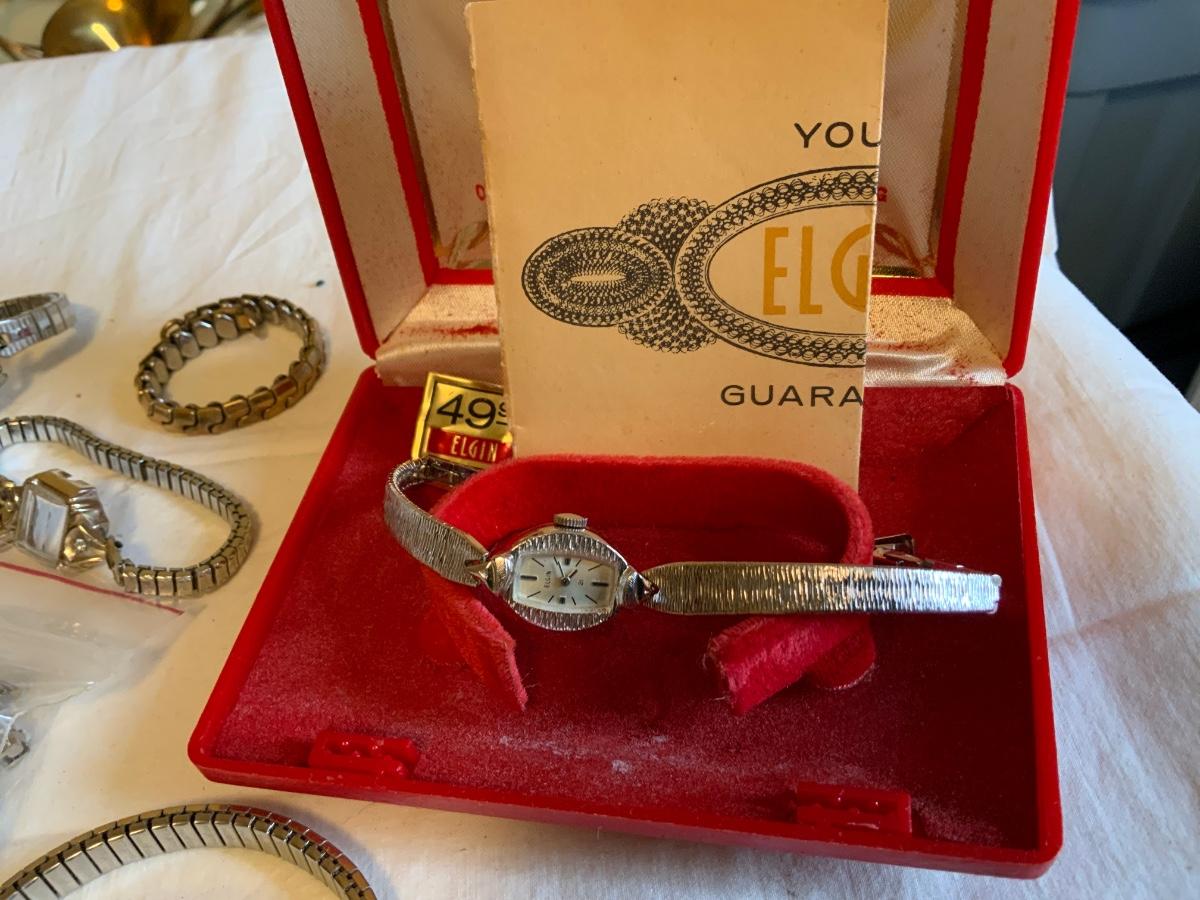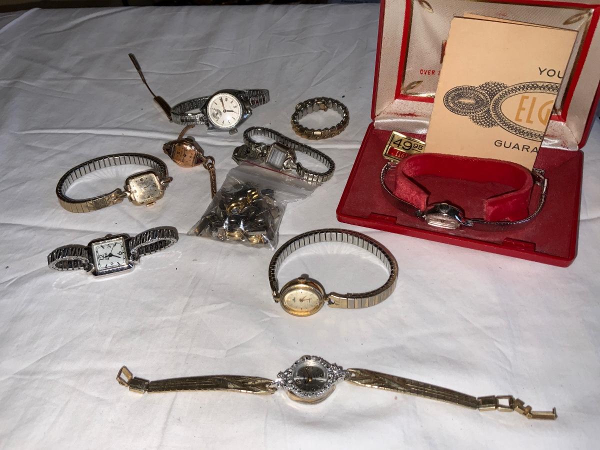 Nice lot of vintage watches and watch pieces. Elgin with original box and guarantee card., Lorus, Eastman and Elbon to name a few. Please see pics for condition. Not guaranteed to be in working condition.