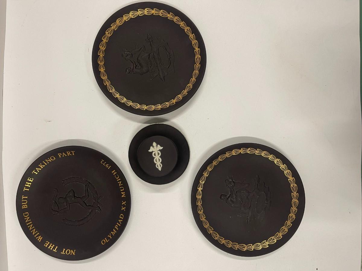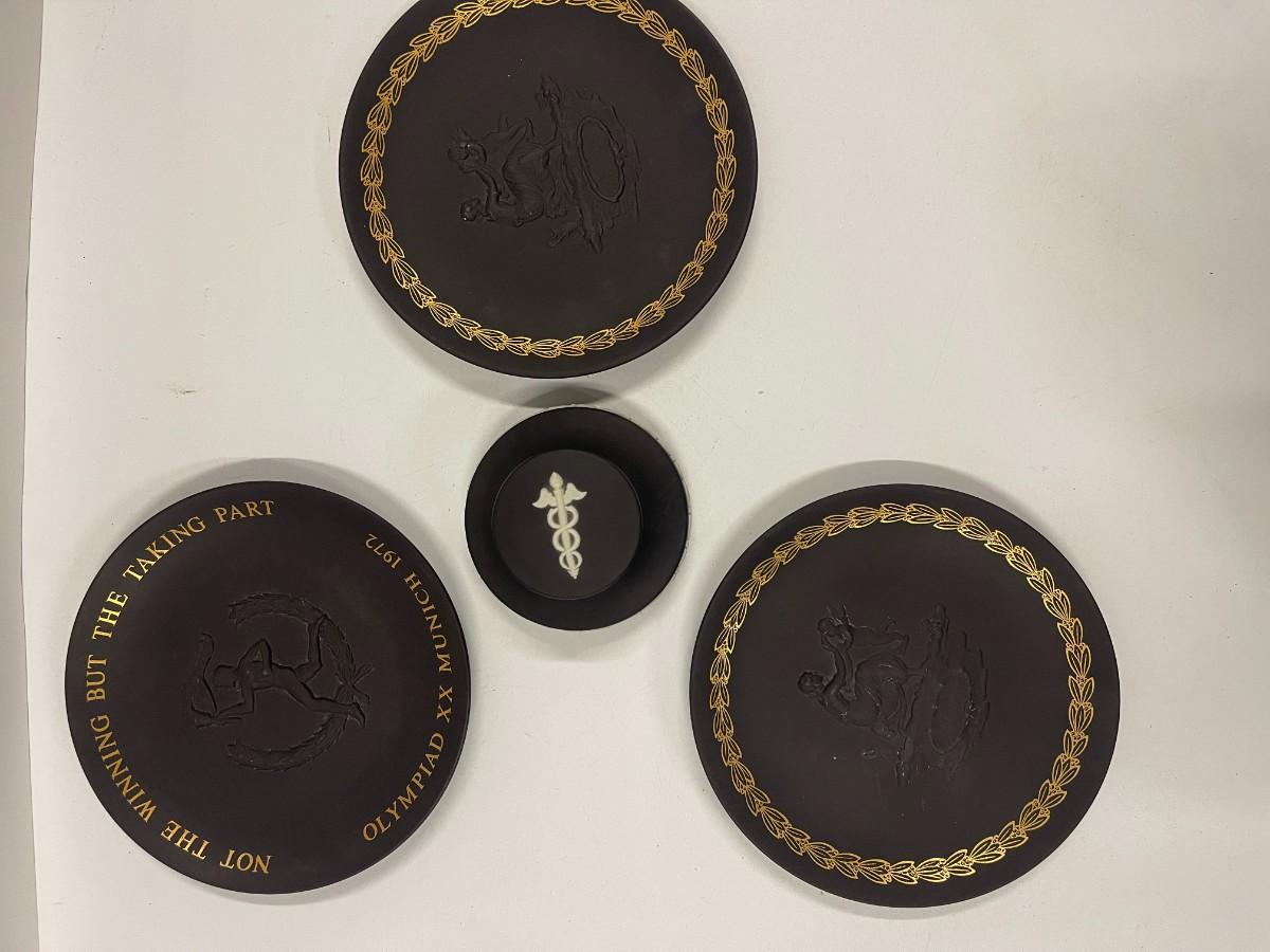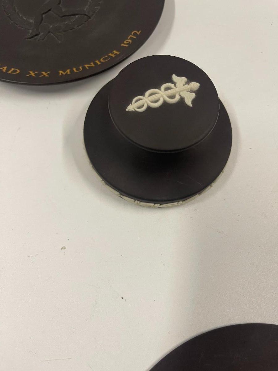Lot of Vintage Wedgwood Basalt Jasperware. Includes two identical mother's day plates, a Wedgwood collector's society doctor paperweight and a Munich olympics collector's plate. Plates are each approx 6 1/4"