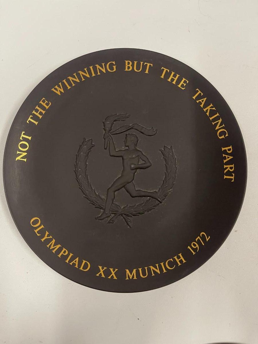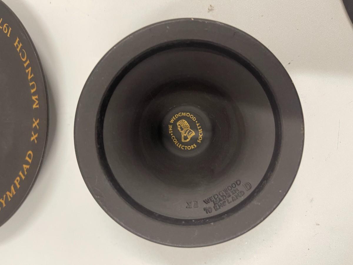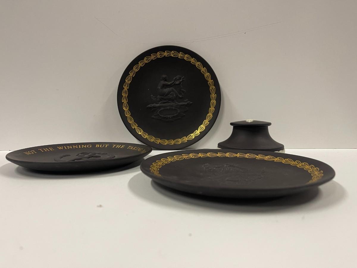 Lot of Vintage Wedgwood Basalt Jasperware. Includes two identical mother's day plates, a Wedgwood collector's society doctor paperweight and a Munich olympics collector's plate. Plates are each approx 6 1/4"