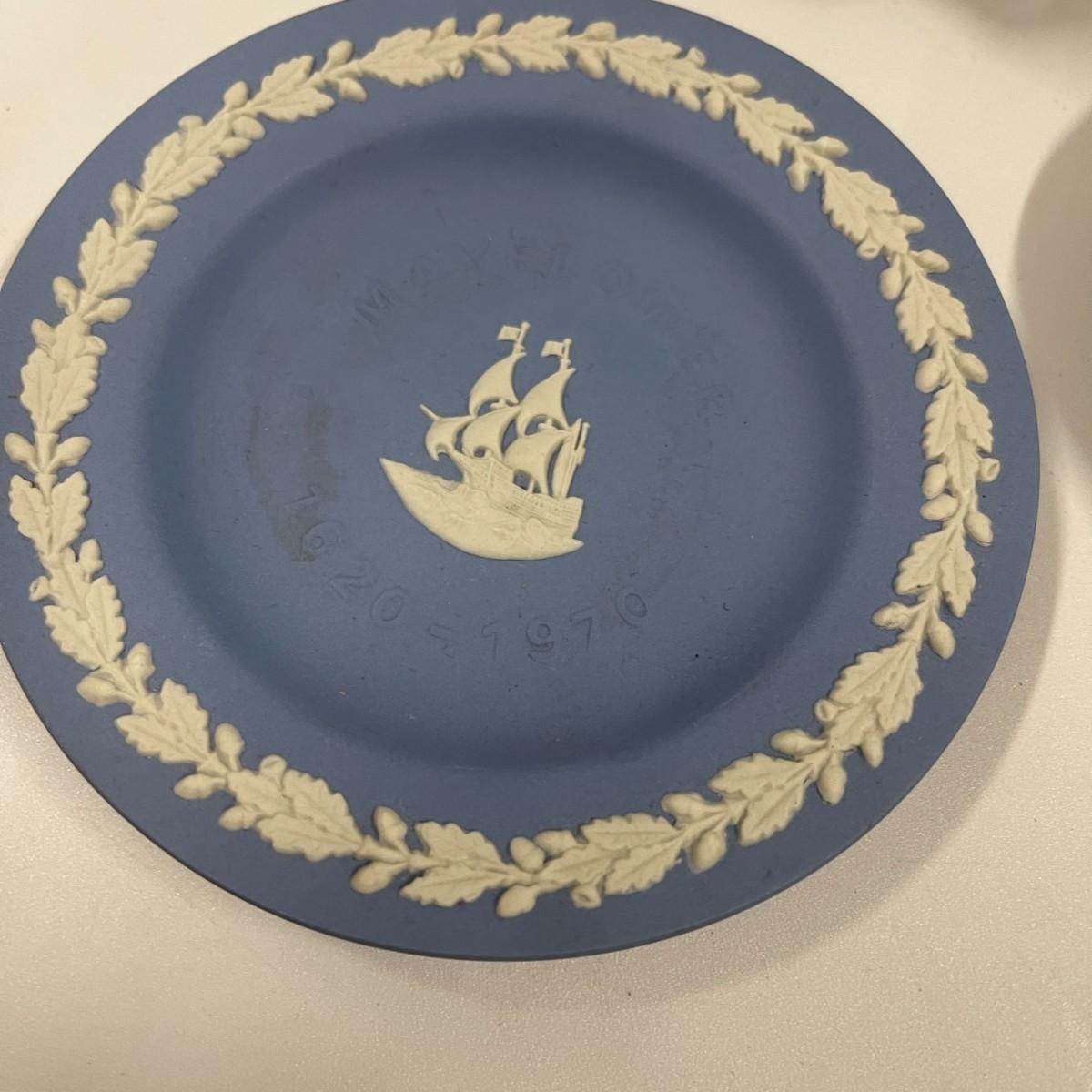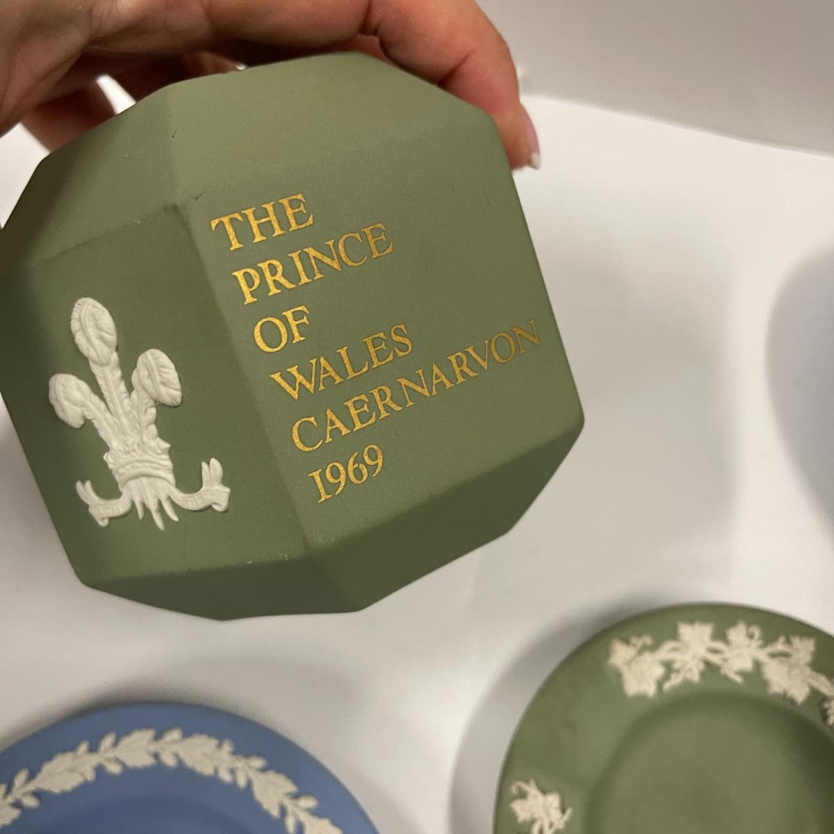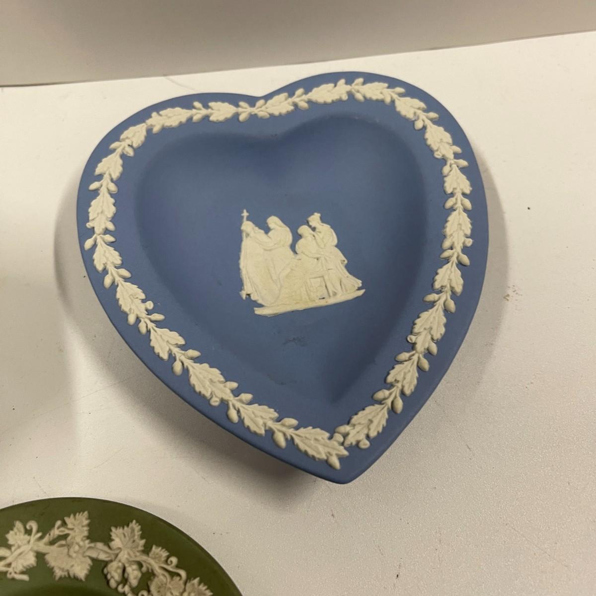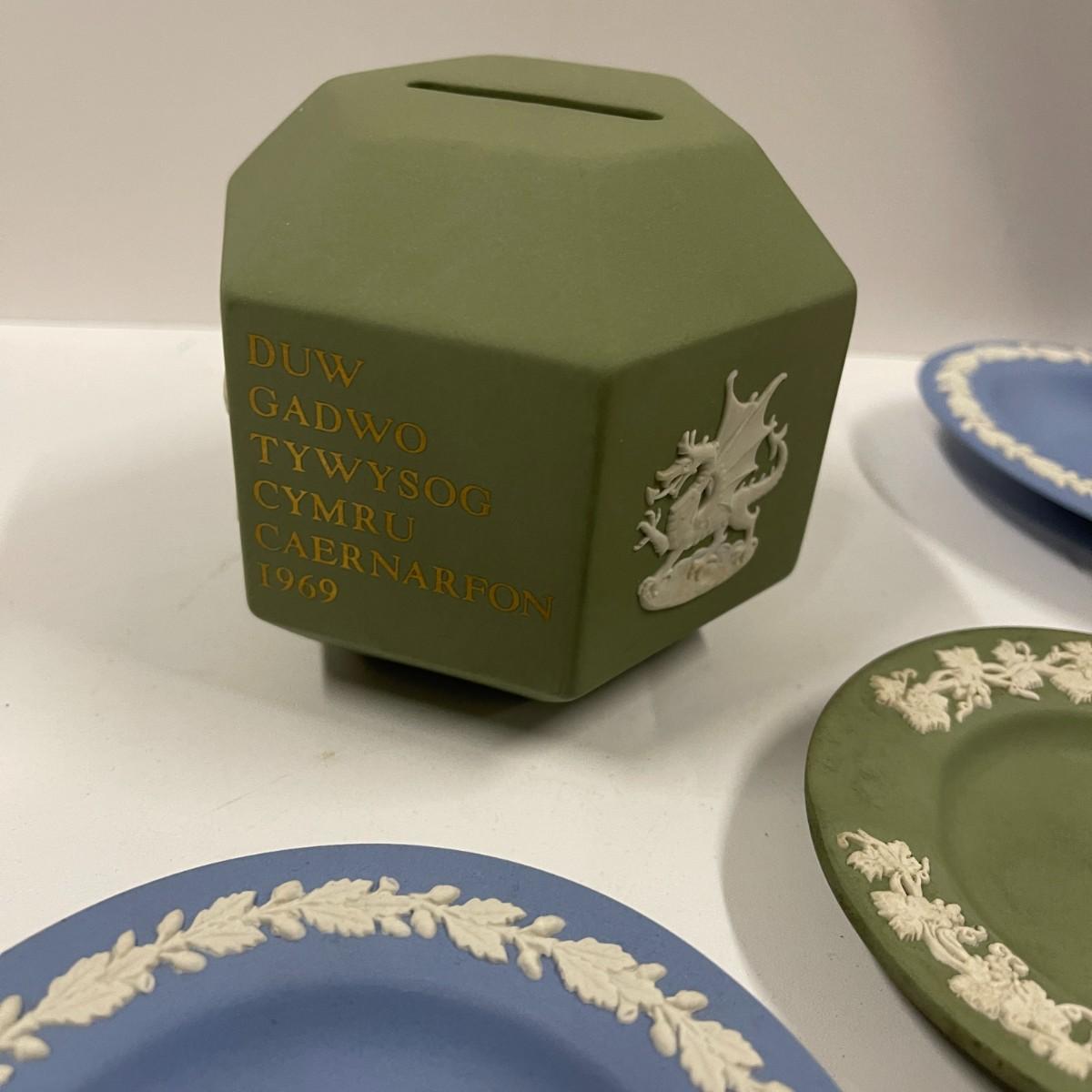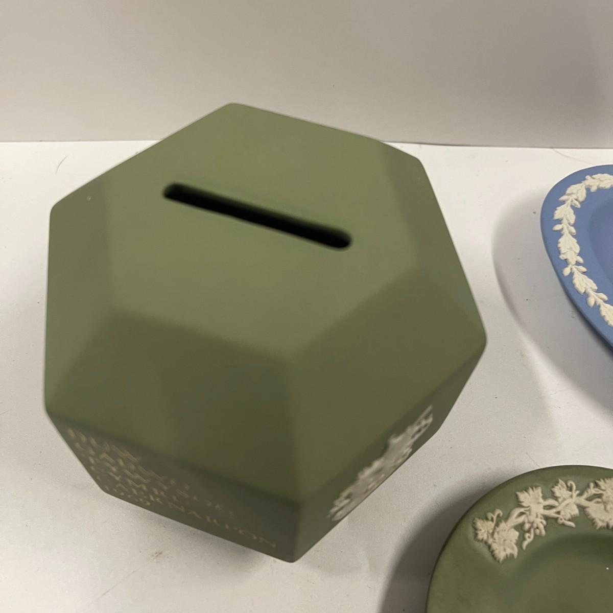 Lot of Wedgwood blue and green Jasperware trinket dishes and coin bank.