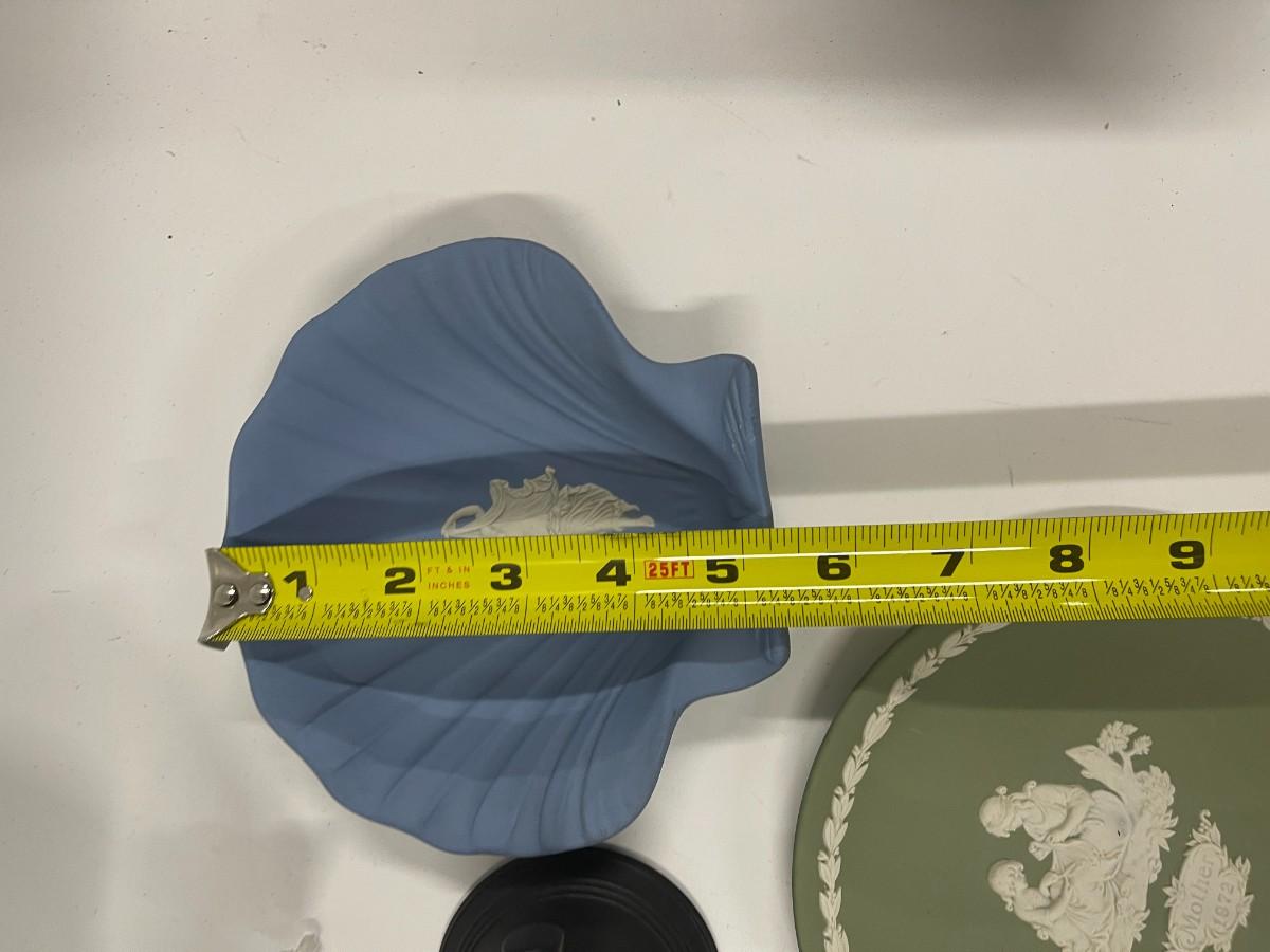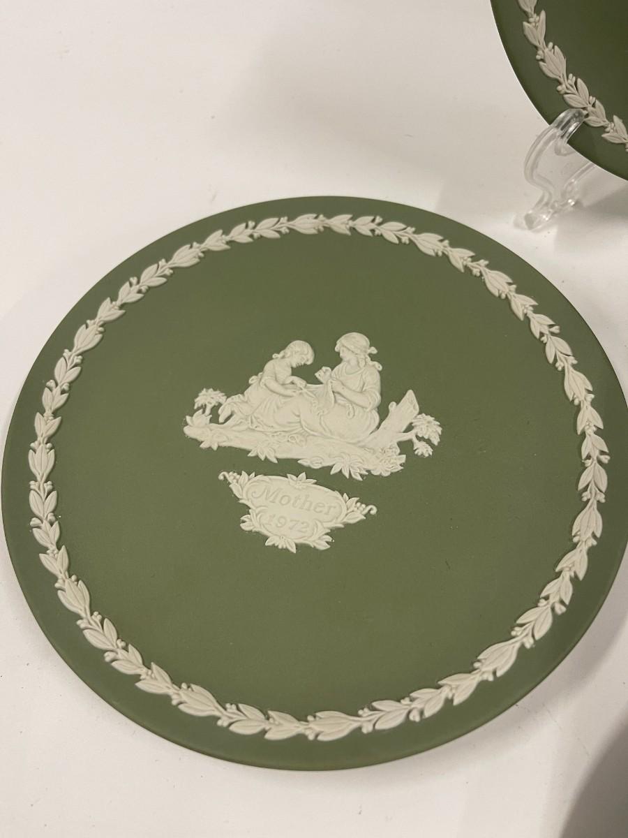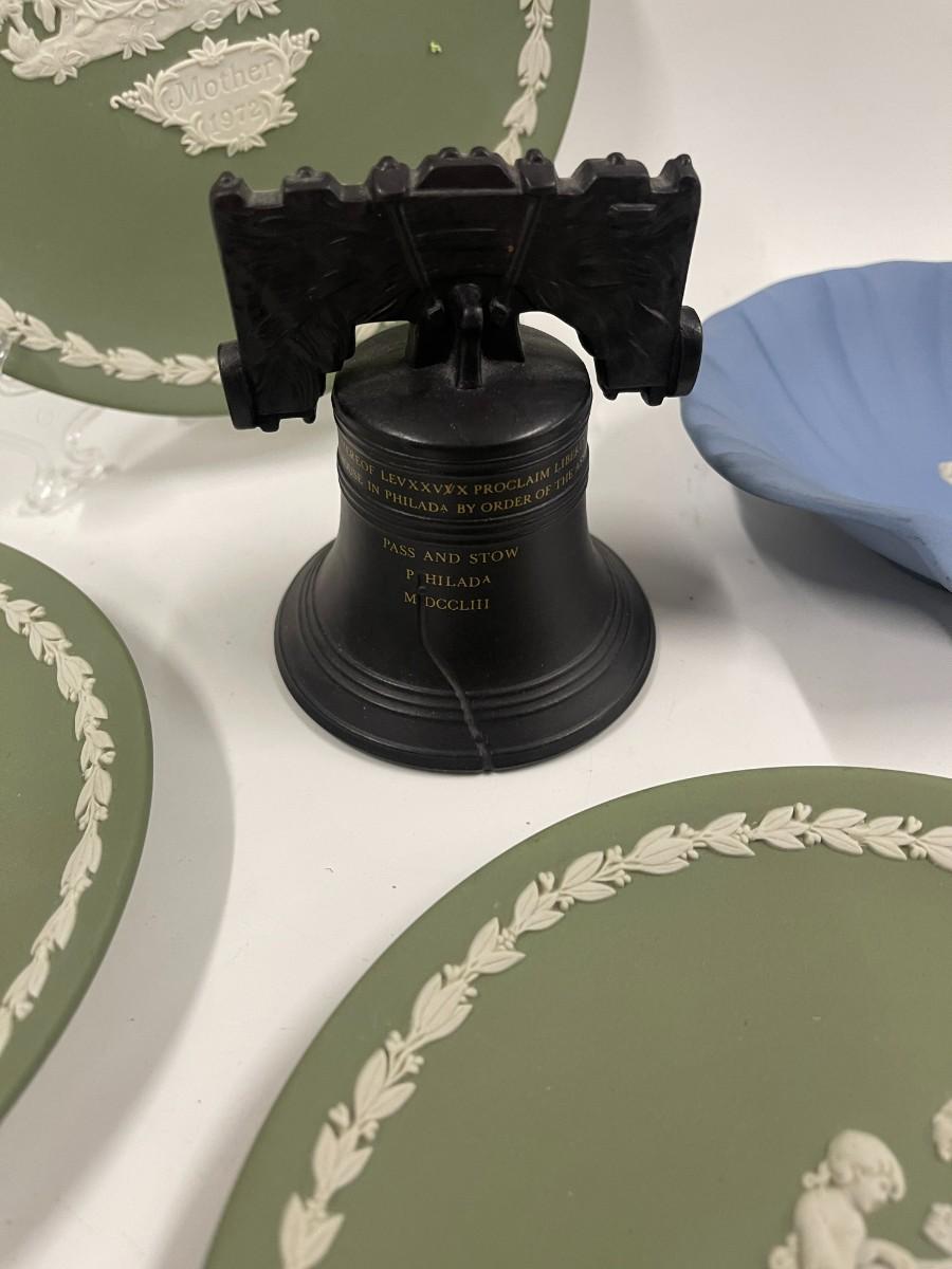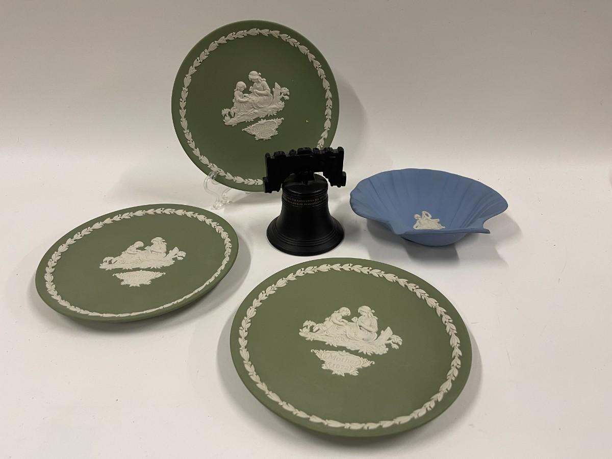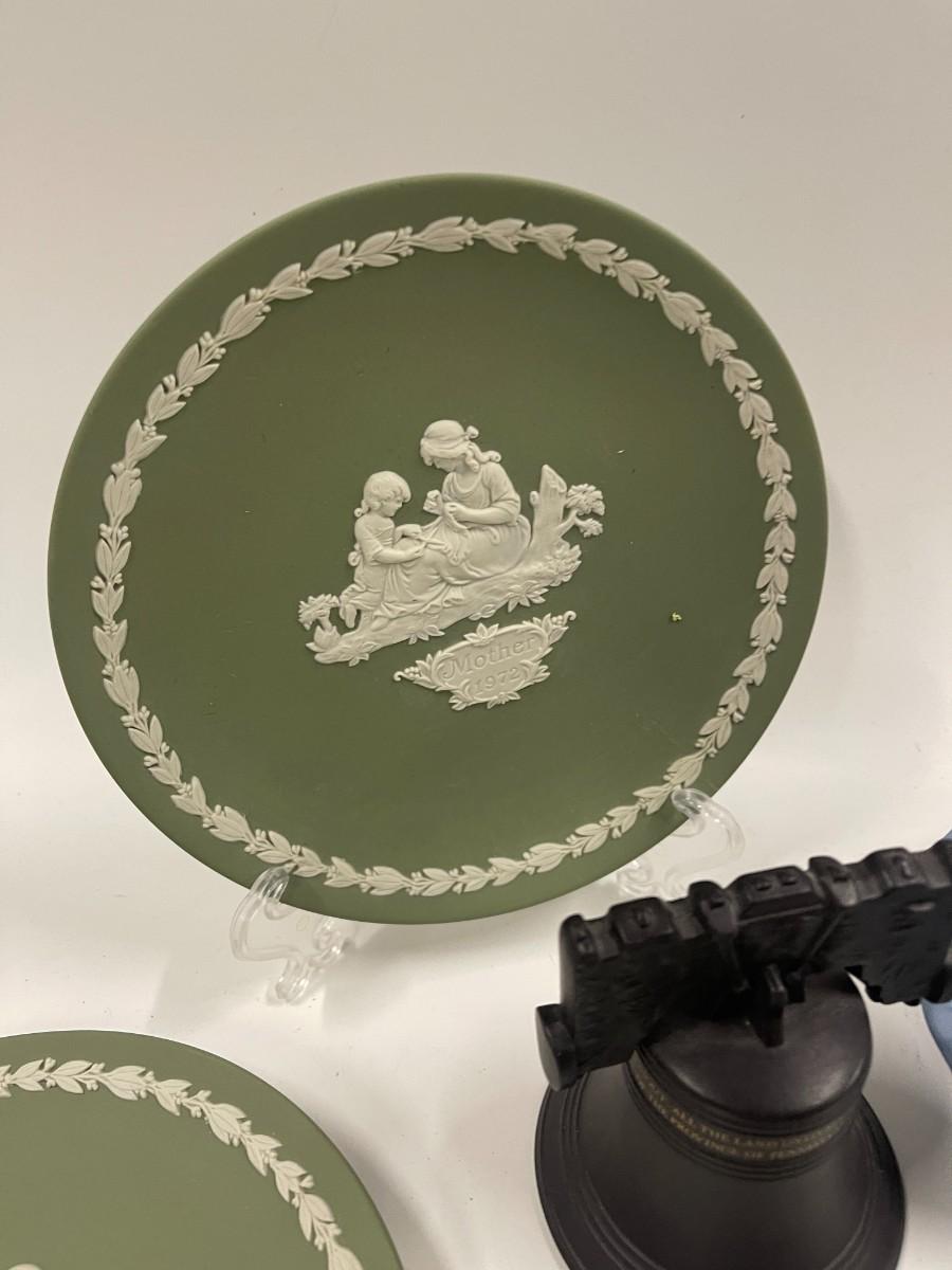 Lot of Wedgwood Jasperware Porcelain. Includes 3 green Jasperware Mother's Day plates, 1 Wedgwood Blue shell dish and 1 basalt liberty bell circa late 1960's