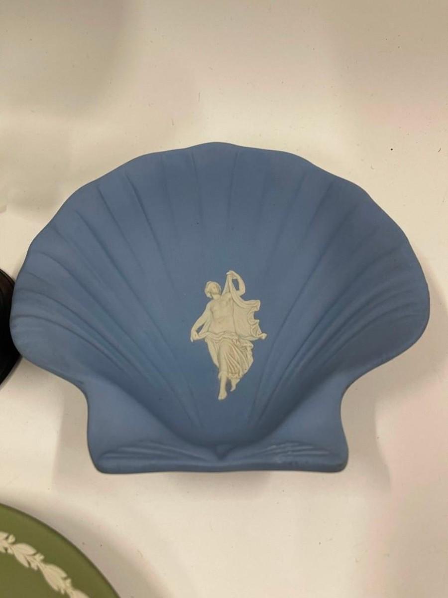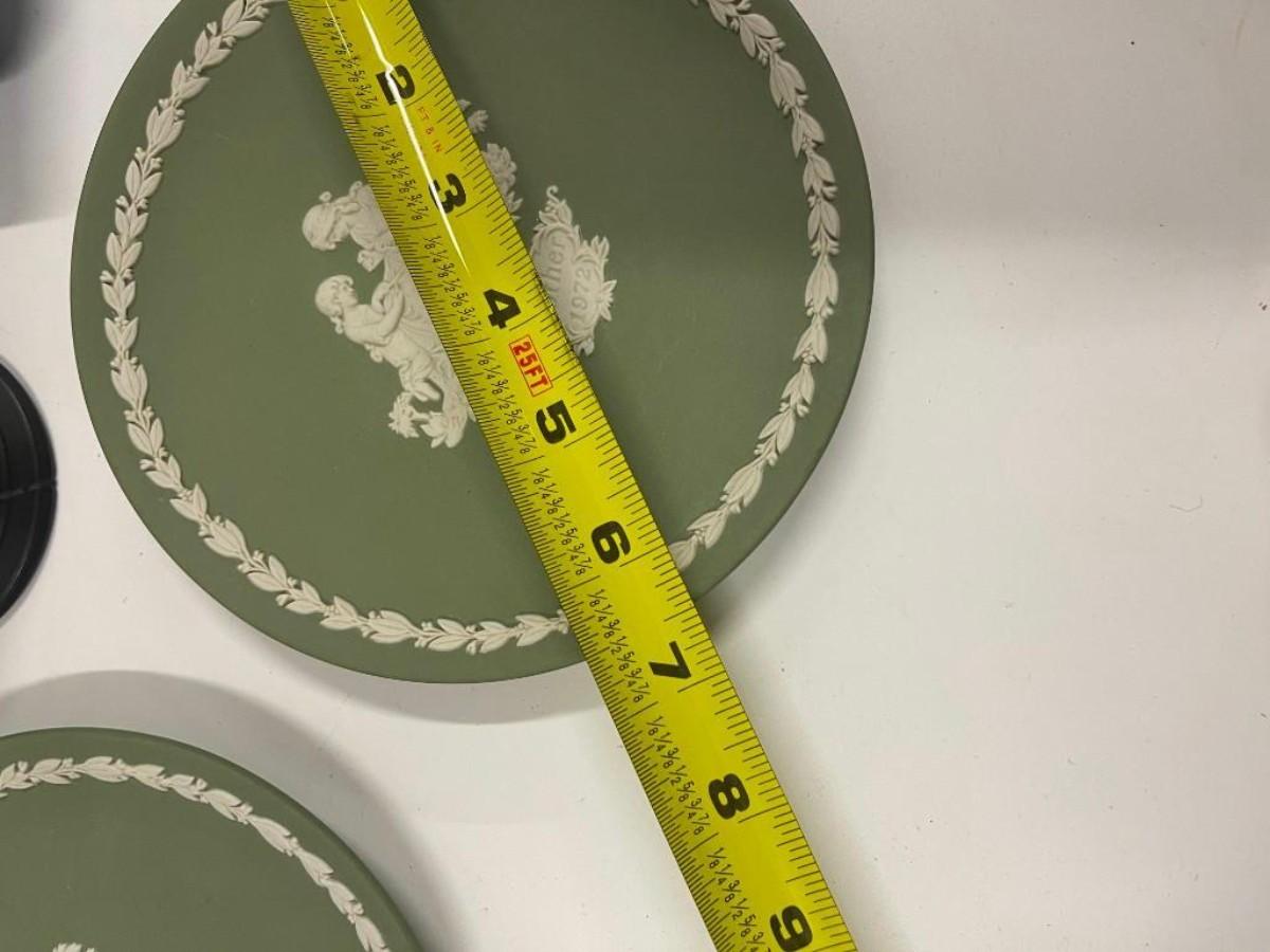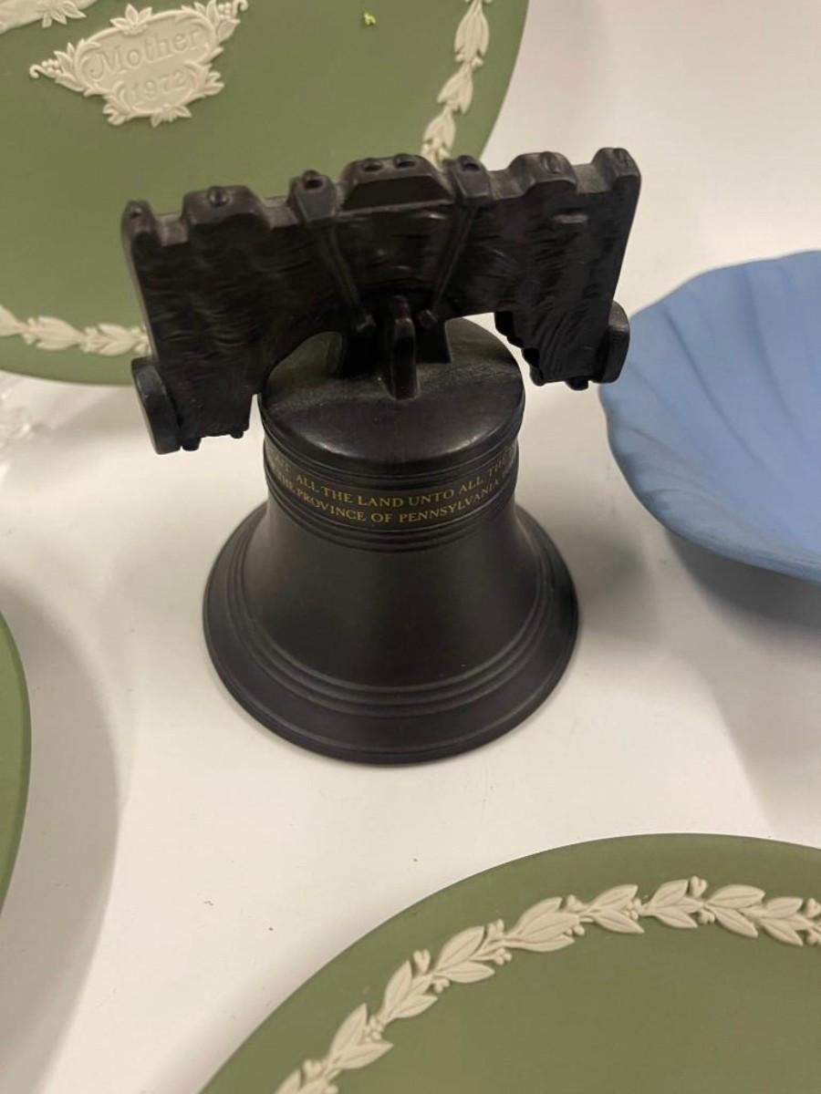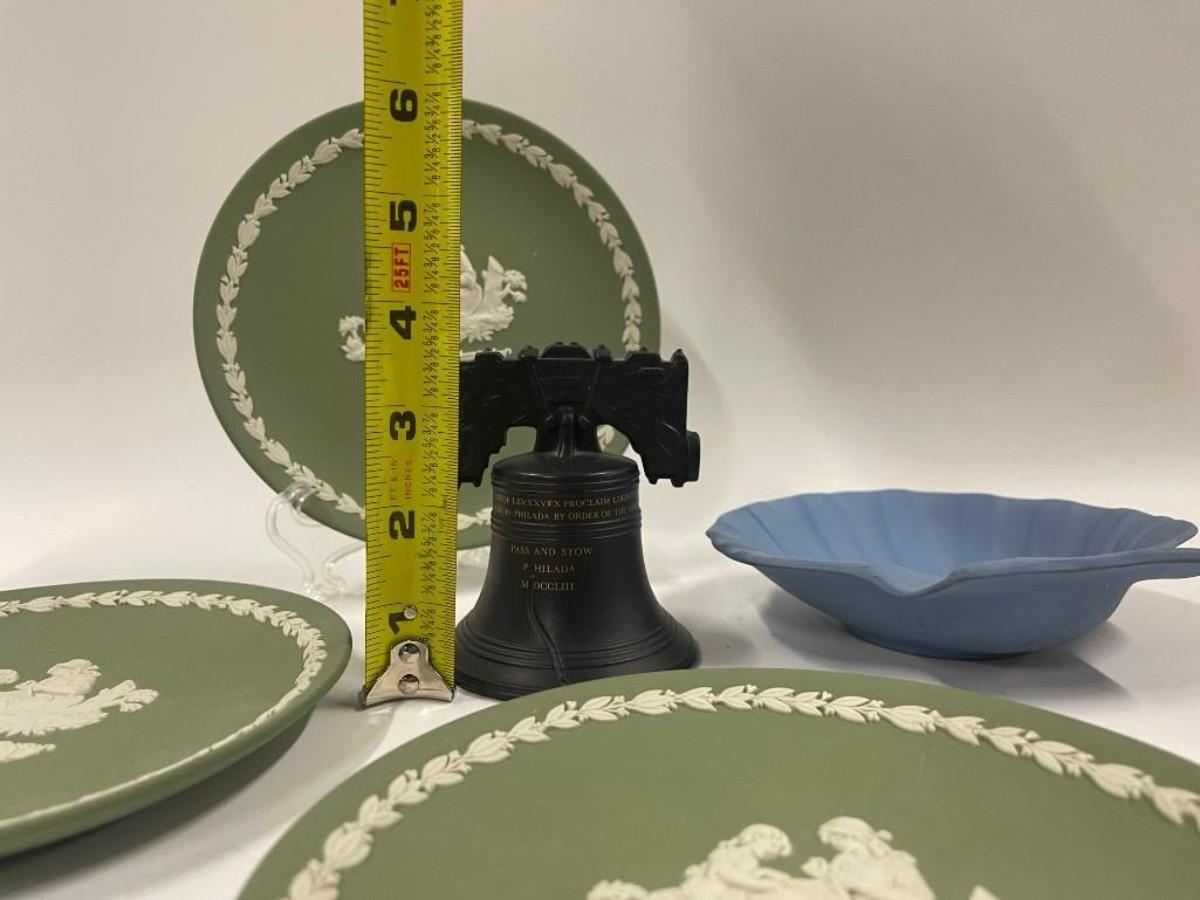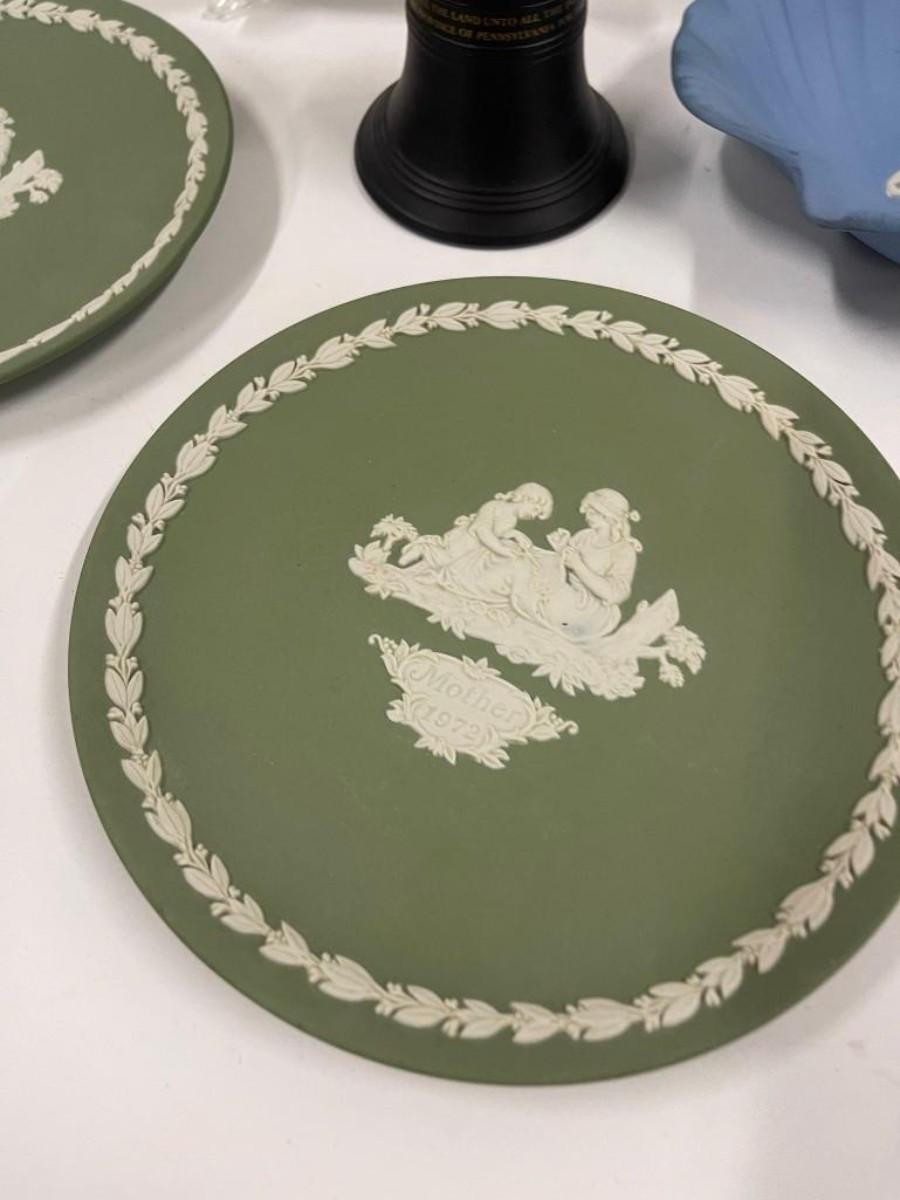 Lot of Wedgwood Jasperware Porcelain. Includes 3 green Jasperware Mother's Day plates, 1 Wedgwood Blue shell dish and 1 basalt liberty bell circa late 1960's