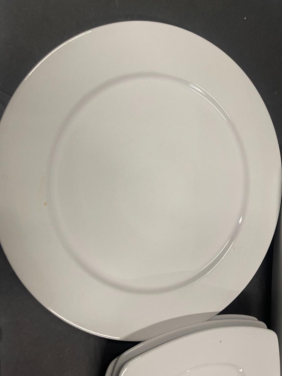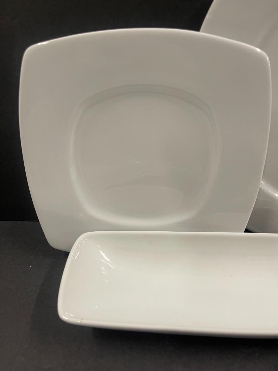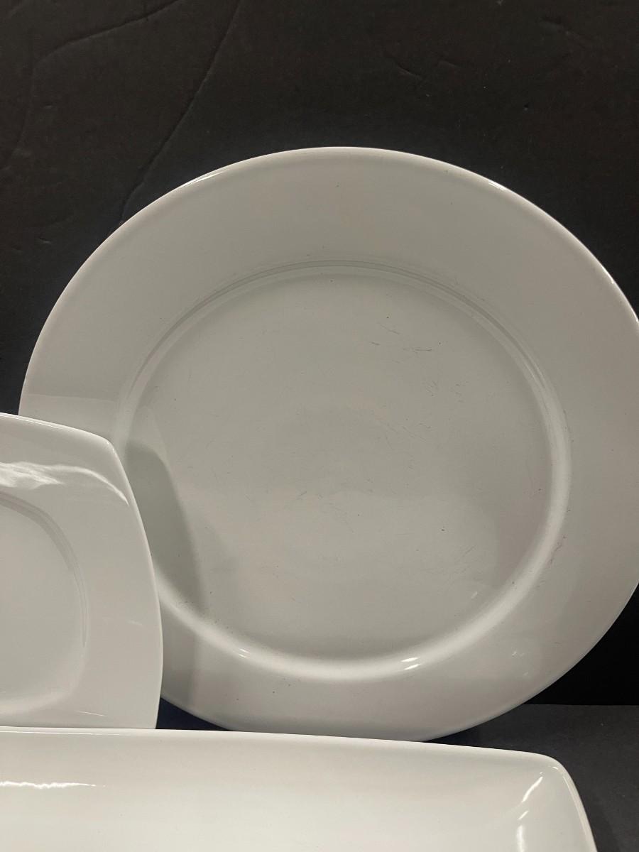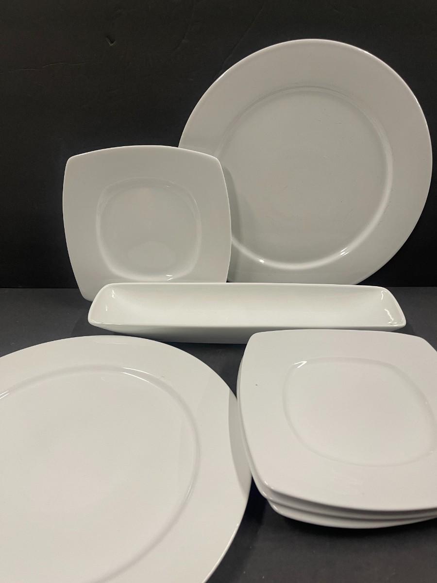 Includes 4 square Pier One plates, 2 Epoch white chargers/platters, one white olive dish