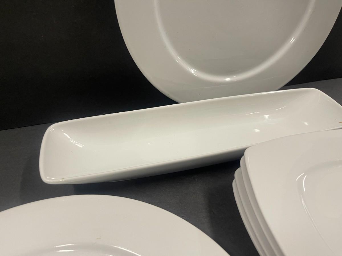 Includes 4 square Pier One plates, 2 Epoch white chargers/platters, one white olive dish