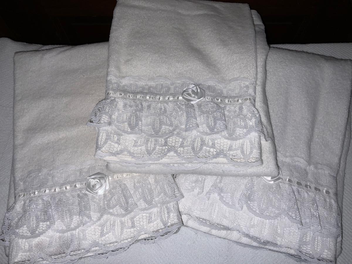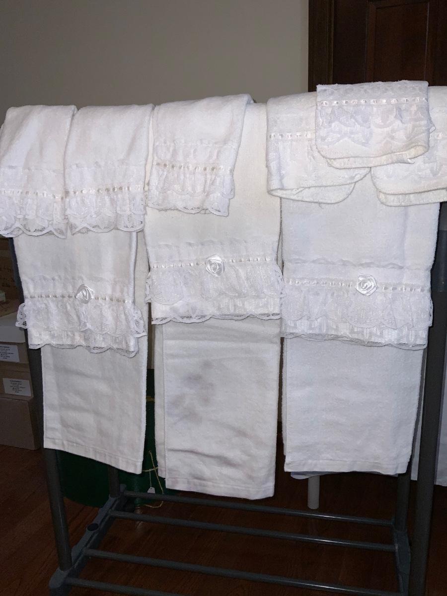 Lot of White Lace Trimmed Bath Towel Sets. # of each Bath, Hand and washcloth. Please note some staining is present.