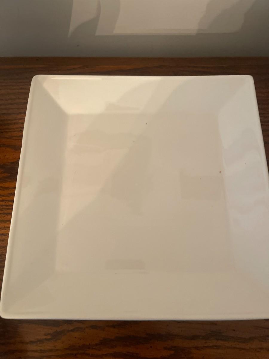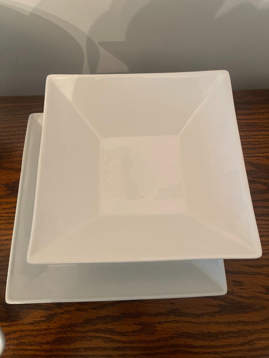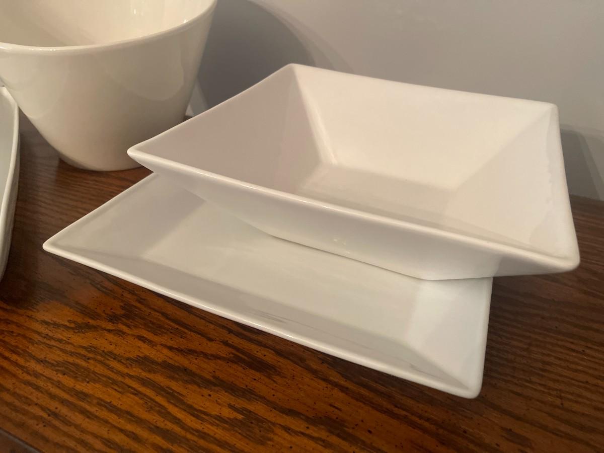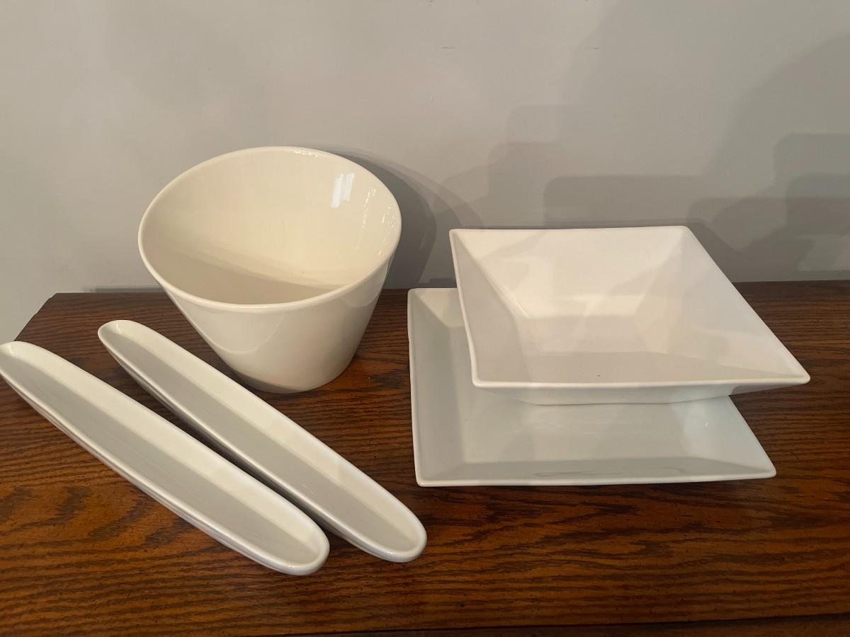 Lot of White Porcelain Serving Pieces: Includes Round serving bowl, square bowl, square platter and 2 olive dishes.