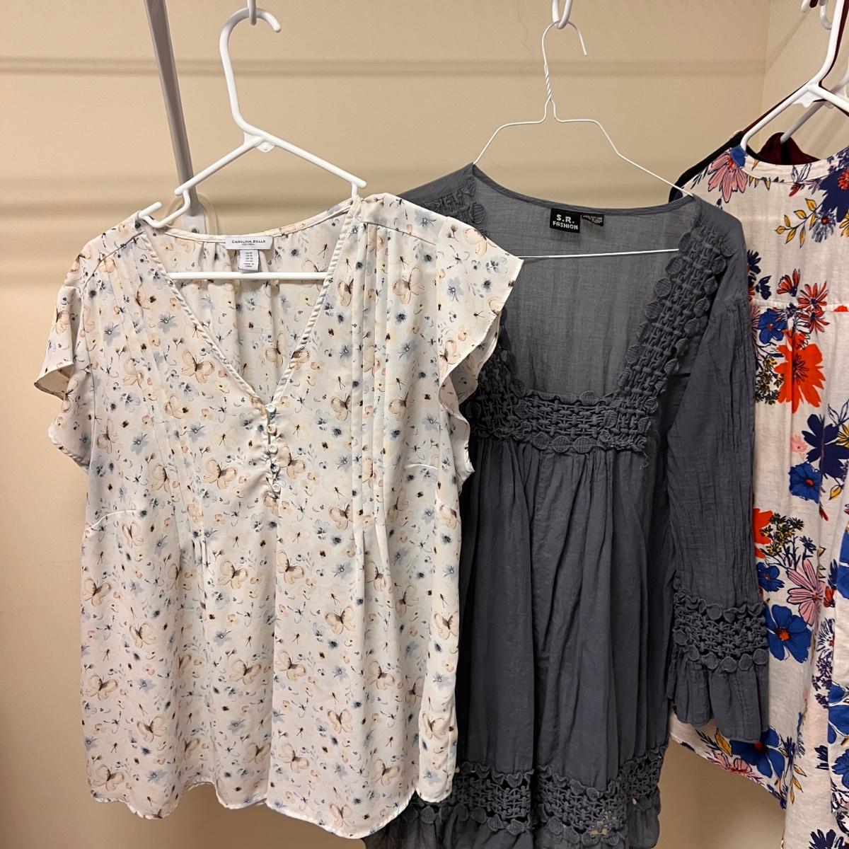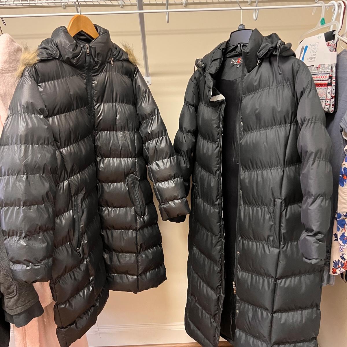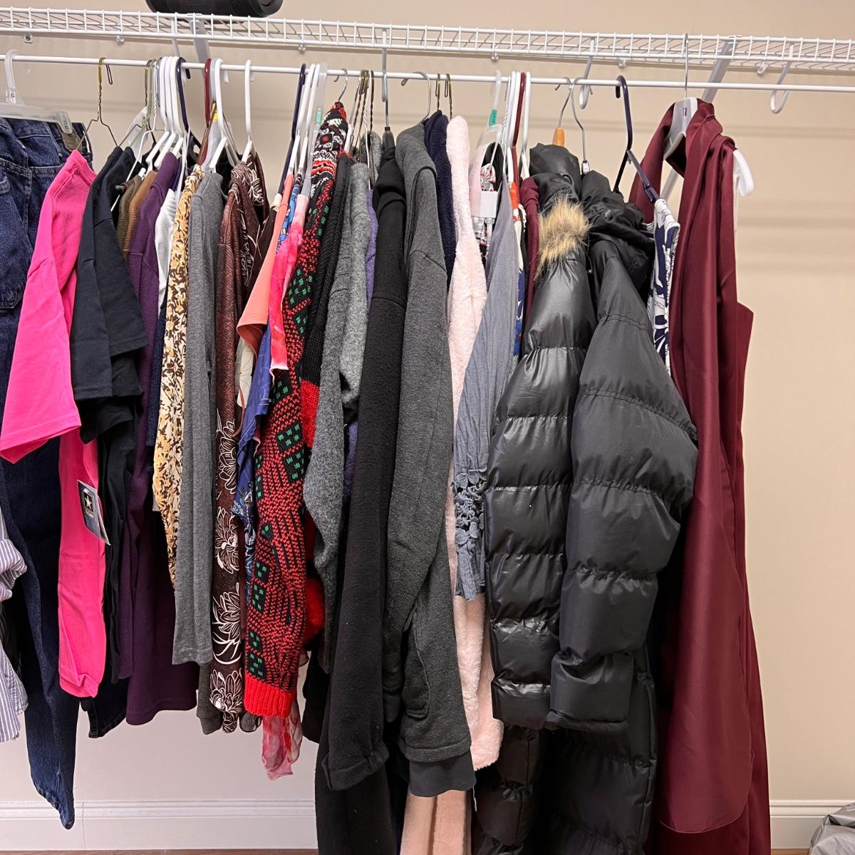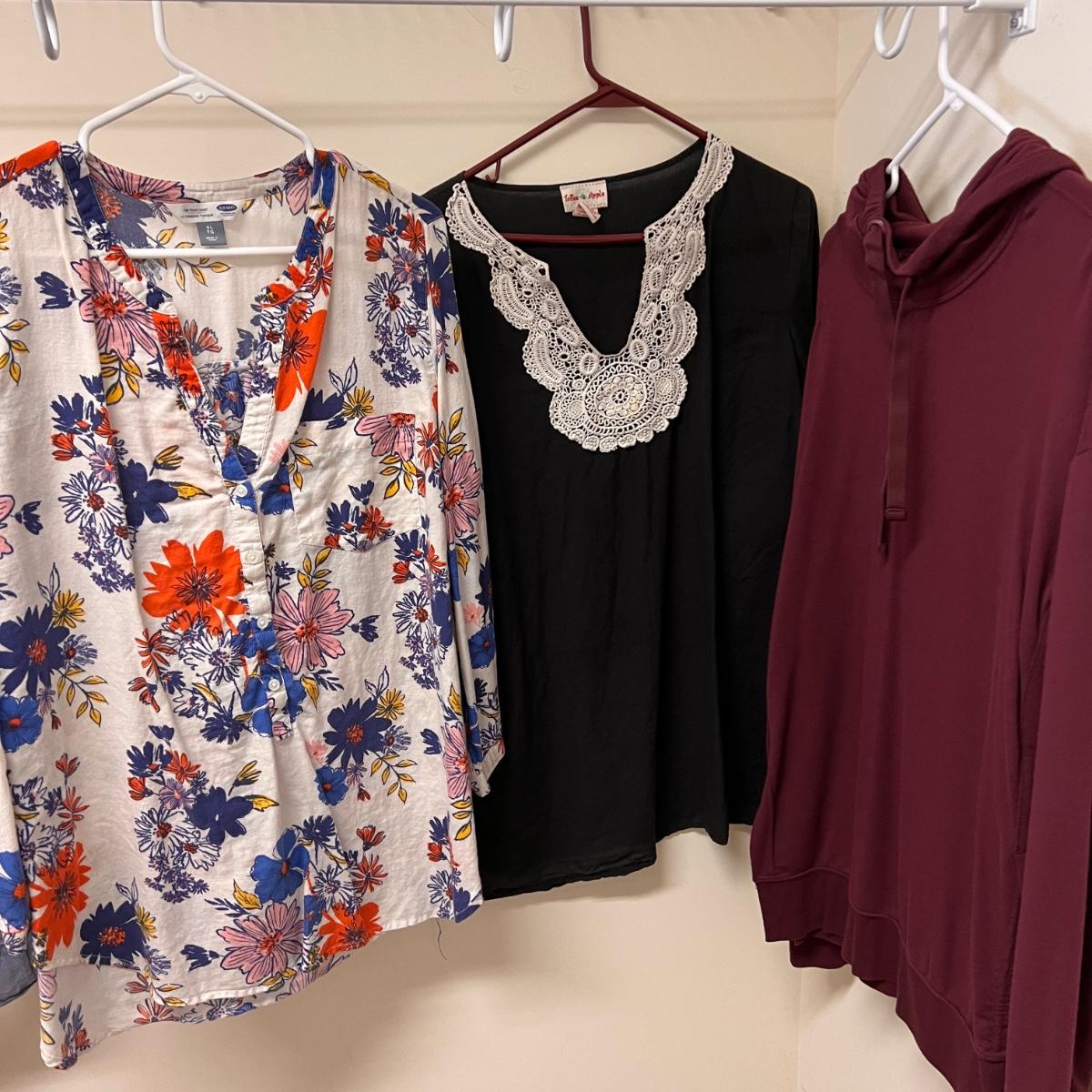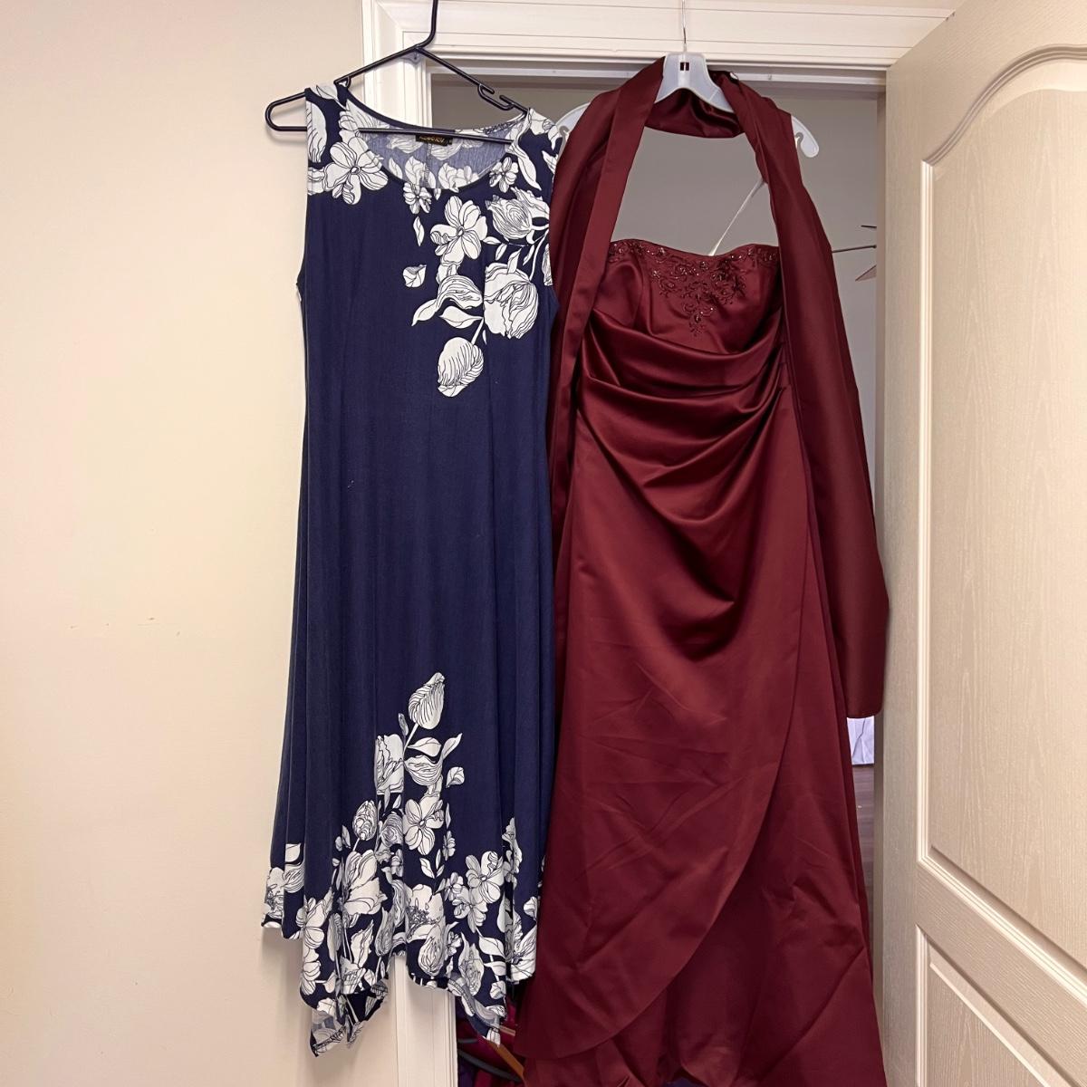 Lot of women’s clothing including athletic clothes, coats, long and shirt sleeve tops, dresses - 1 formal. Mostly size XL.