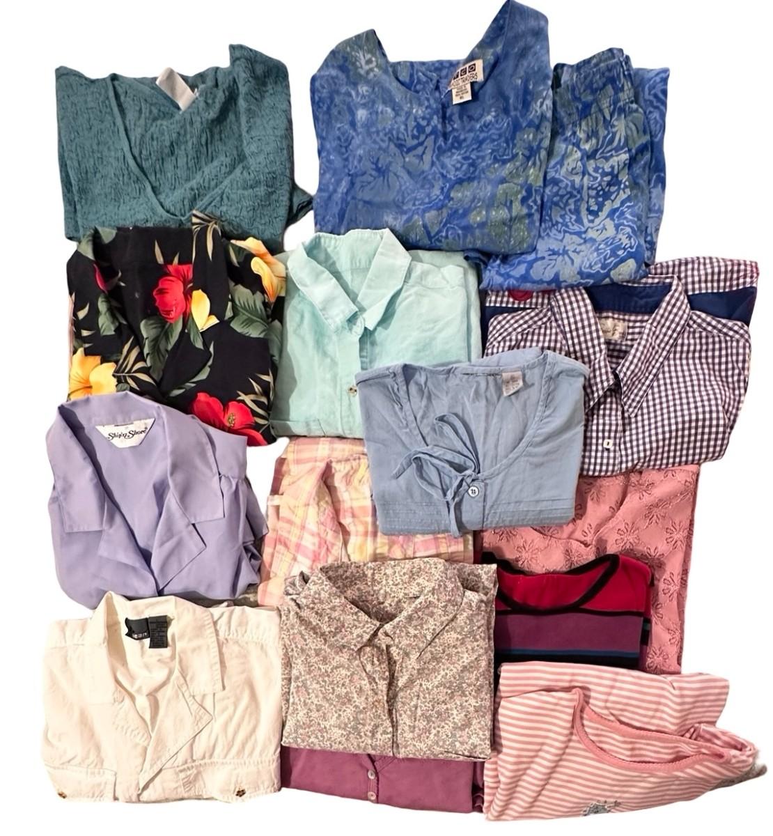 Lot of Women's Shirts/Tops/Blouses - mostly sizes Medium-Large+, many have tags removed. All in good wearable condition. The blues Nomadic Traders outfit is a top and skirt and super cute, size XL!