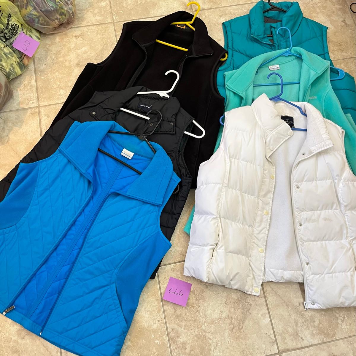 Clothing is all in good shape, no stains or wear damage! Please look at pictures for sizes. The white vest has discoloring. Not sure if it will clean up.