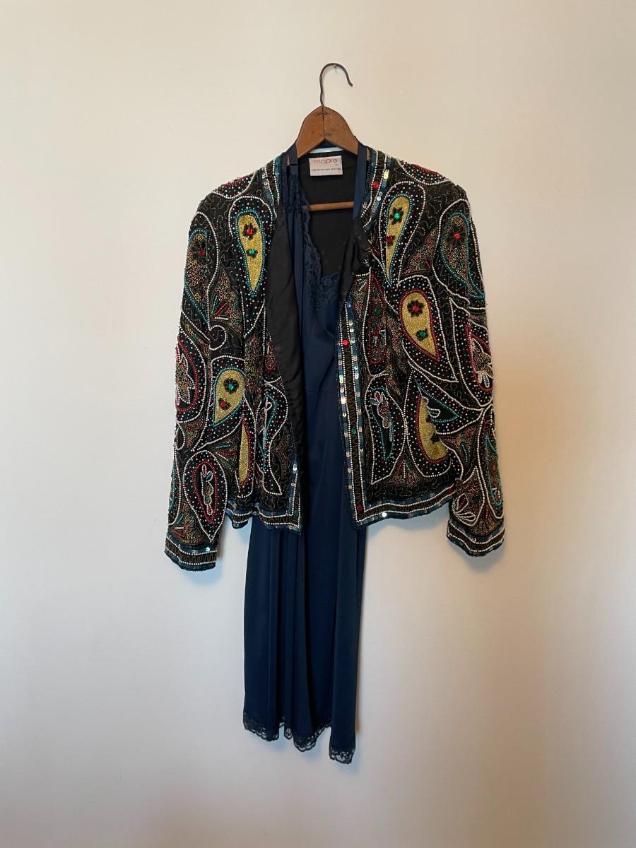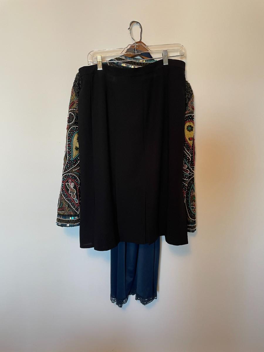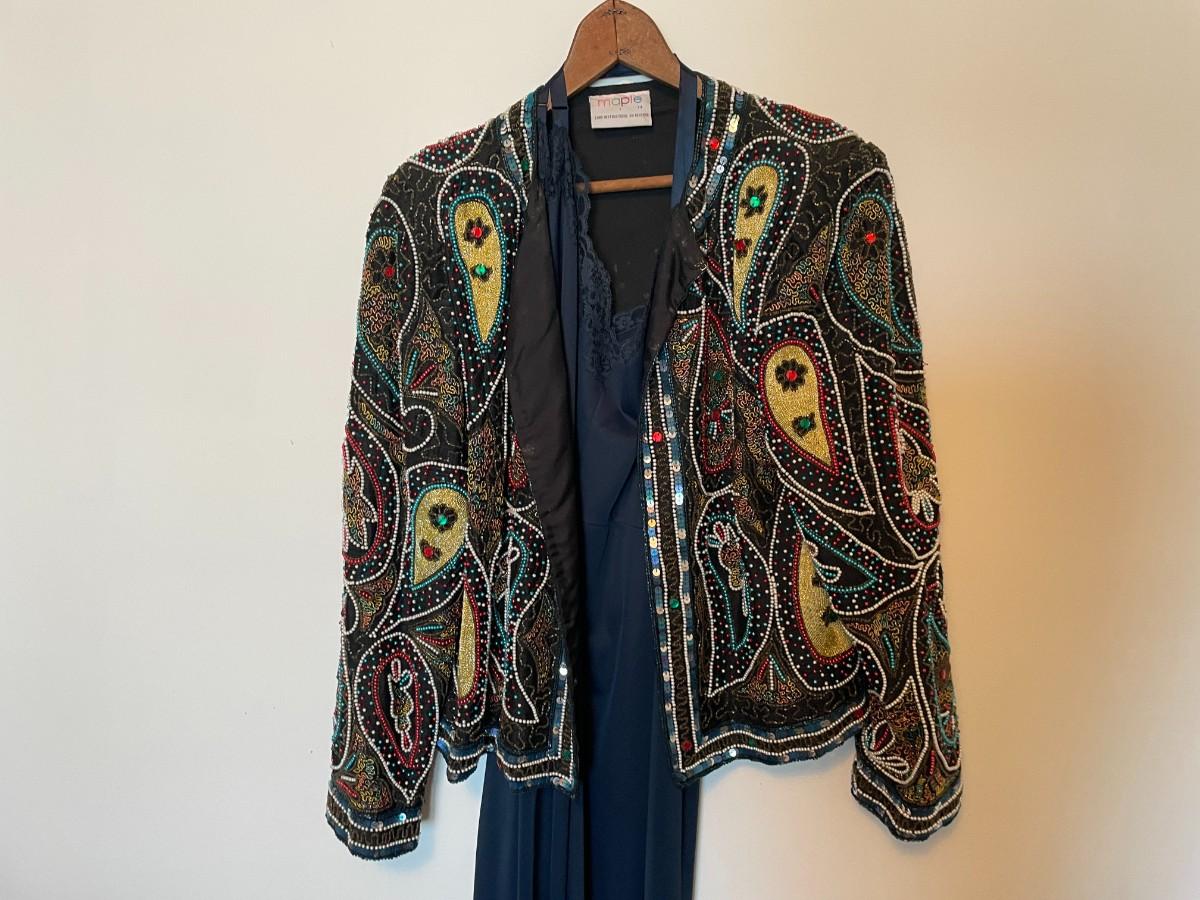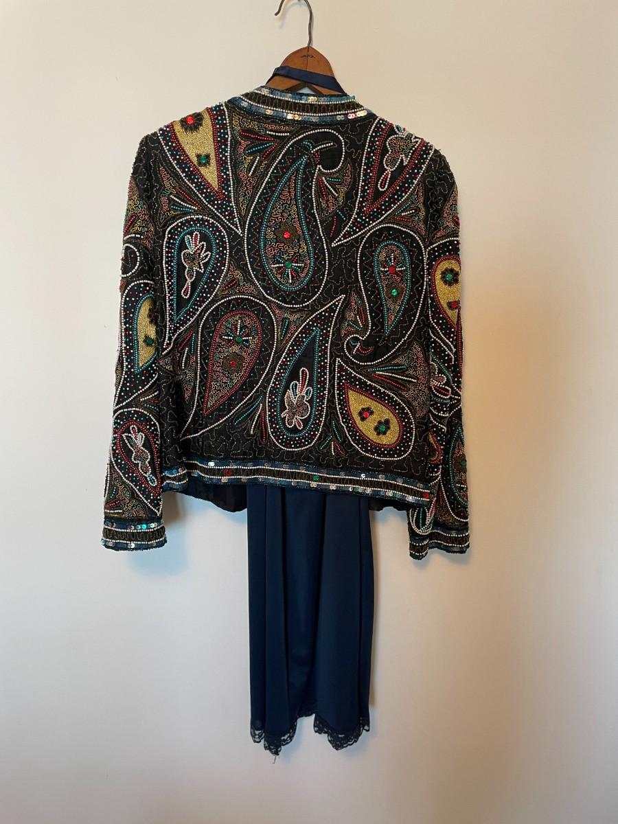 Beaded Jacket, Navy dress and Black Skirt. Size 14