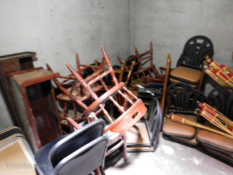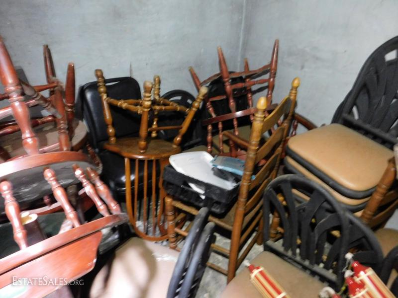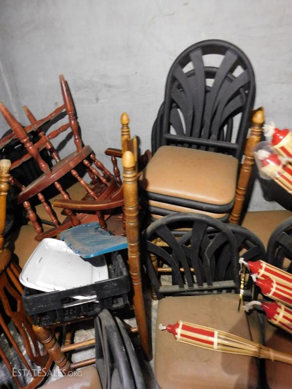 Lot of Wood and Metal Chairs in various condition. Some need work but all need cleaning. All chairs in this room that are table or restaurant related go with bid.