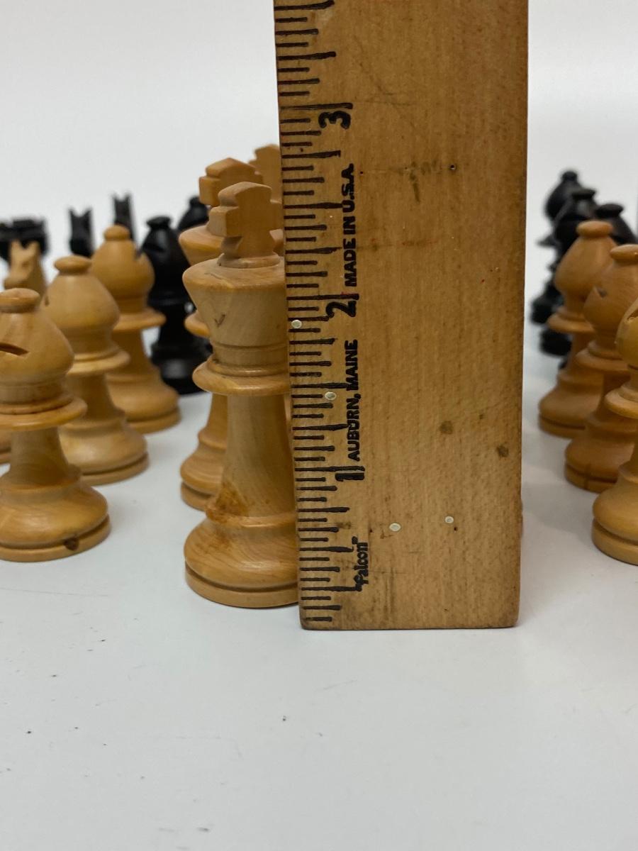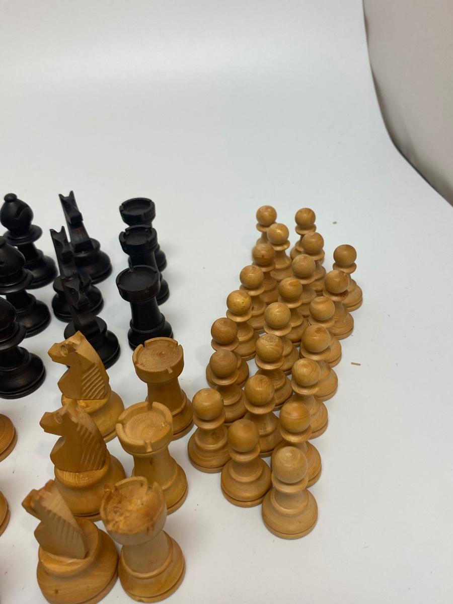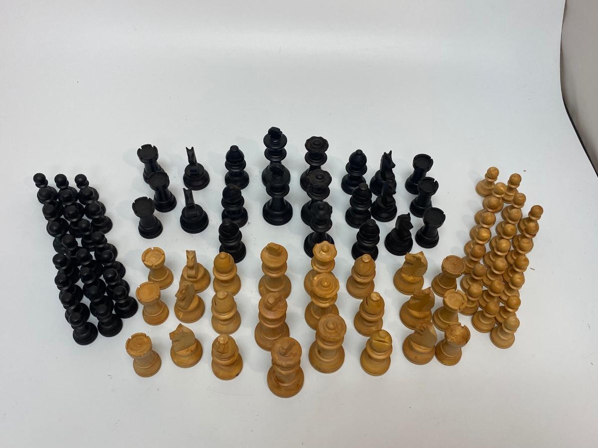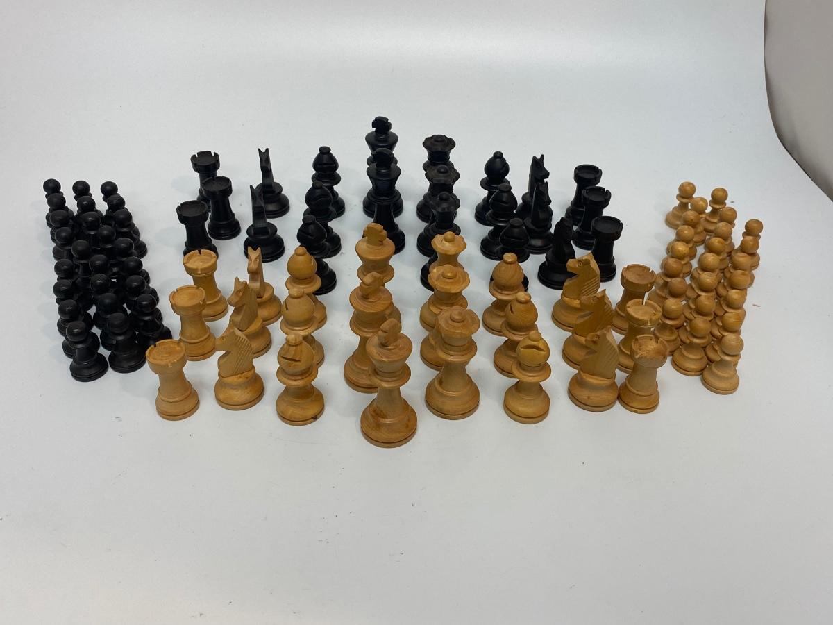Lor of carved wood chess pieces. Almost 3 complete sets. Great for playing chess or craft projects. Lightweight, under 3" size.
