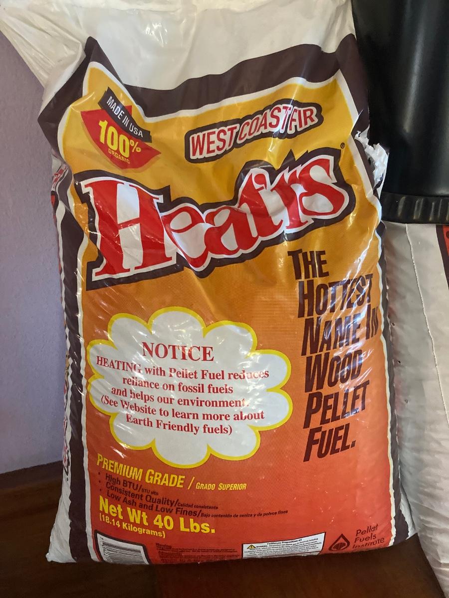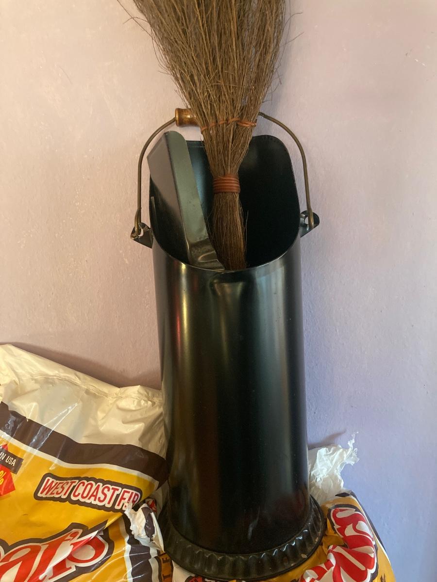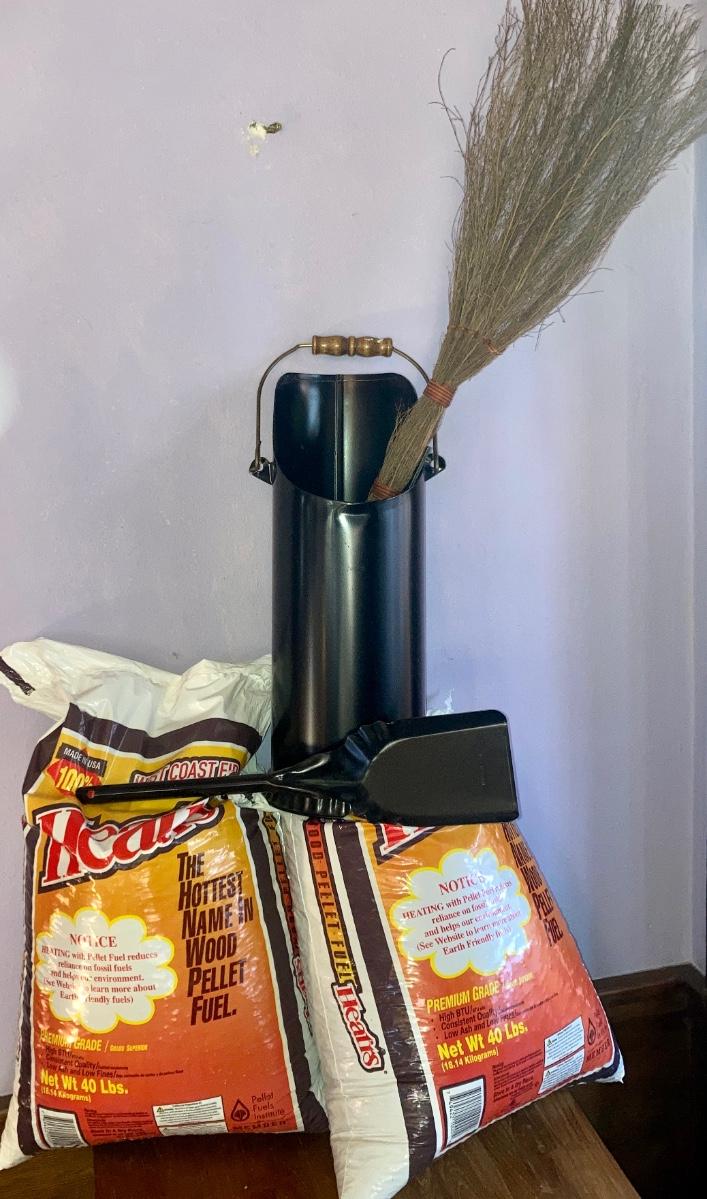 Lot includes 2 40lb bags of wood pellets, metal ash bucket with shovel and natural bristled broom.