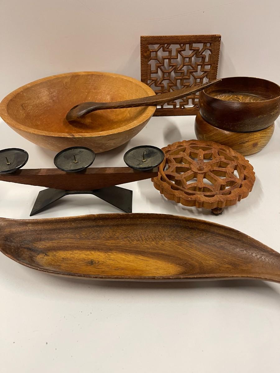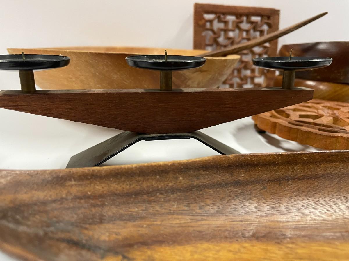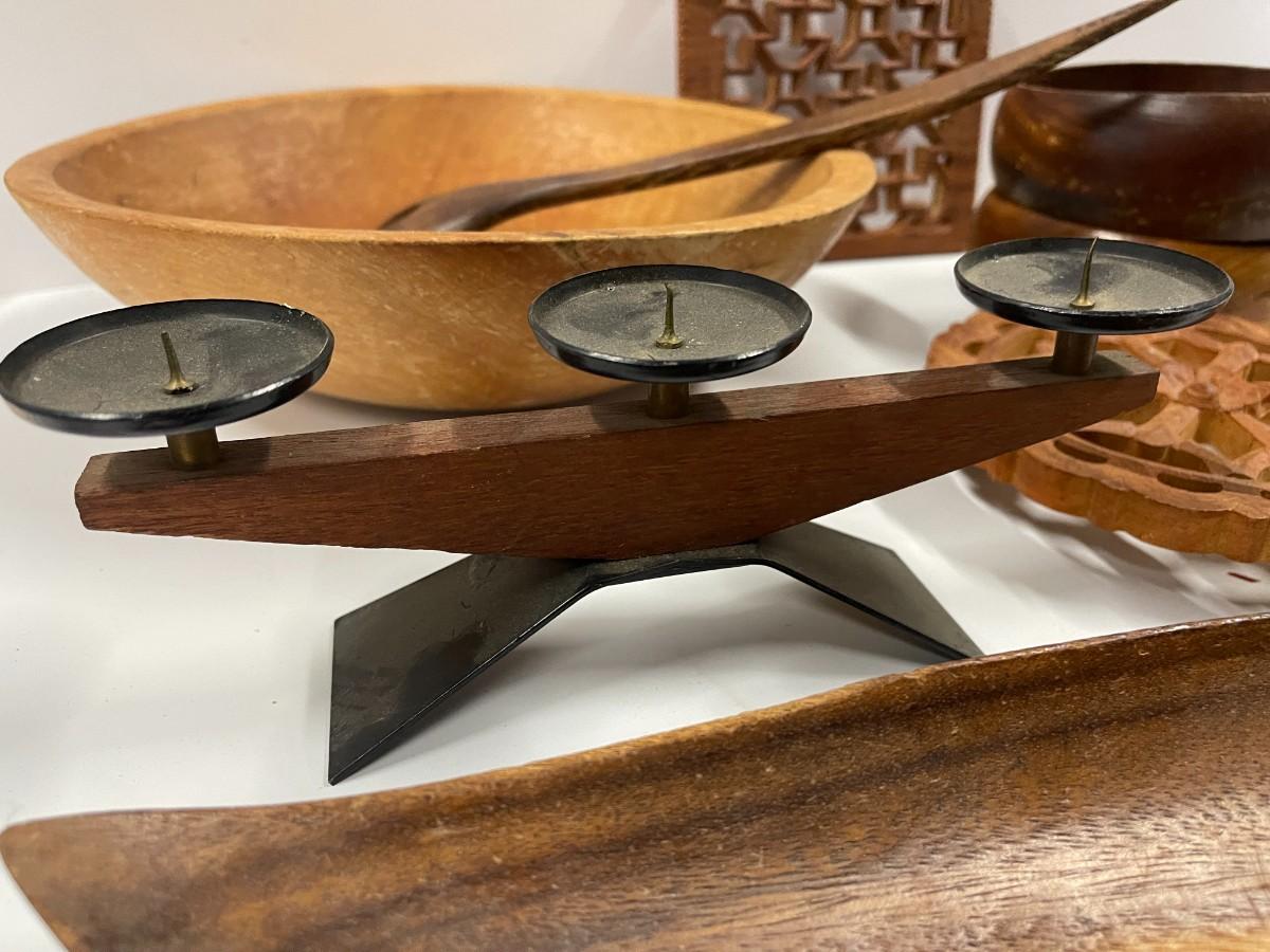 Please note that there is a matching serving spoon to the fork that didn't make it into the photos. Lot includes vintage dough bowl, two small salad bowls, vintage German modern candle holders, two wooden trivets, salad fork and spoon and oblong wooden dish.
