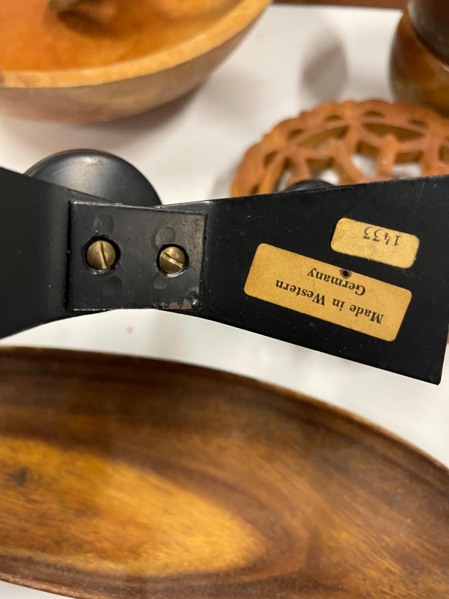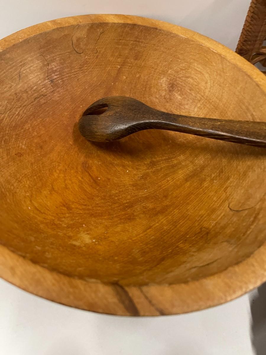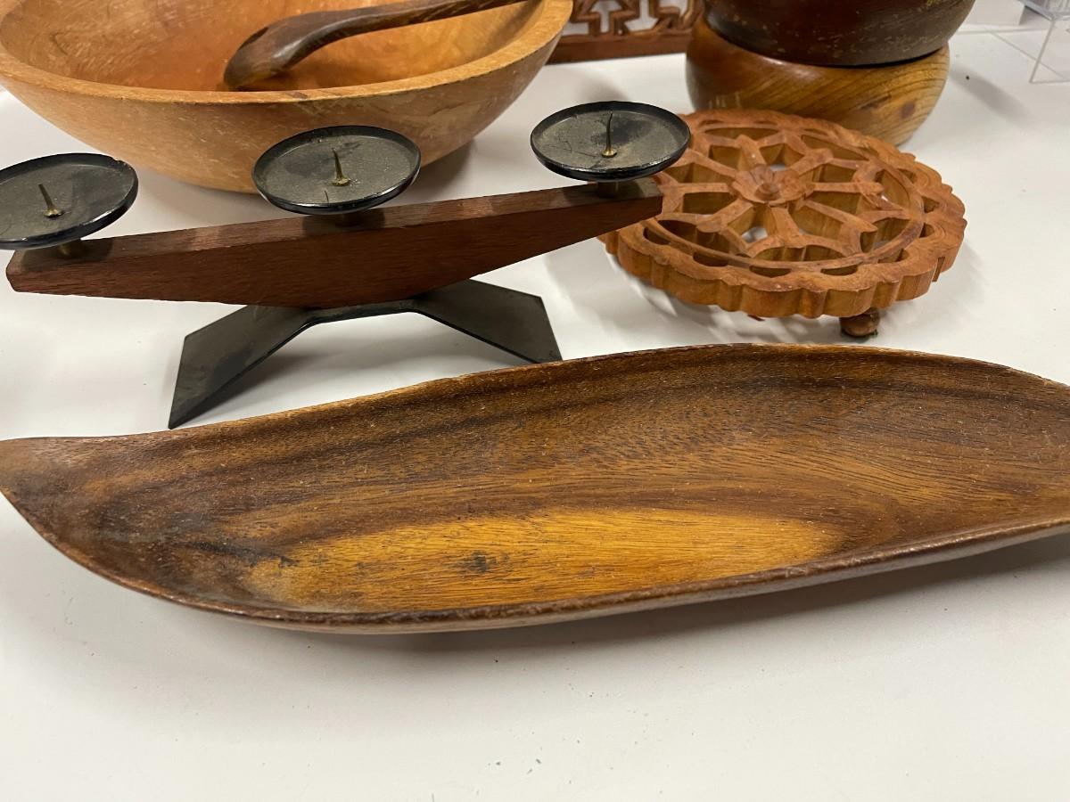 Please note that there is a matching serving spoon to the fork that didn't make it into the photos. Lot includes vintage dough bowl, two small salad bowls, vintage German modern candle holders, two wooden trivets, salad fork and spoon and oblong wooden dish.