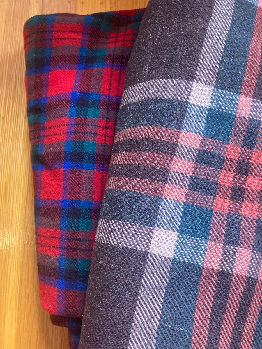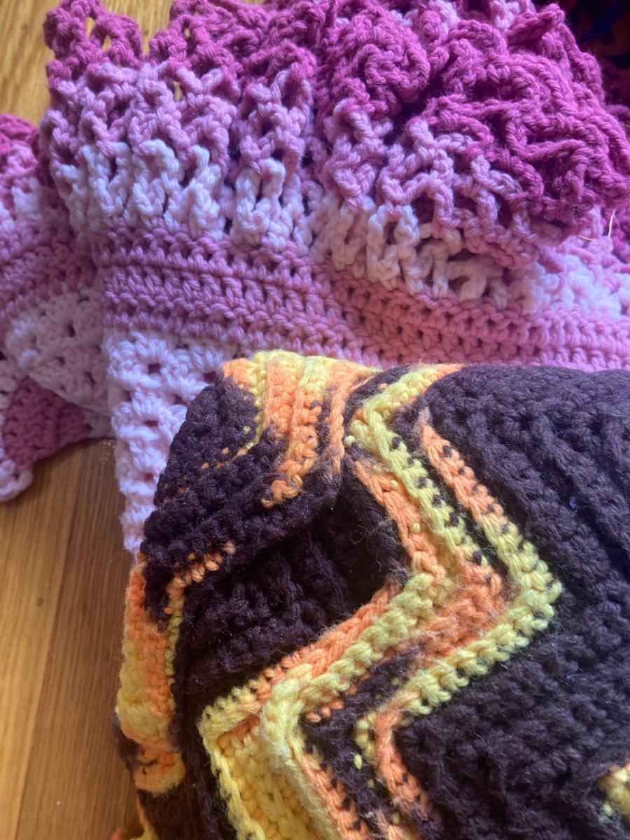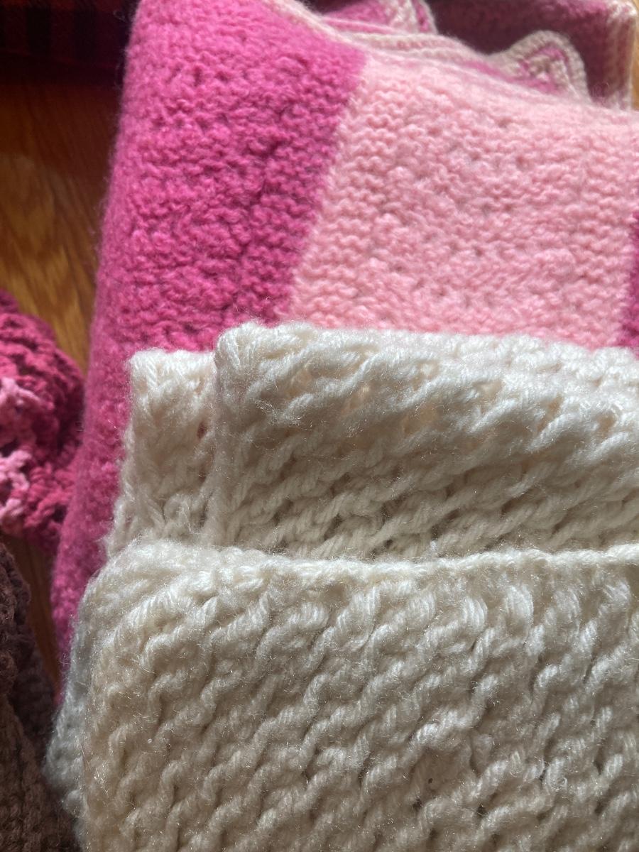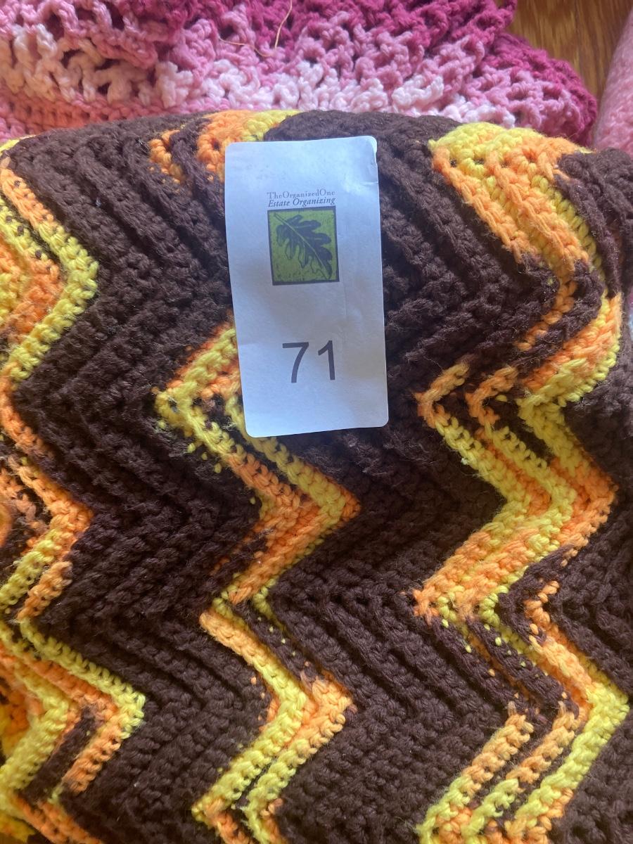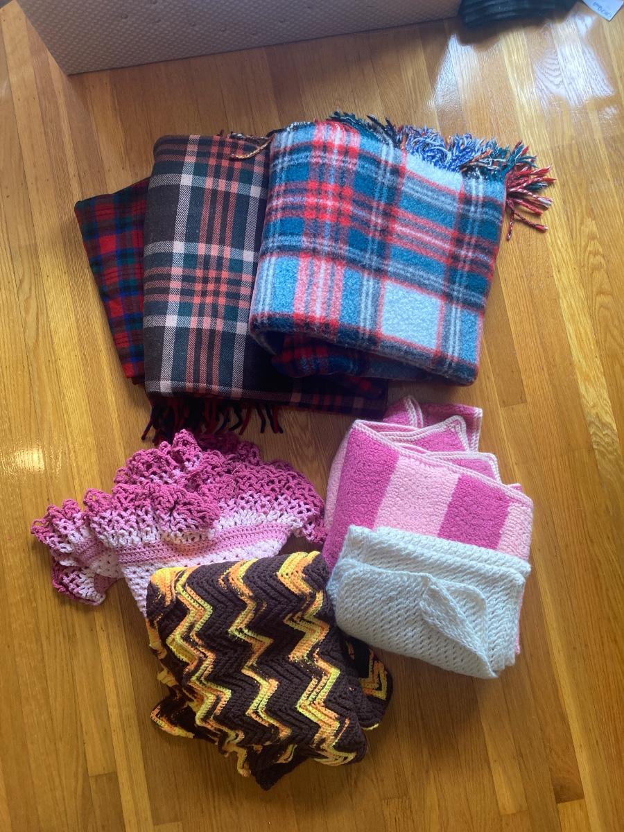 Lot contains 7 blanket/throws 4 vintage handmade knitted Afghan throws and 3 plaid. 2 Pendleton type wool and 1 fuzzy softer blanket.