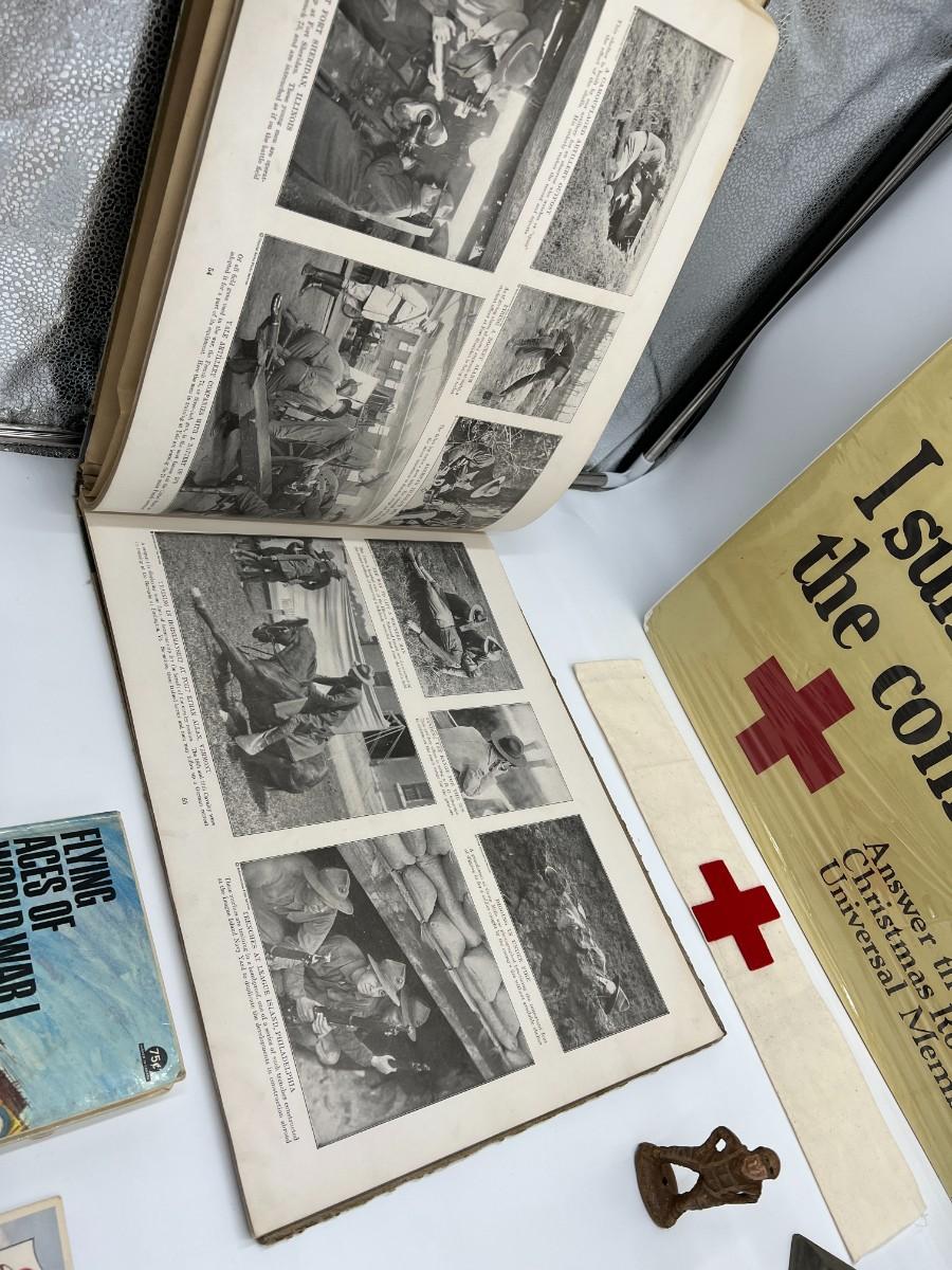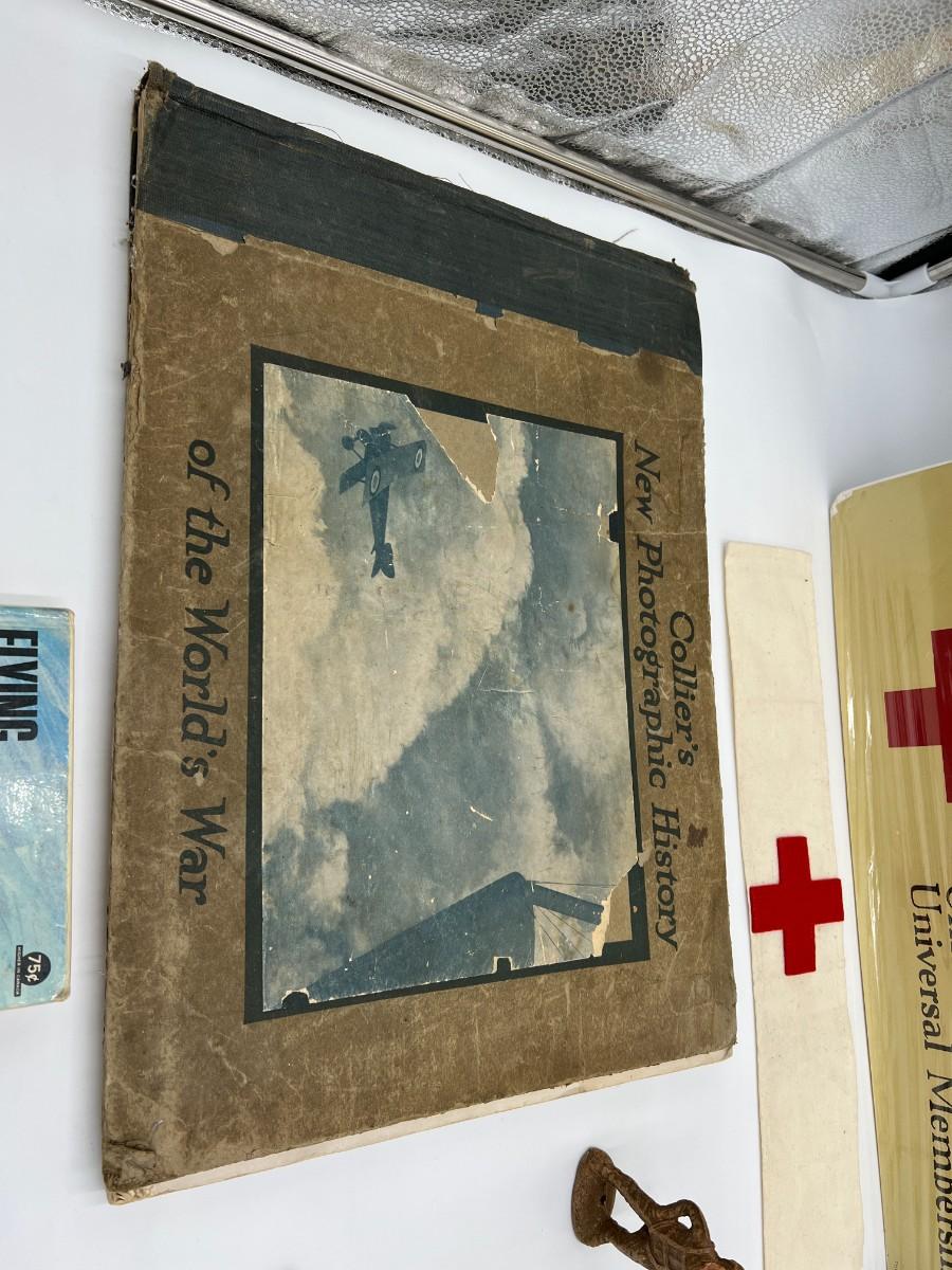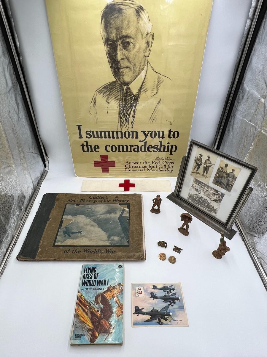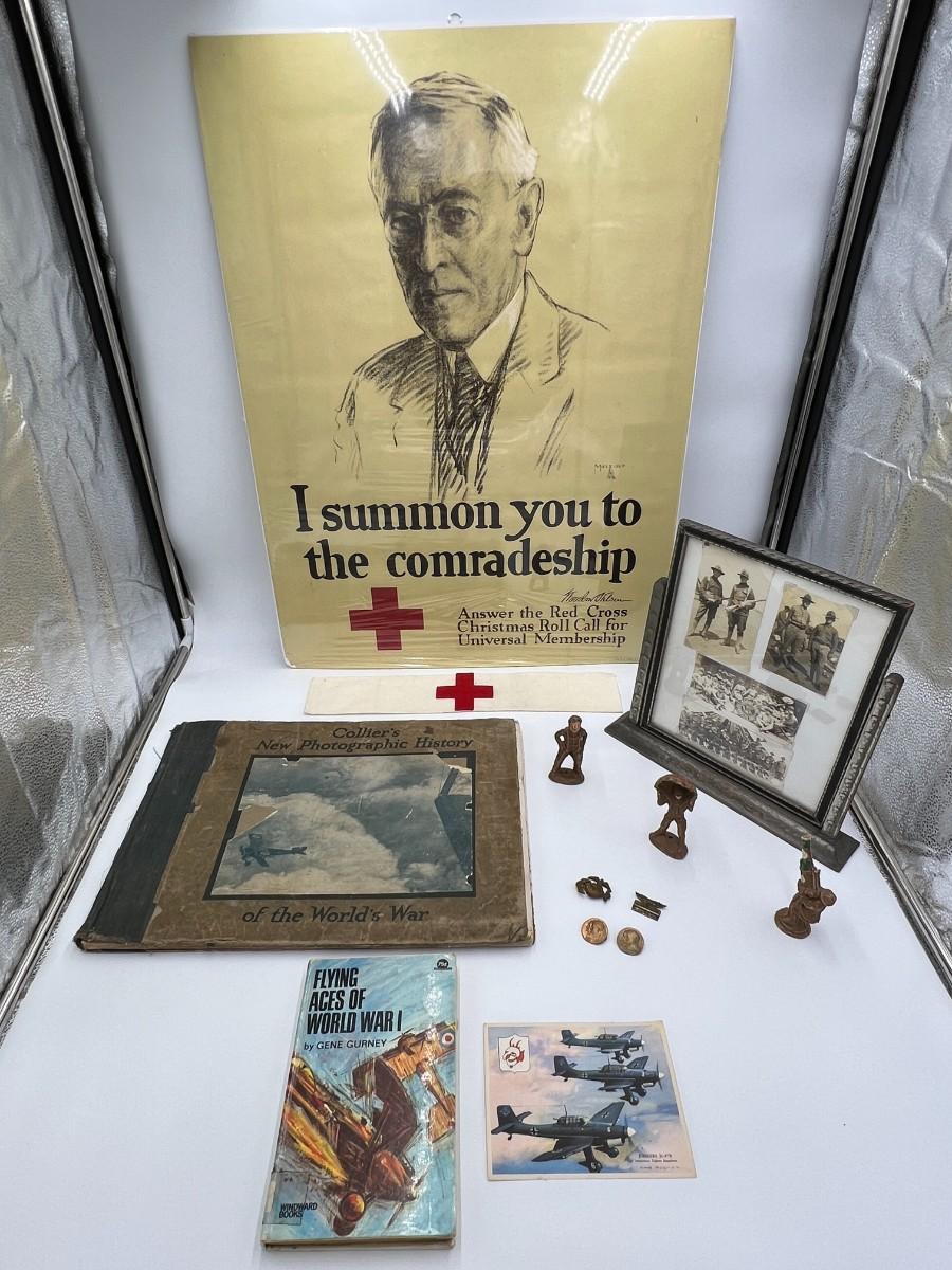 Lot of WW1 Red Cross Poster and Arm Band Pins and Ephemera. Includes WW1 Red Cross arm band (unsewn), 1918 Red Cross Framed Poster "I summon you to the comradeship". Marine Corp Paris, 3 Composition US Soldiers, Collier's New Photographic History of the World's War, Photos of WW1 soldiers, WW1 bronze and other pins, WW1 skyrods flying club lietenant captain badge, and Devil Dogs pin. Condition as shown.