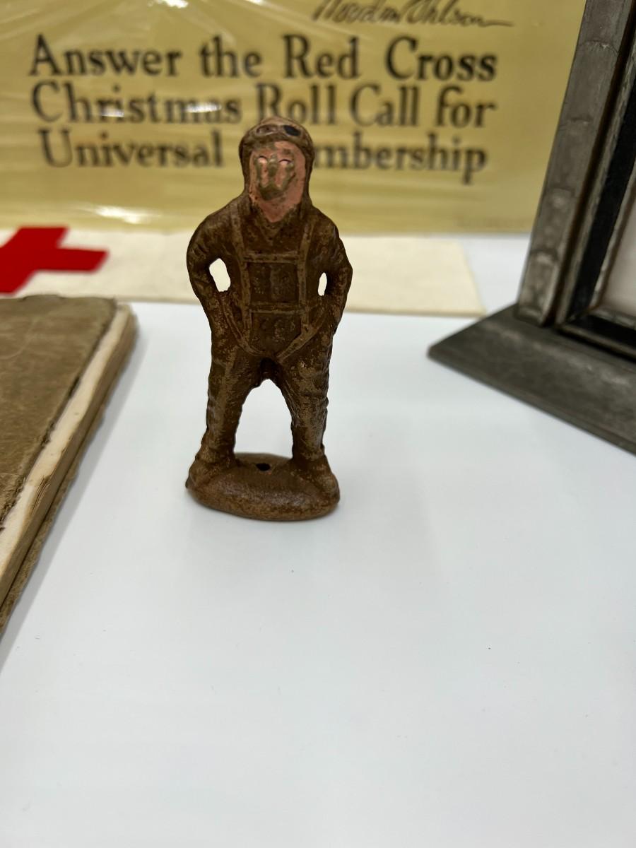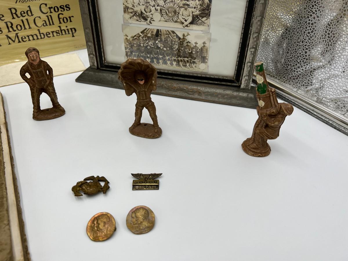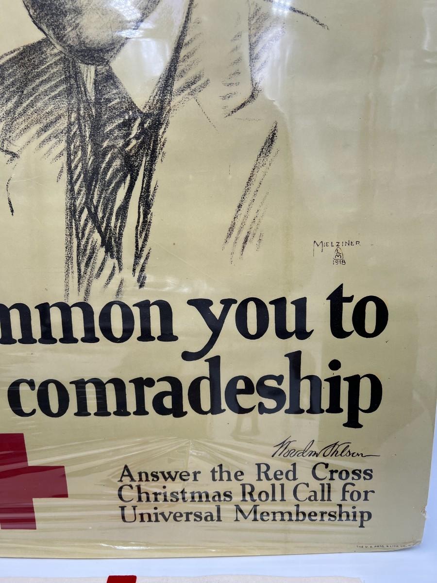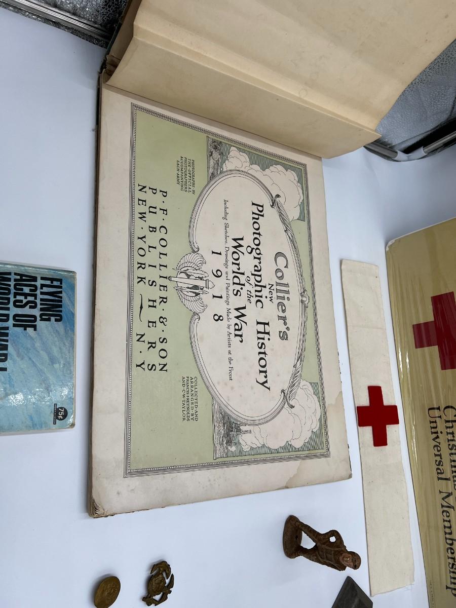 Lot of WW1 Red Cross Poster and Arm Band Pins and Ephemera. Includes WW1 Red Cross arm band (unsewn), 1918 Red Cross Framed Poster "I summon you to the comradeship". Marine Corp Paris, 3 Composition US Soldiers, Collier's New Photographic History of the World's War, Photos of WW1 soldiers, WW1 bronze and other pins, WW1 skyrods flying club lietenant captain badge, and Devil Dogs pin. Condition as shown.