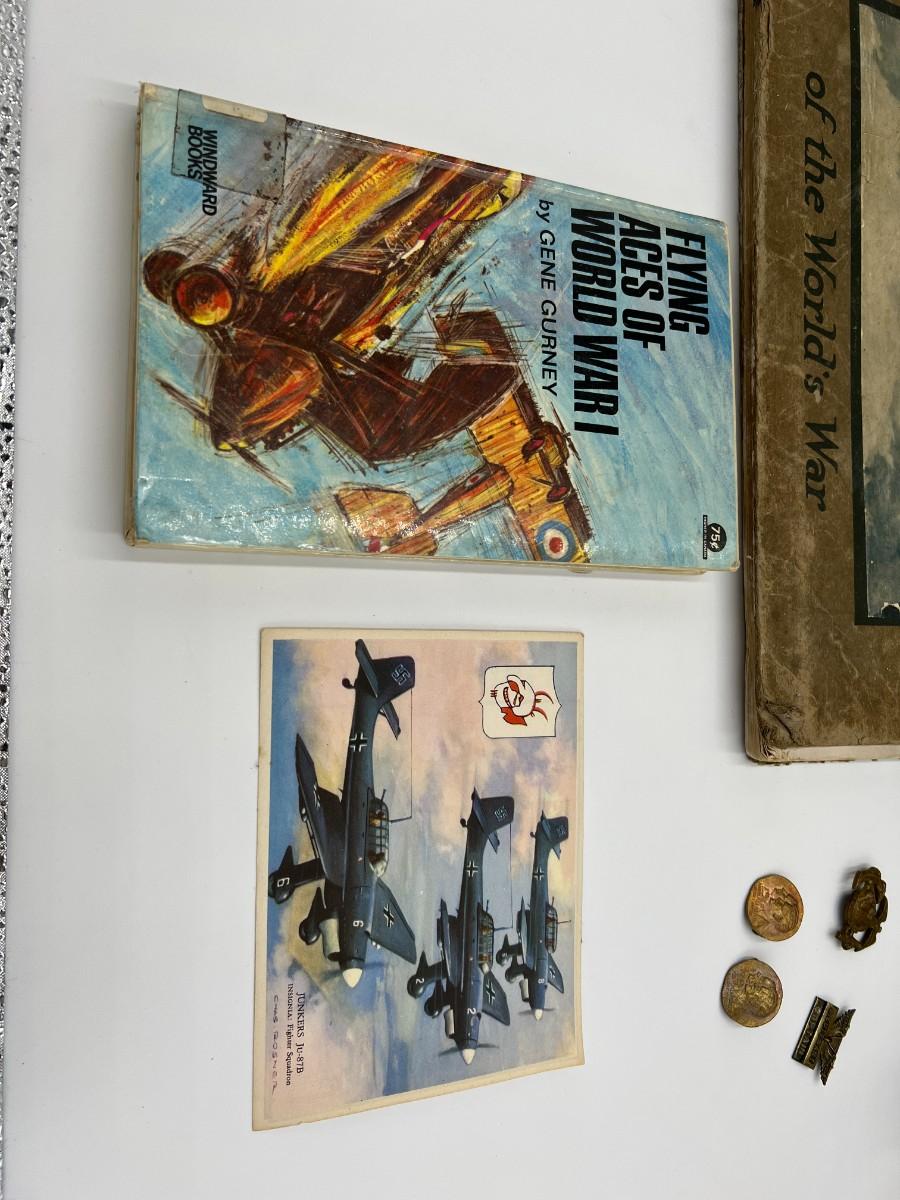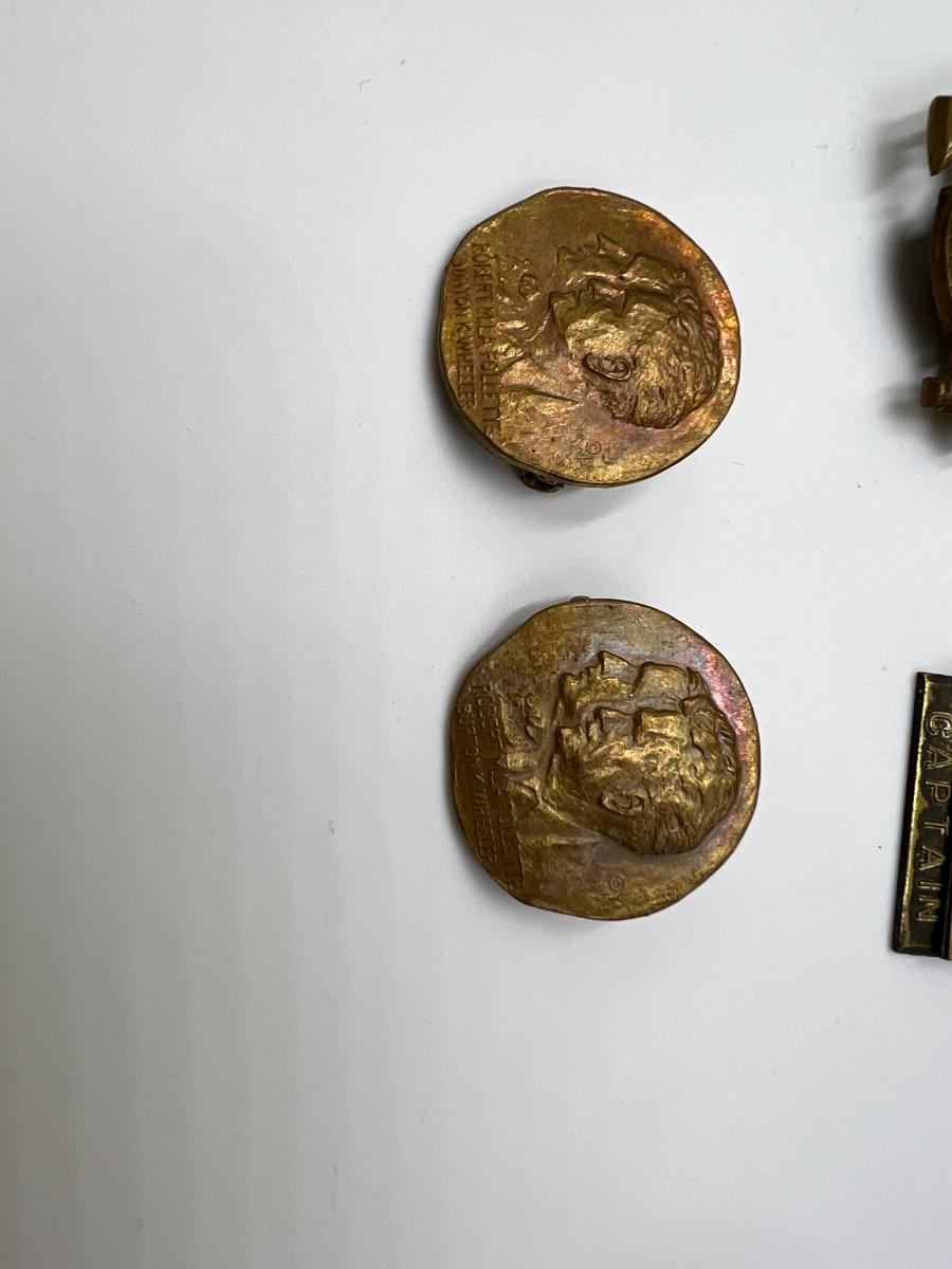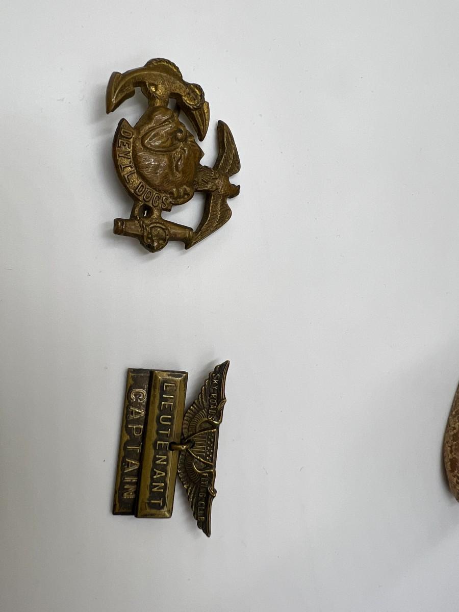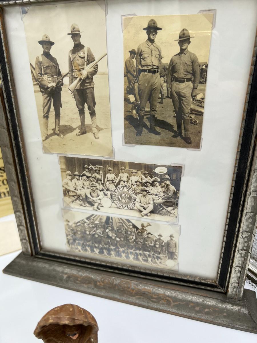 Lot of WW1 Red Cross Poster and Arm Band Pins and Ephemera. Includes WW1 Red Cross arm band (unsewn), 1918 Red Cross Framed Poster "I summon you to the comradeship". Marine Corp Paris, 3 Composition US Soldiers, Collier's New Photographic History of the World's War, Photos of WW1 soldiers, WW1 bronze and other pins, WW1 skyrods flying club lietenant captain badge, and Devil Dogs pin. Condition as shown.