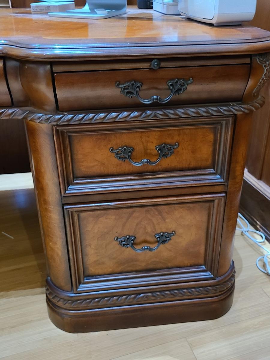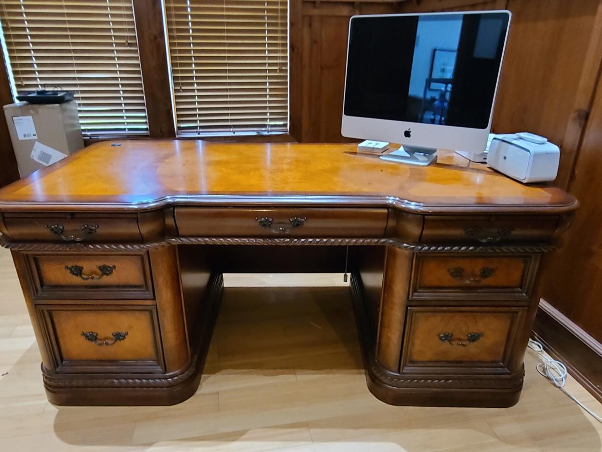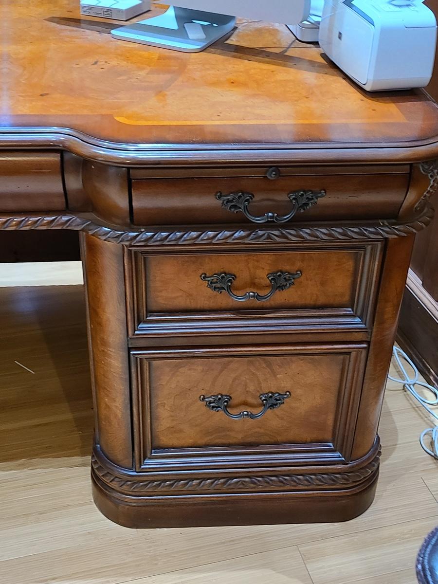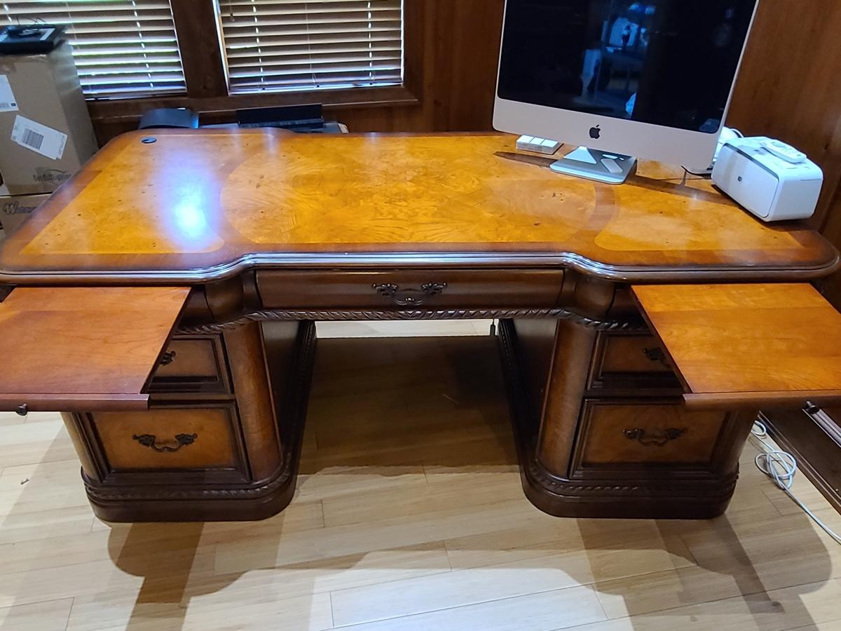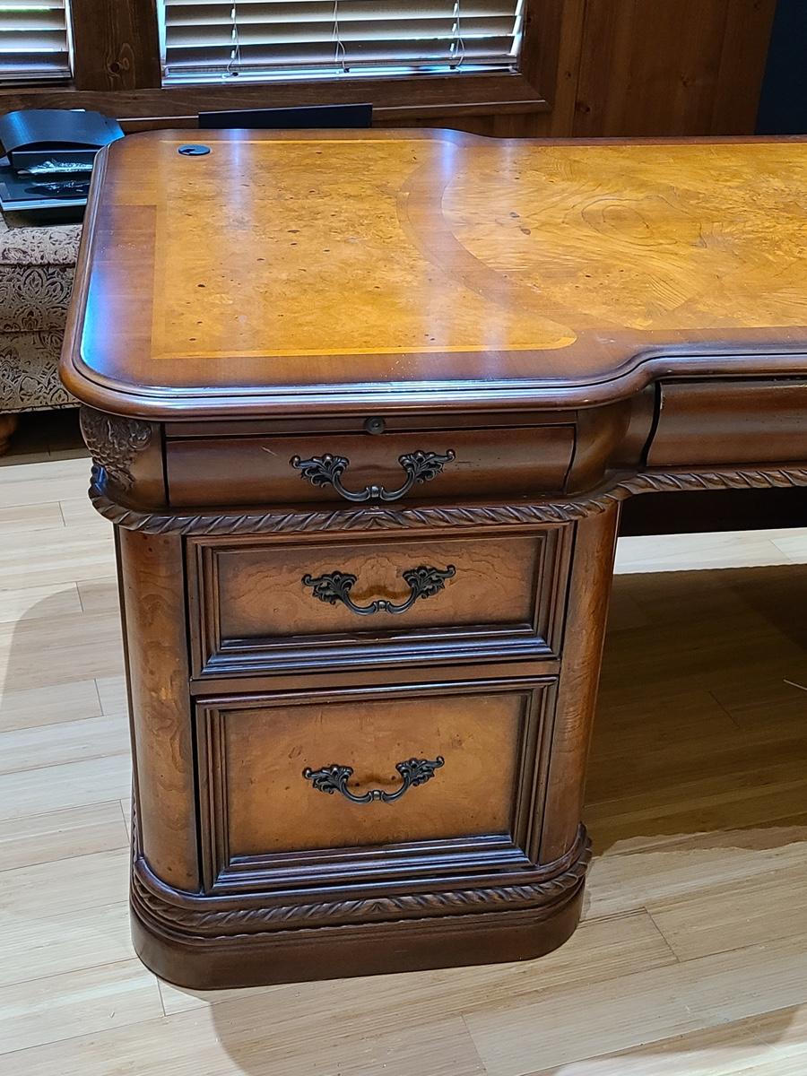 Offers Accepted 72x37x31 inches tall. This amazing desk features a traditional old world feel but with modern upgrades including a slide out work drawer on either side of the desk, including a slide out desk for guests on exterior of desk, grommet holes with caps for neat wiring, file drawers and pull-out keyboard storage. This desk has rounded corners with rope motif case moulding and grape leaf wood at corners. Perfect for home or office. COMPUTER NOT INCLUDED. This is functional and stylish! Please see all pictures as they are the best representation of the items. The pictures show condition, measurements if taken, and what is included in the lot. Due to the large amount that we photograph and the time frame, we are not always able to take measurements. All items unless noted, are pre-owned and have been used. If you purchased furniture, you must bring help. We do not allow one person to carry large furniture out on their own. Bring help, tools and a truck for the safety of our clients homes, and your personal safety. Company policy.