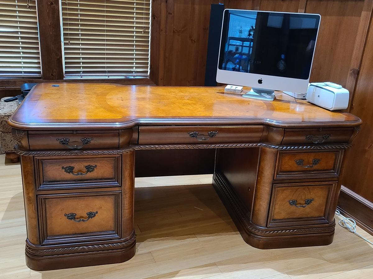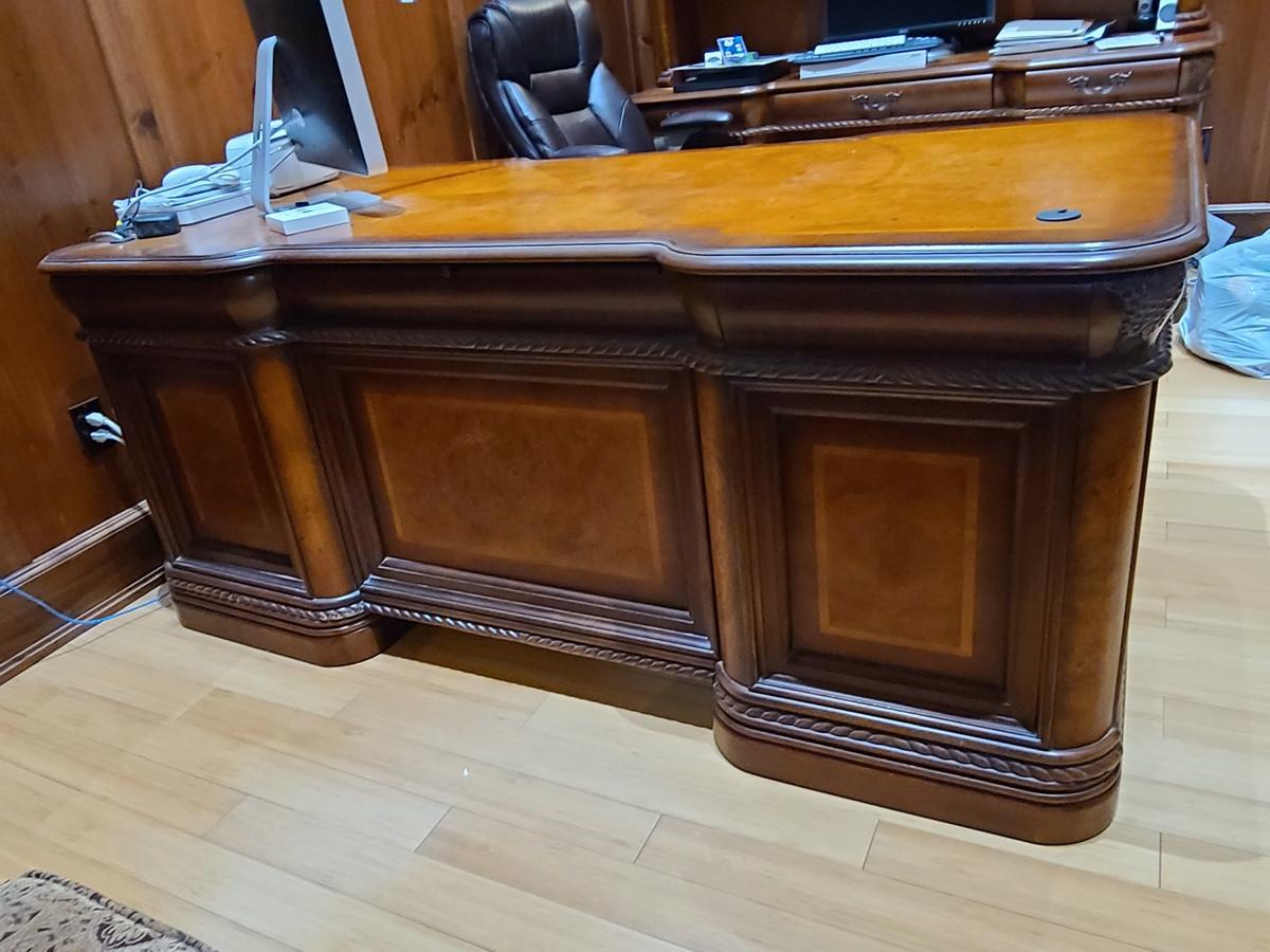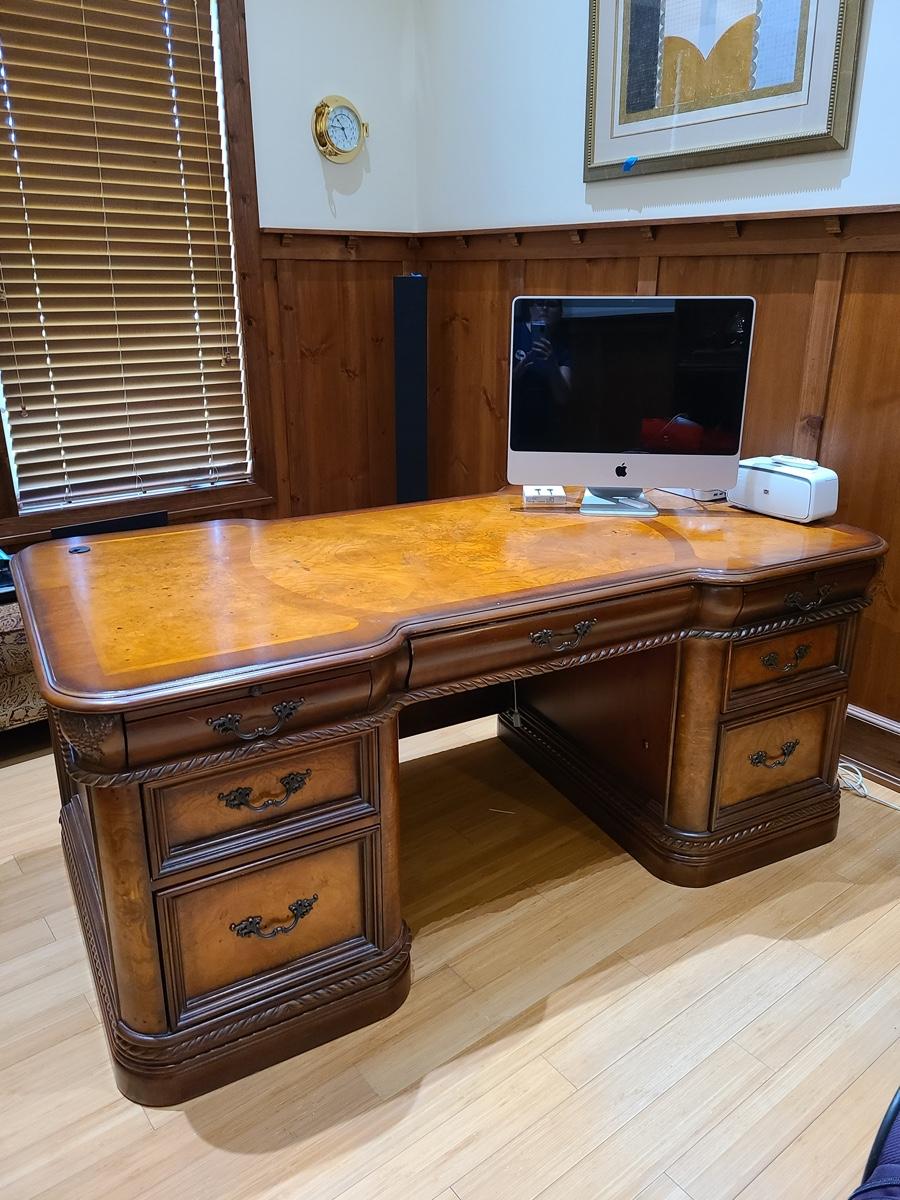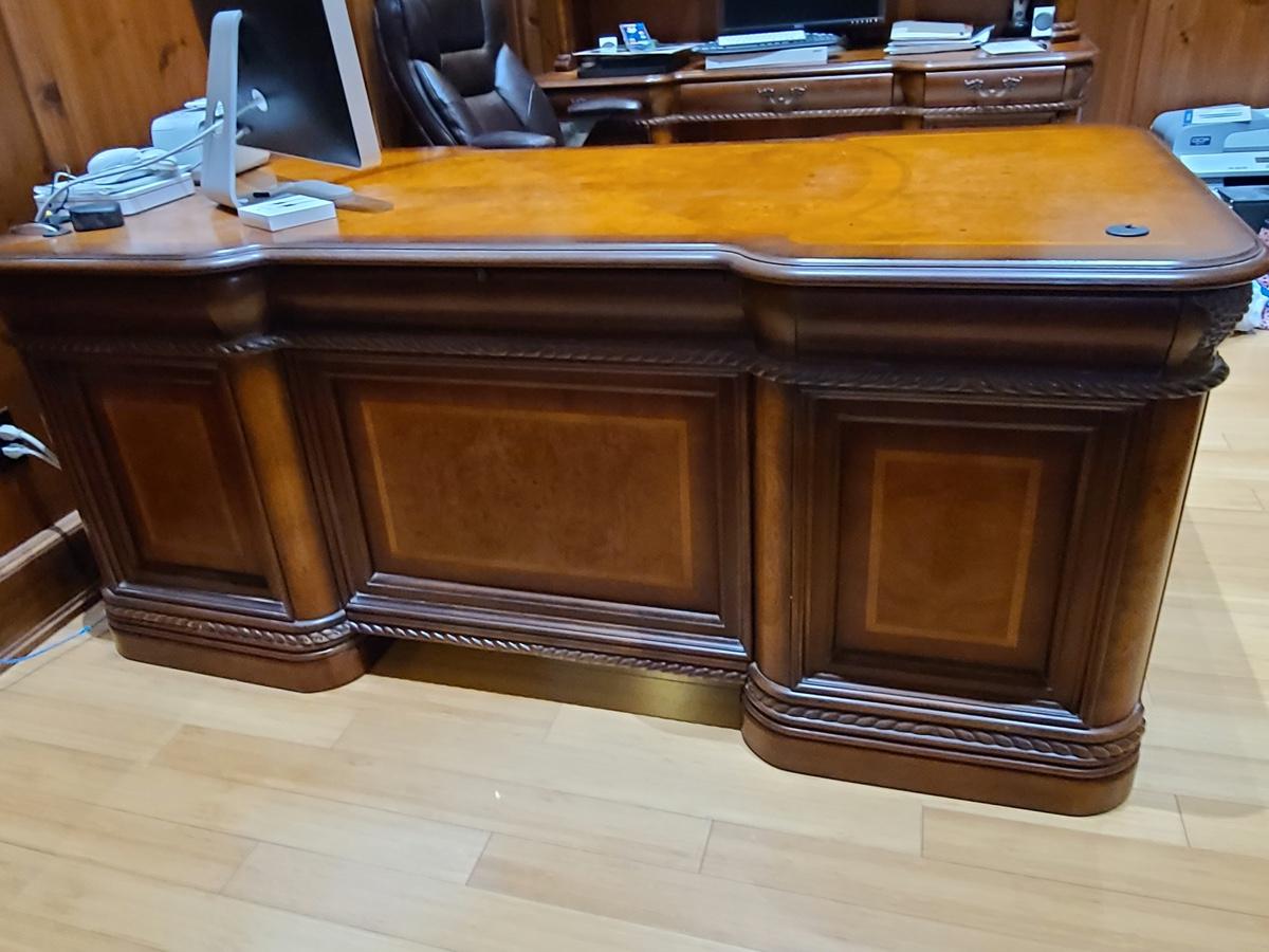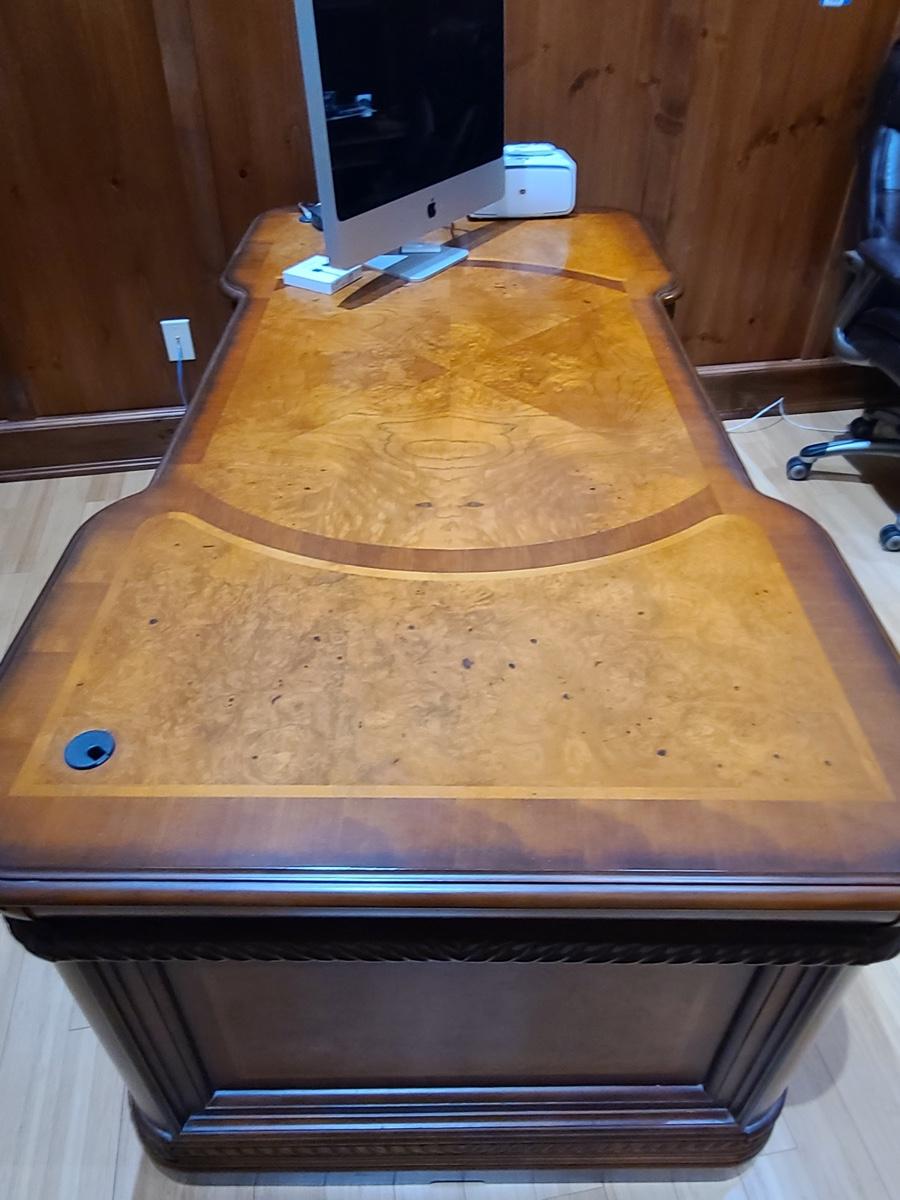 Offers Accepted 72x37x31 inches tall. This amazing desk features a traditional old world feel but with modern upgrades including a slide out work drawer on either side of the desk, including a slide out desk for guests on exterior of desk, grommet holes with caps for neat wiring, file drawers and pull-out keyboard storage. This desk has rounded corners with rope motif case moulding and grape leaf wood at corners. Perfect for home or office. COMPUTER NOT INCLUDED. This is functional and stylish! Please see all pictures as they are the best representation of the items. The pictures show condition, measurements if taken, and what is included in the lot. Due to the large amount that we photograph and the time frame, we are not always able to take measurements. All items unless noted, are pre-owned and have been used. If you purchased furniture, you must bring help. We do not allow one person to carry large furniture out on their own. Bring help, tools and a truck for the safety of our clients homes, and your personal safety. Company policy.