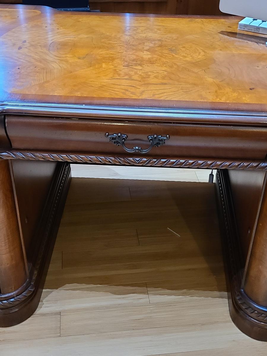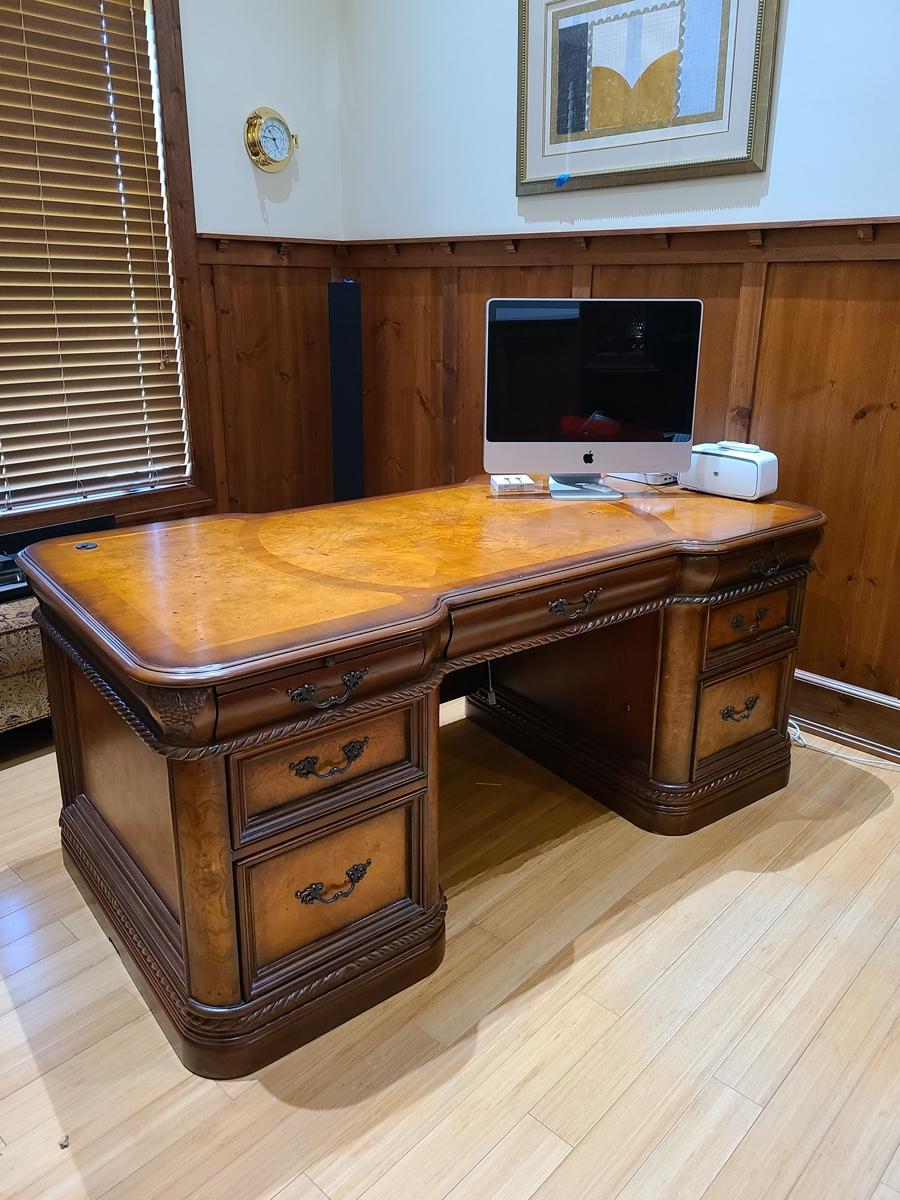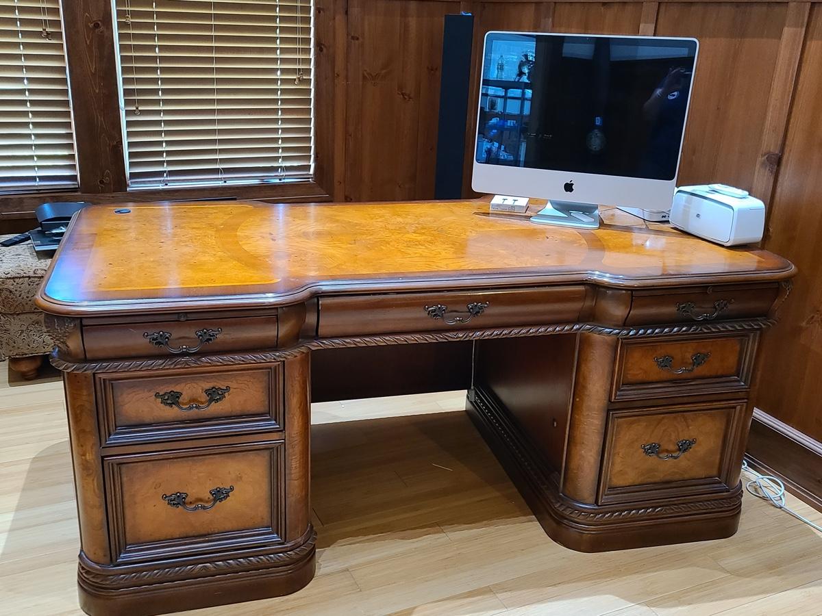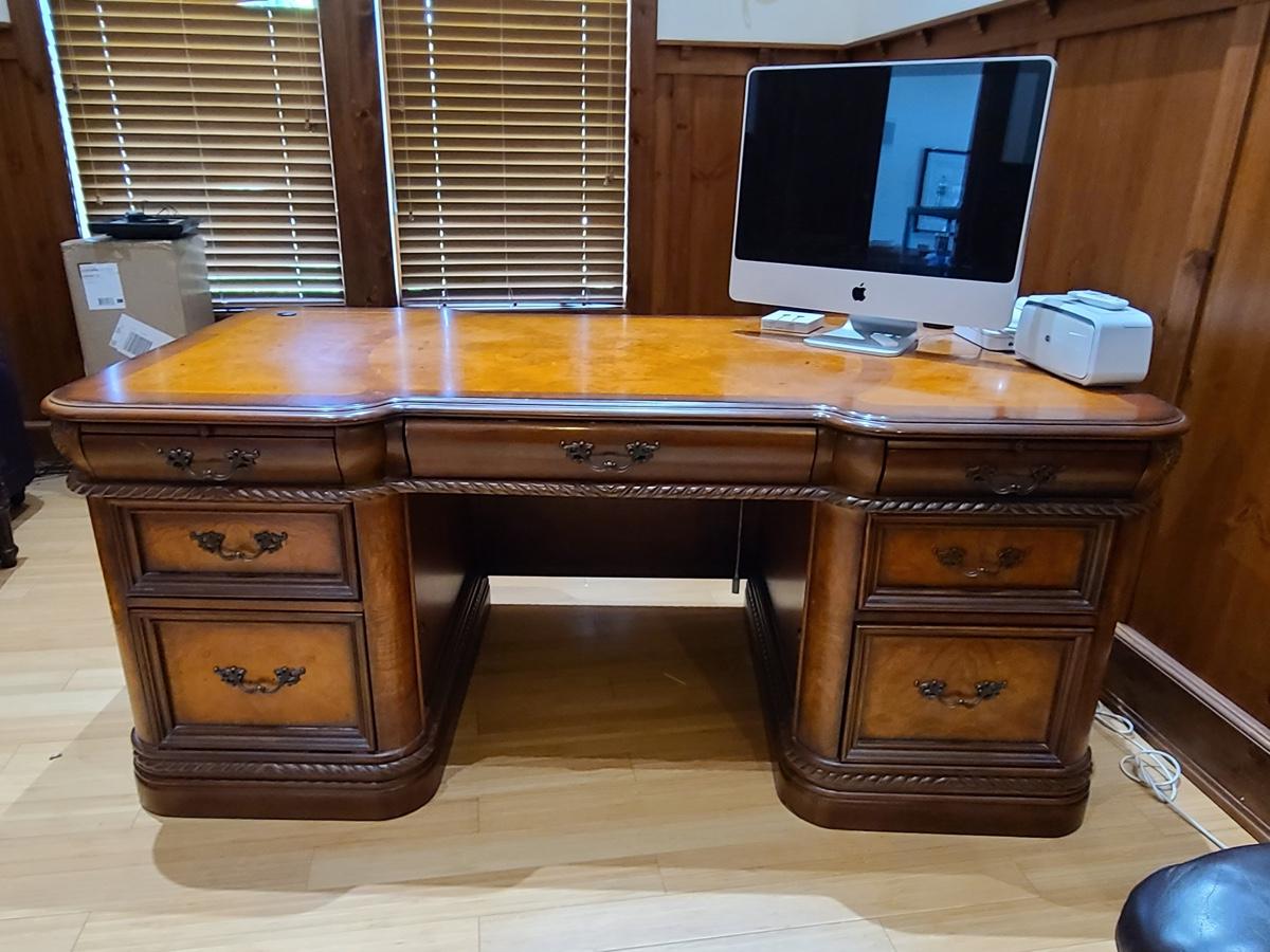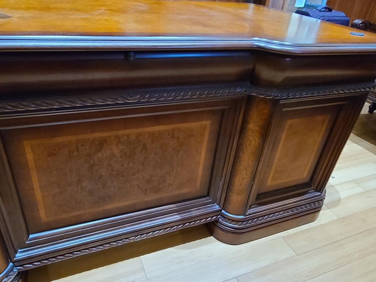 Offers Accepted 72x37x31 inches tall. This amazing desk features a traditional old world feel but with modern upgrades including a slide out work drawer on either side of the desk, including a slide out desk for guests on exterior of desk, grommet holes with caps for neat wiring, file drawers and pull-out keyboard storage. This desk has rounded corners with rope motif case moulding and grape leaf wood at corners. Perfect for home or office. COMPUTER NOT INCLUDED. This is functional and stylish! Please see all pictures as they are the best representation of the items. The pictures show condition, measurements if taken, and what is included in the lot. Due to the large amount that we photograph and the time frame, we are not always able to take measurements. All items unless noted, are pre-owned and have been used. If you purchased furniture, you must bring help. We do not allow one person to carry large furniture out on their own. Bring help, tools and a truck for the safety of our clients homes, and your personal safety. Company policy.
