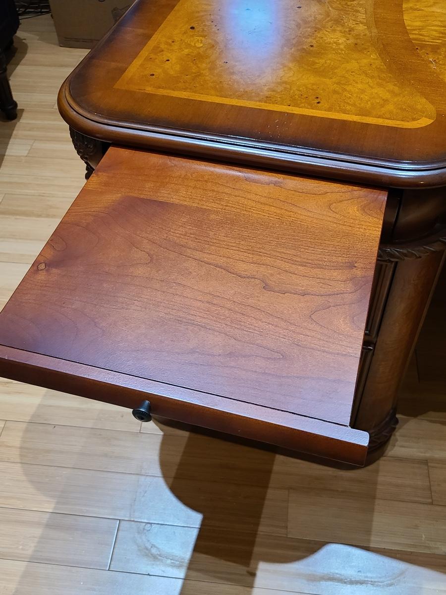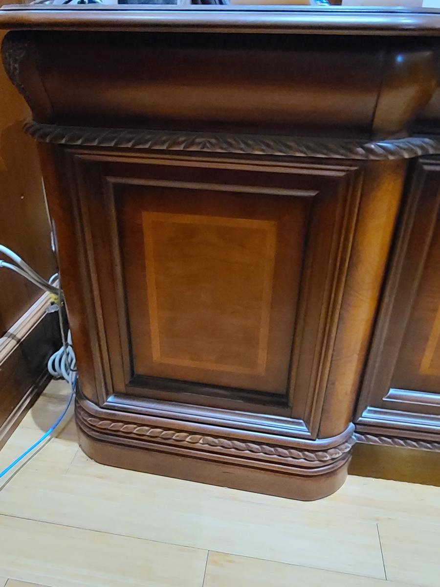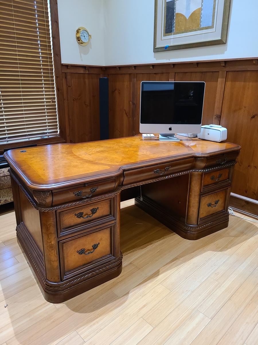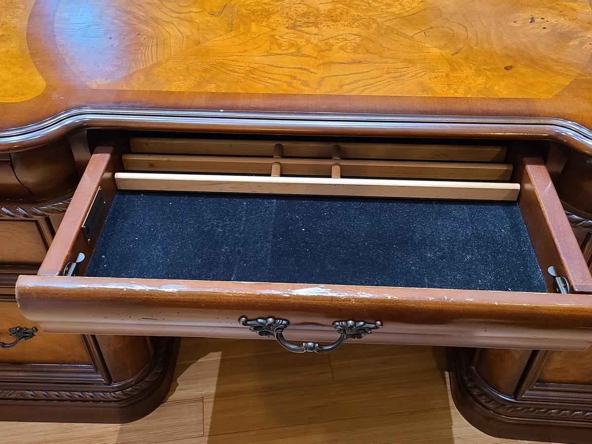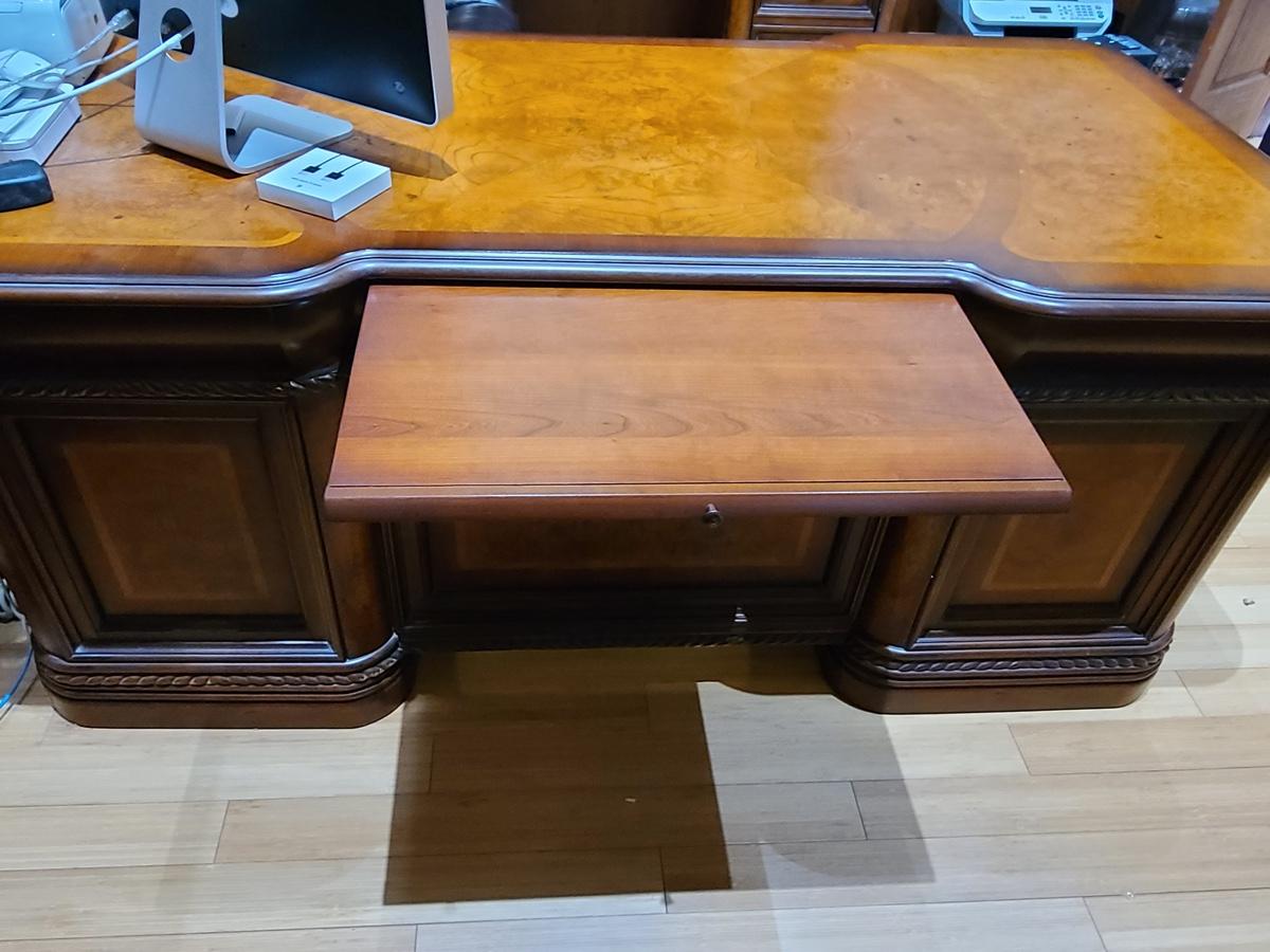 Offers Accepted 72x37x31 inches tall. This amazing desk features a traditional old world feel but with modern upgrades including a slide out work drawer on either side of the desk, including a slide out desk for guests on exterior of desk, grommet holes with caps for neat wiring, file drawers and pull-out keyboard storage. This desk has rounded corners with rope motif case moulding and grape leaf wood at corners. Perfect for home or office. COMPUTER NOT INCLUDED. This is functional and stylish! Please see all pictures as they are the best representation of the items. The pictures show condition, measurements if taken, and what is included in the lot. Due to the large amount that we photograph and the time frame, we are not always able to take measurements. All items unless noted, are pre-owned and have been used. If you purchased furniture, you must bring help. We do not allow one person to carry large furniture out on their own. Bring help, tools and a truck for the safety of our clients homes, and your personal safety. Company policy.
