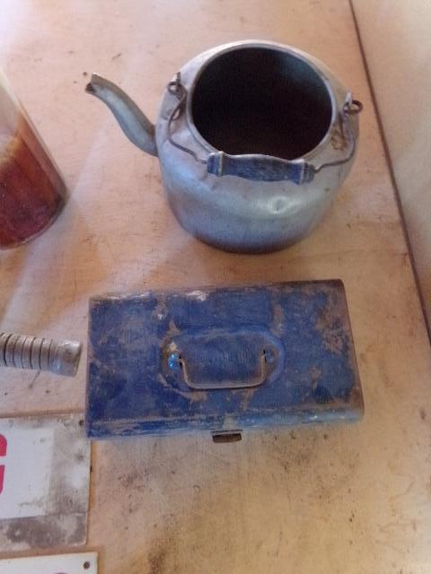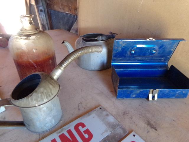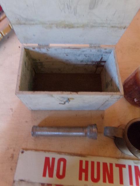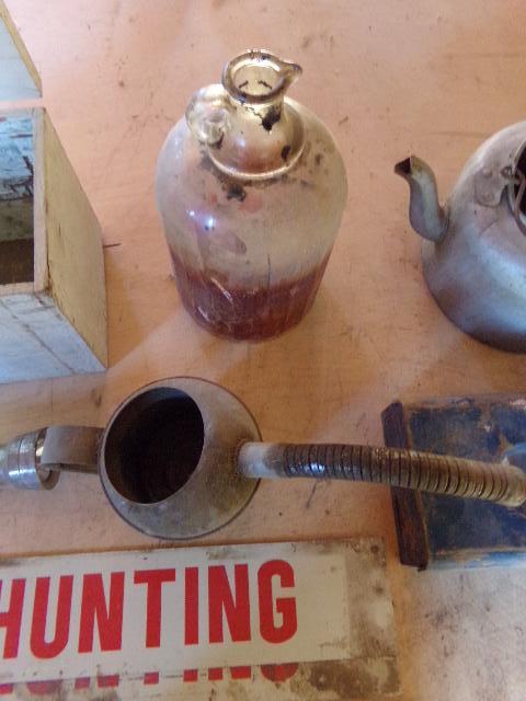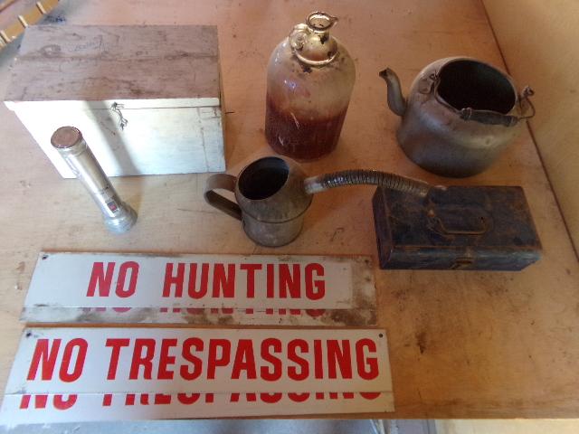 OIL CAN SPOUT, 2 NO HUNTING SIGNS AND 2 NO TRESPASSING SIGNS, A WOODEN BOX, METAL BOX, AND GLASS JUG.