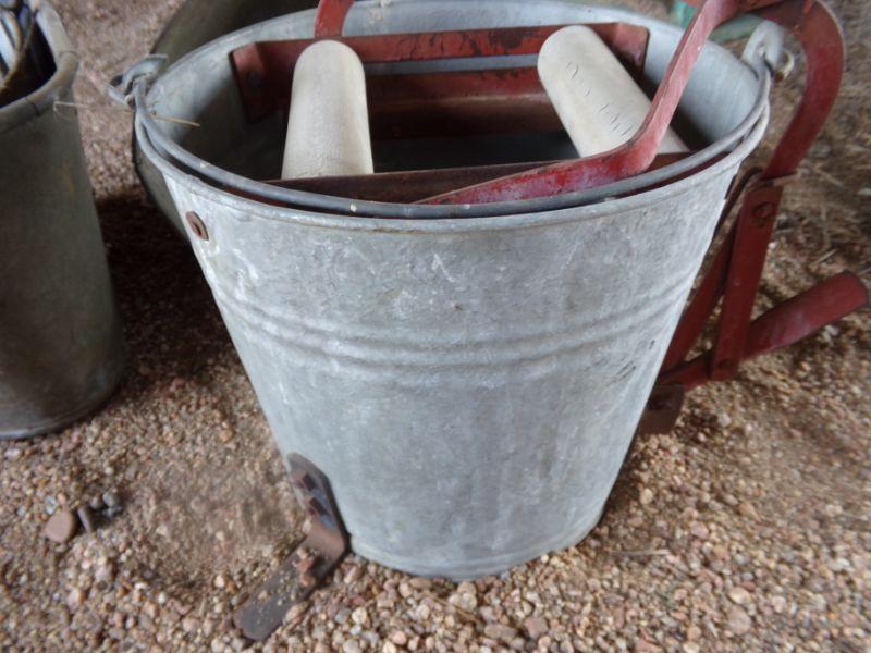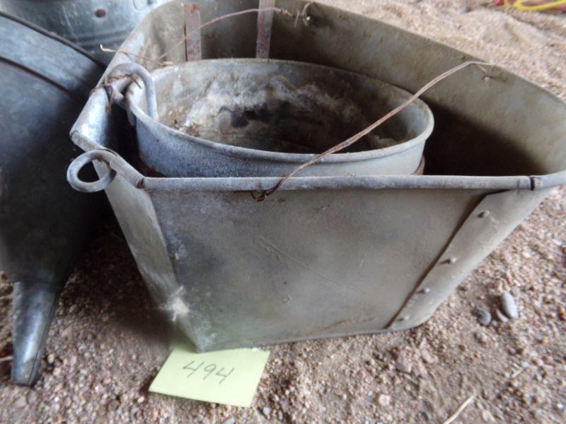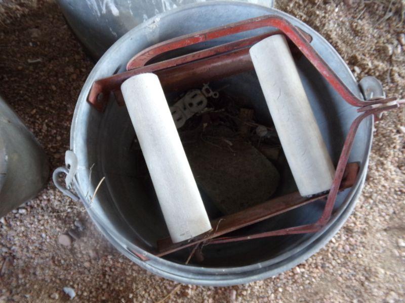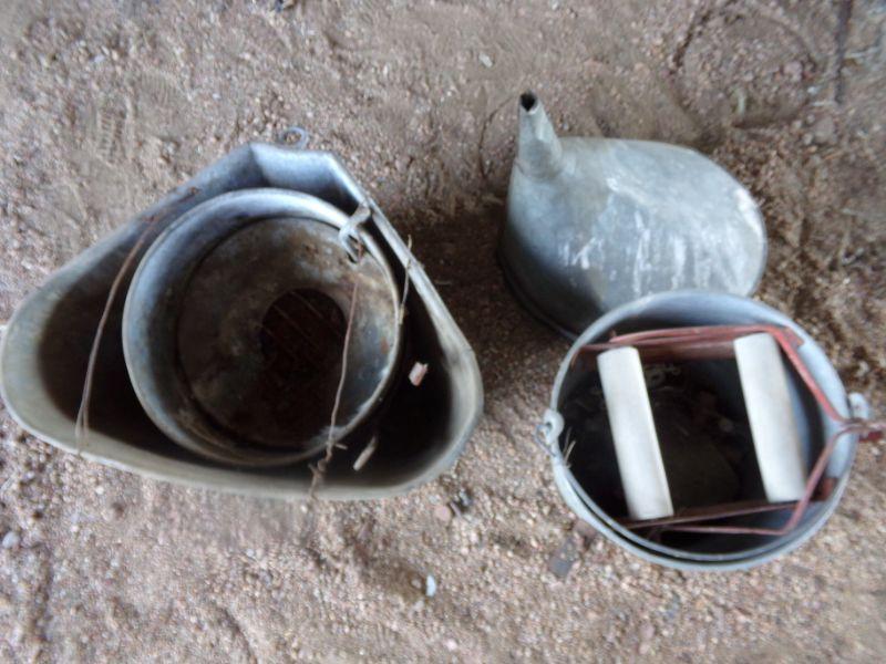 OIL FUNNEL AND 2 PAILS. ONE LOOKS TO HAVE A WRINGER.