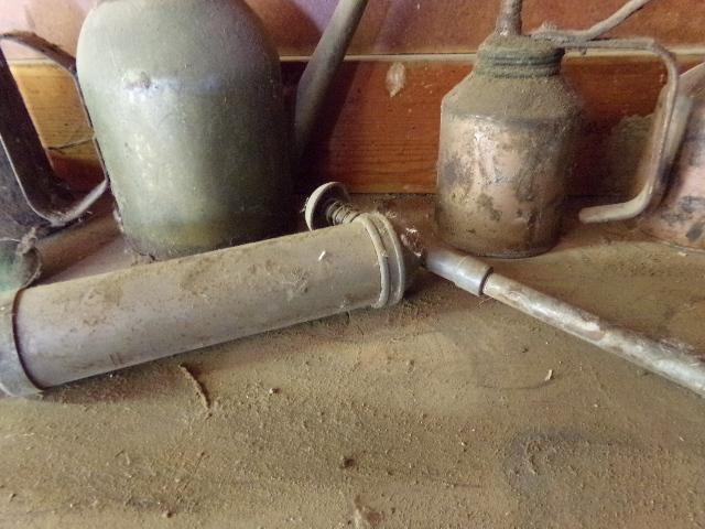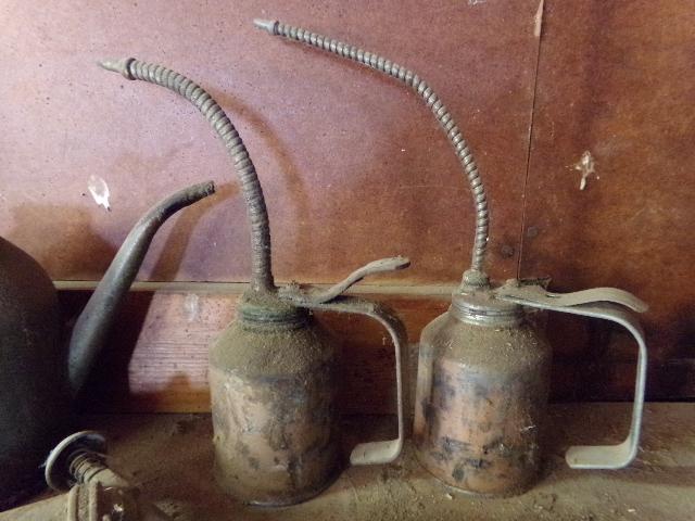 SEVERAL OIL CANS AND A GREASE GUN.