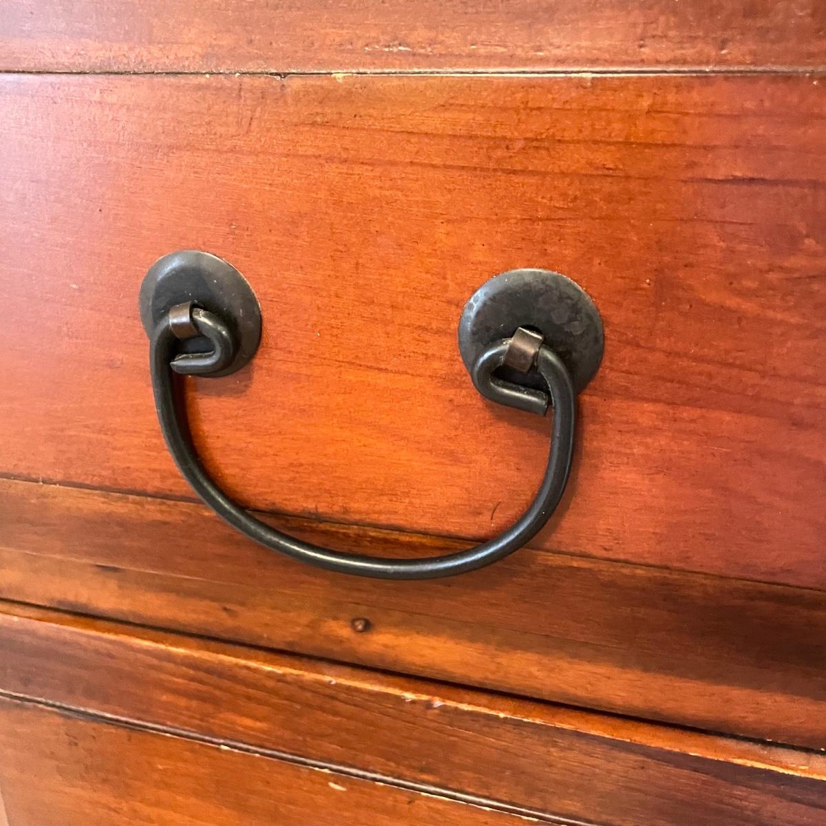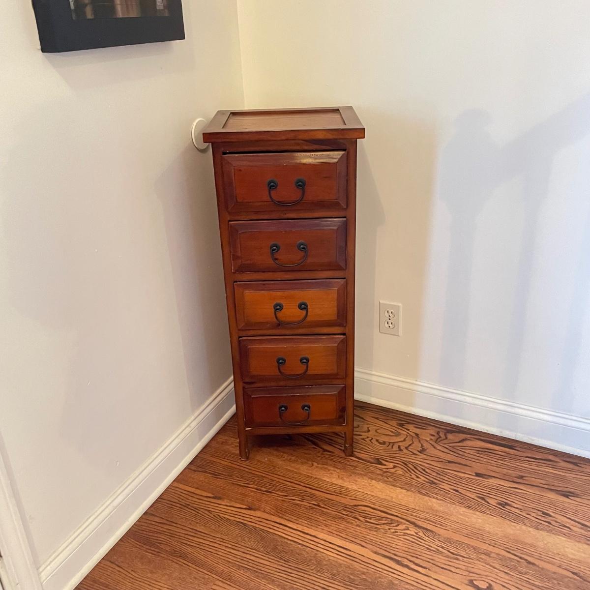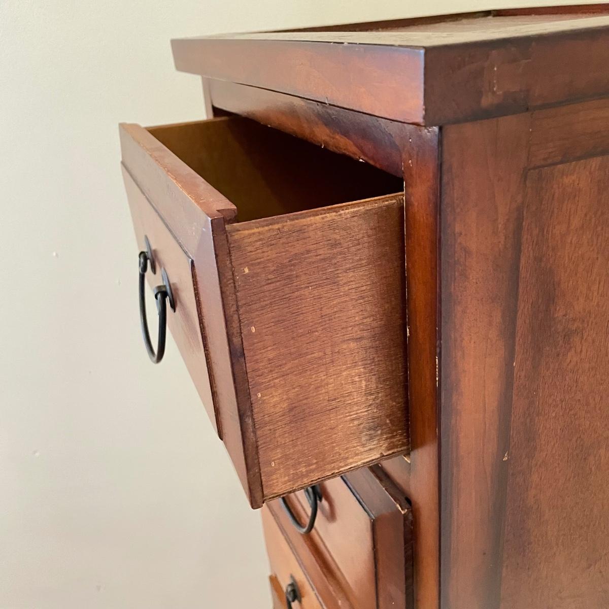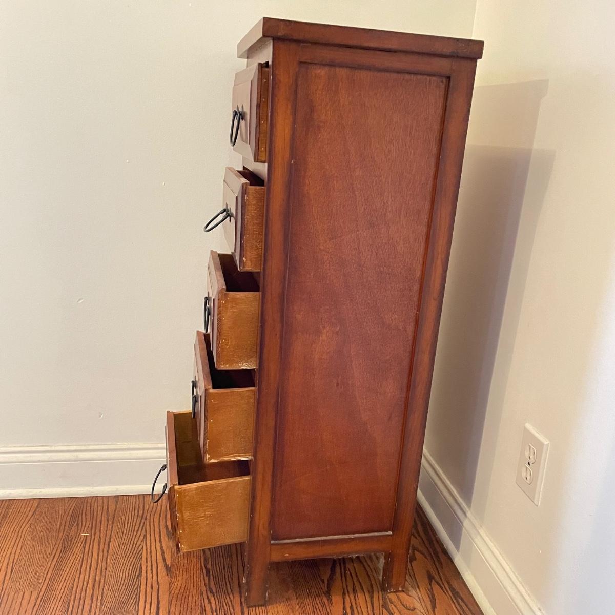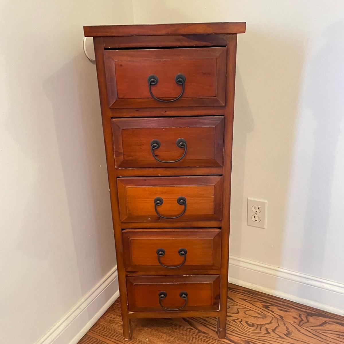 Petite five drawer dresser with metal pulls. Piece is perfect for small spaces, measuring 14.5” x 12.5” x 38”H. There are surface blemishes, examples noted in photos. Piece appears to have a solid wood frame with tops and sides made of plywood. See images. Local pick up only.