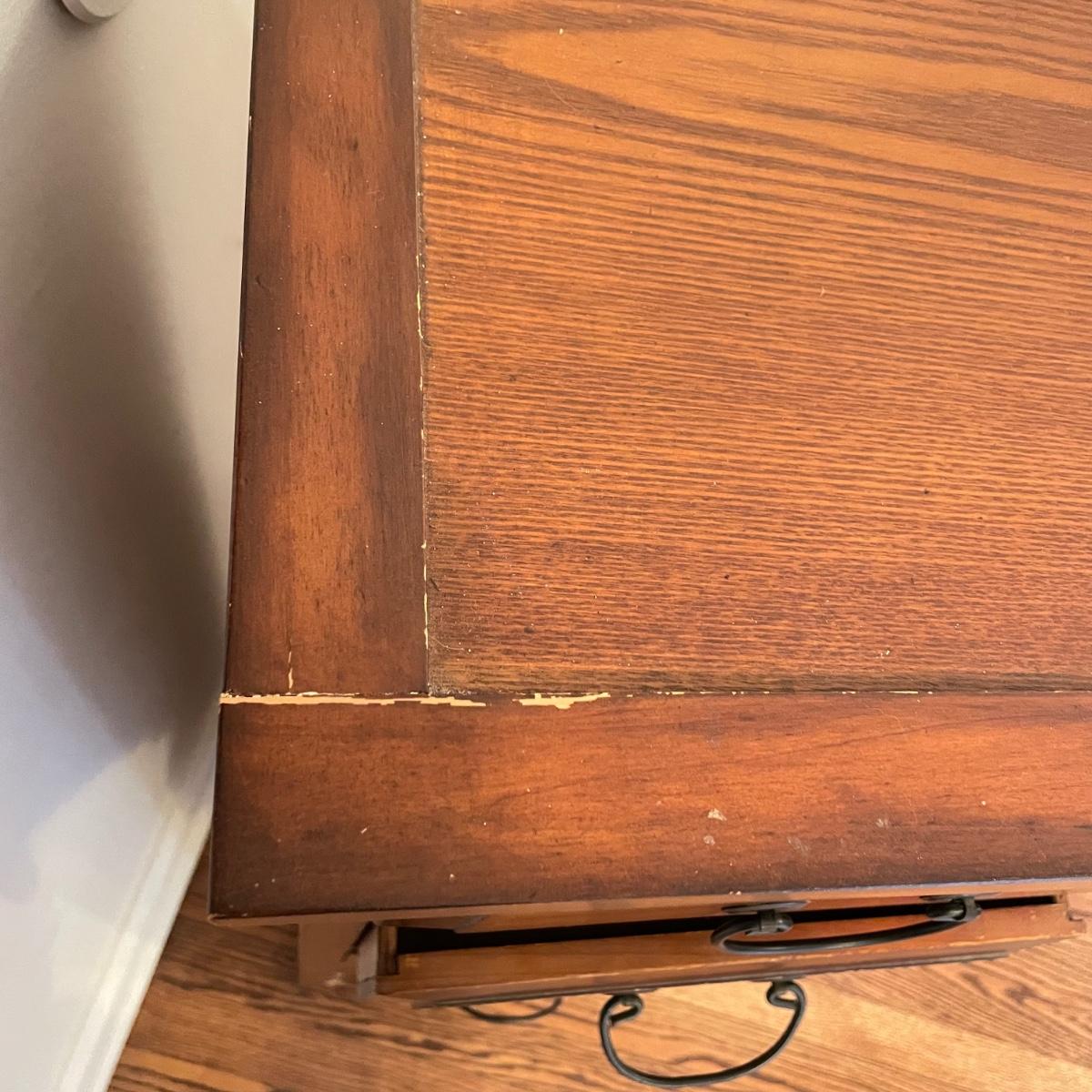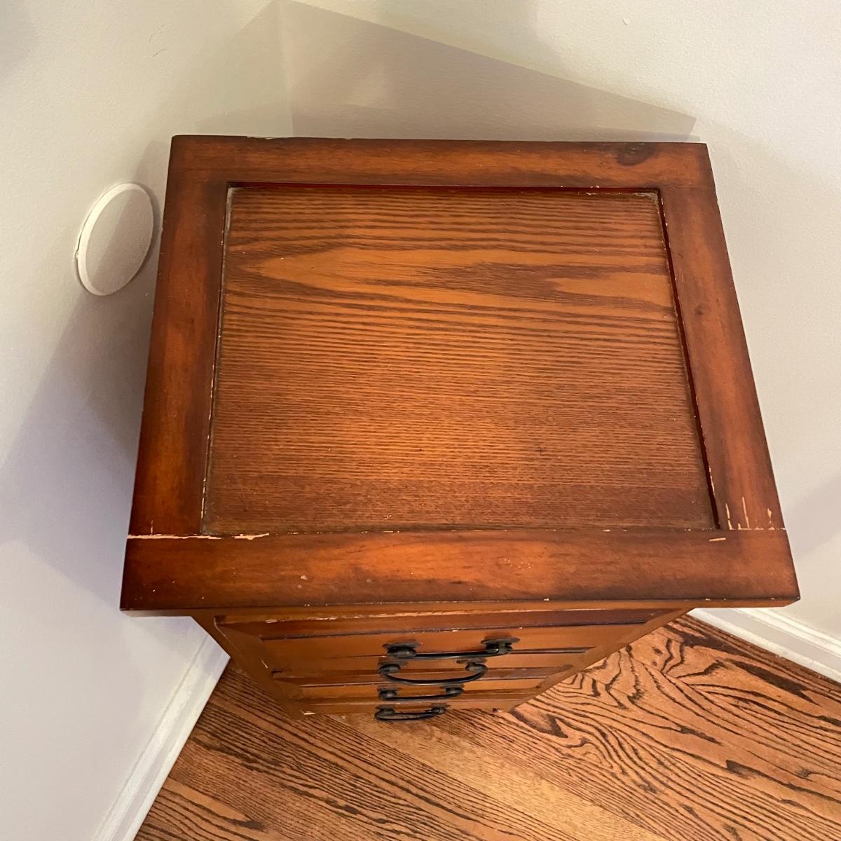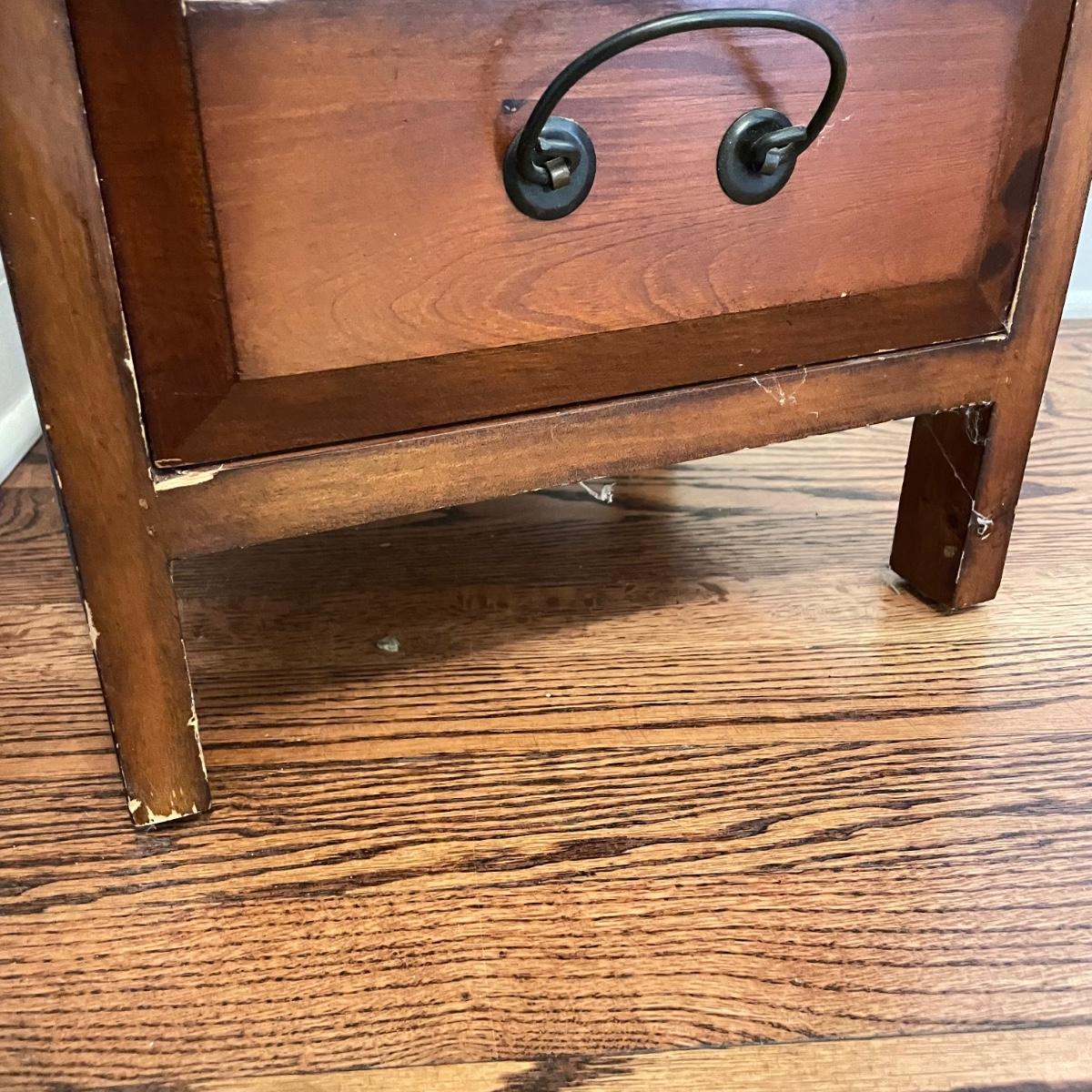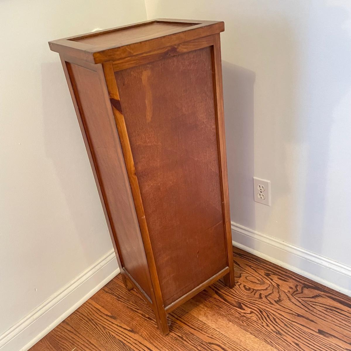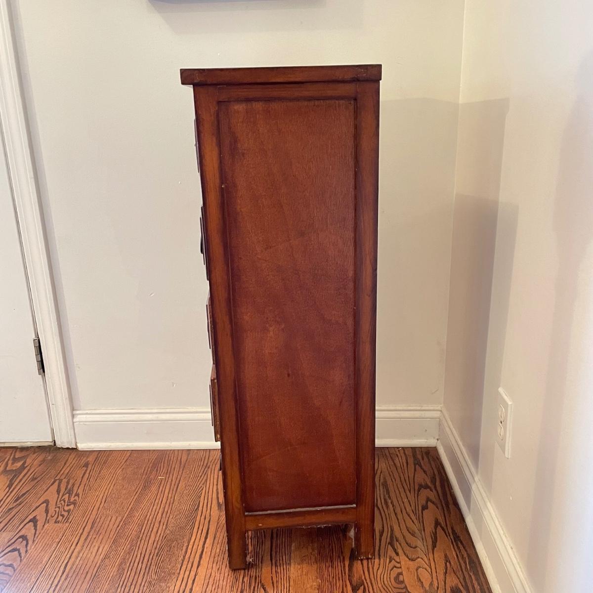Petite five drawer dresser with metal pulls. Piece is perfect for small spaces, measuring 14.5” x 12.5” x 38”H. There are surface blemishes, examples noted in photos. Piece appears to have a solid wood frame with tops and sides made of plywood. See images. Local pick up only.